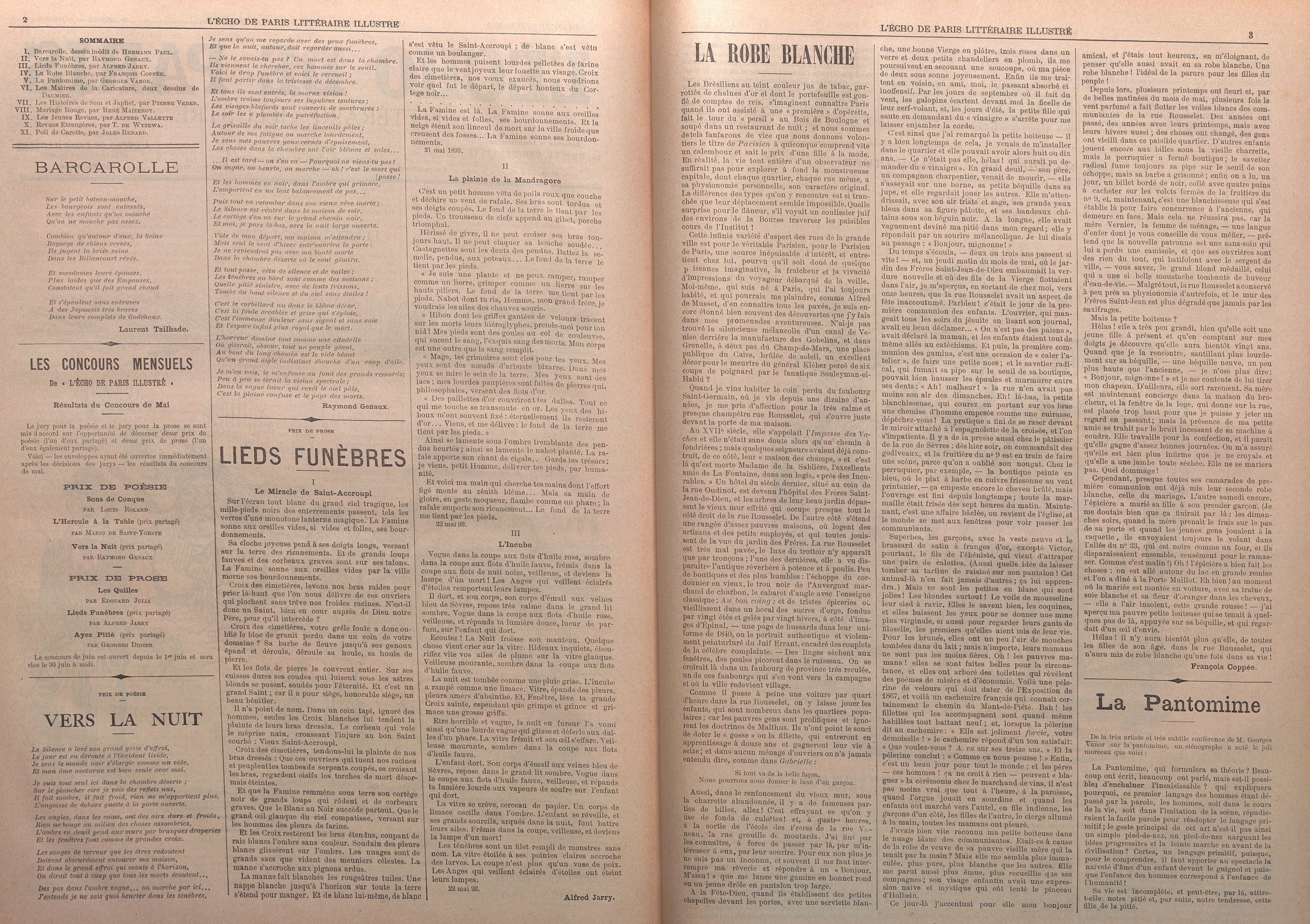 1 vol. grand in-4 rel. ½ toile contenant n°1 (31 janv. 1892) au n° 79 (6 août 1893), tête de collection complète de cette revue codirigée par Marcel Schwob et Catulle Mendès, dans laquelle est publiée notamment les textes littéraires (proses et poésies) des gagnants du concours littéraire organisé en octobre 1892. Entr’autres ceux d’Henri Barbusse mais surtout les premiers textes d’Alfred Jarry où apparaît le père Ubu et le terme de pataphysique pour la première fois. Jarry remporte trois fois de suite ce concours, deux pour le prix de prose (« Guignol » paru le 28 avril 1893 ; « Lieds funêbres » paru le 25 juin 1893) et un pour le prix de poésie (« La régularité de la châsse »). Ainsi lancé dans le milieu littéraire, le jeune auteur présente en 1894 chez Alfred Valette directeur du Mercure de France et sa femme Rachilde, une pièce intitulée Ubu Roi. La pièce fut jouée ensuite pour la première fois, le 10 décembre 1896, au Théâtre de l’Œuvre.