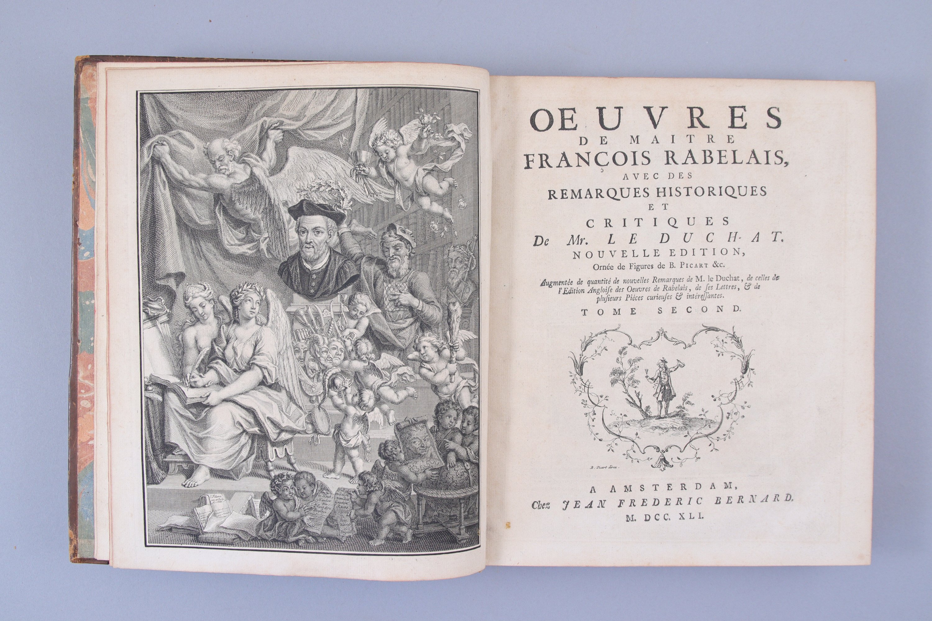 Oeuvres de Maître François Rabelais. Avec des remarques historiques et critiques de M. Le Duchat. Nouvelle édition ornée de figures de B. Picart &c augmentée de quantité de nouvelles Remarques de M. Le Duchat, de' celles de l'édition anglaise des Oeuvres de Rabelais, de ses lettres et de plusieurs pièces curieuses et intéressantes..