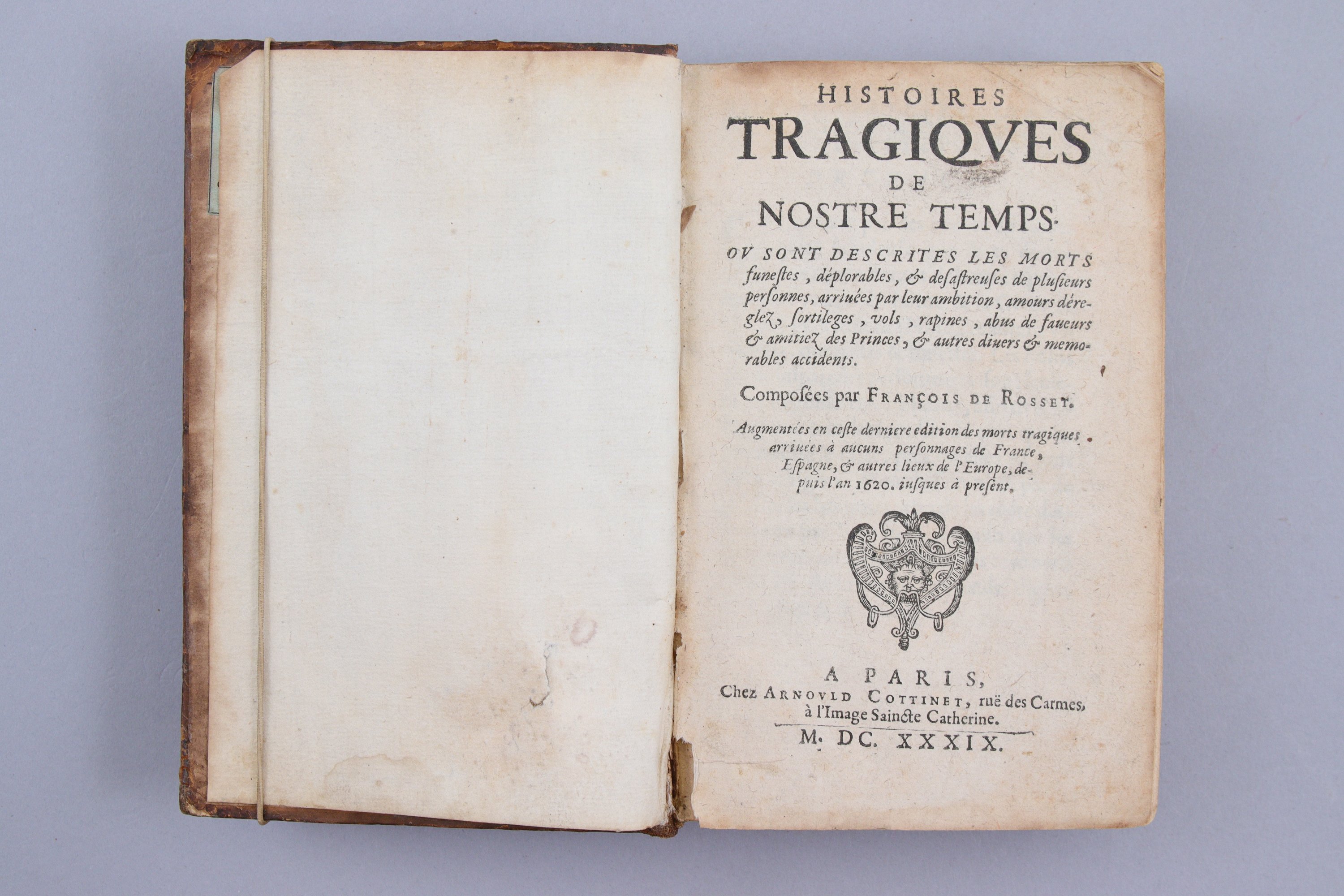 Histoires tragiques de nostre temps. Où sont descrites les morts funestes, déplorables et sésastreuses de plusieurs personnes arrivées par leur ambition, amours déreglez, sortilèges, vols, rapines, abus de faveurs et amitiez des Princes, et autres divers et mémorables accidents. Composées par François de Rosset.Augmentées en ceste dernière édition des morts tragiques arrivées à aucuns personnages de France, Espagne et autres lieux de l'Europe depuis l'an 1620 jusques à présent..