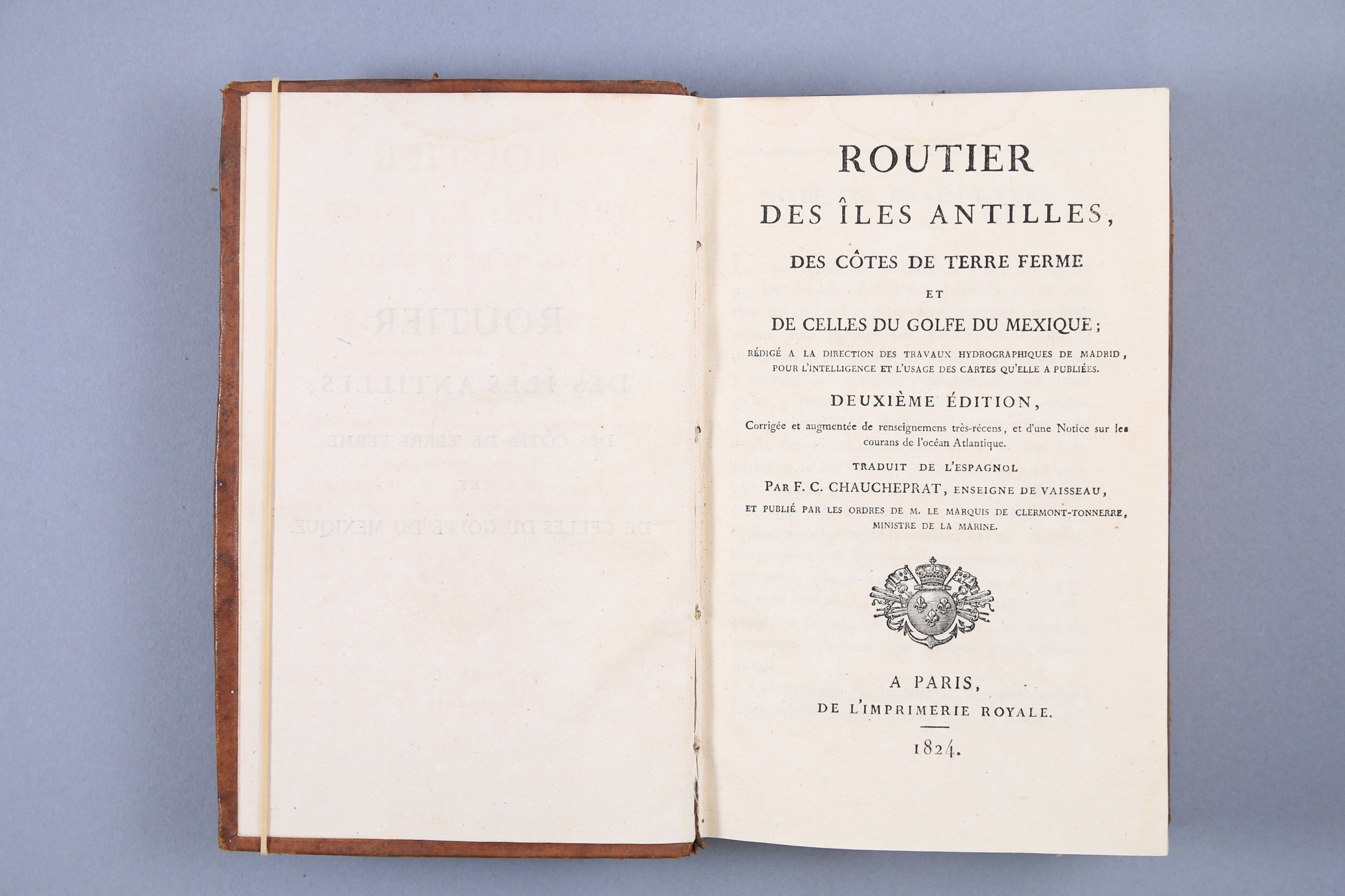 Routier des Iles Antilles, des côtes de terre ferme, et de celles du Golfe du Mexique, rédigé par la direction des travaux hydrographiques de Madrid. Deuxième édition, corrigée et augmentée de renseignements très récents et d'une notice sur les courans de l'Océan Atlantique. Traduit de l'espagnol par F.C. Chaucheprat, enseigne de vaisseau.
