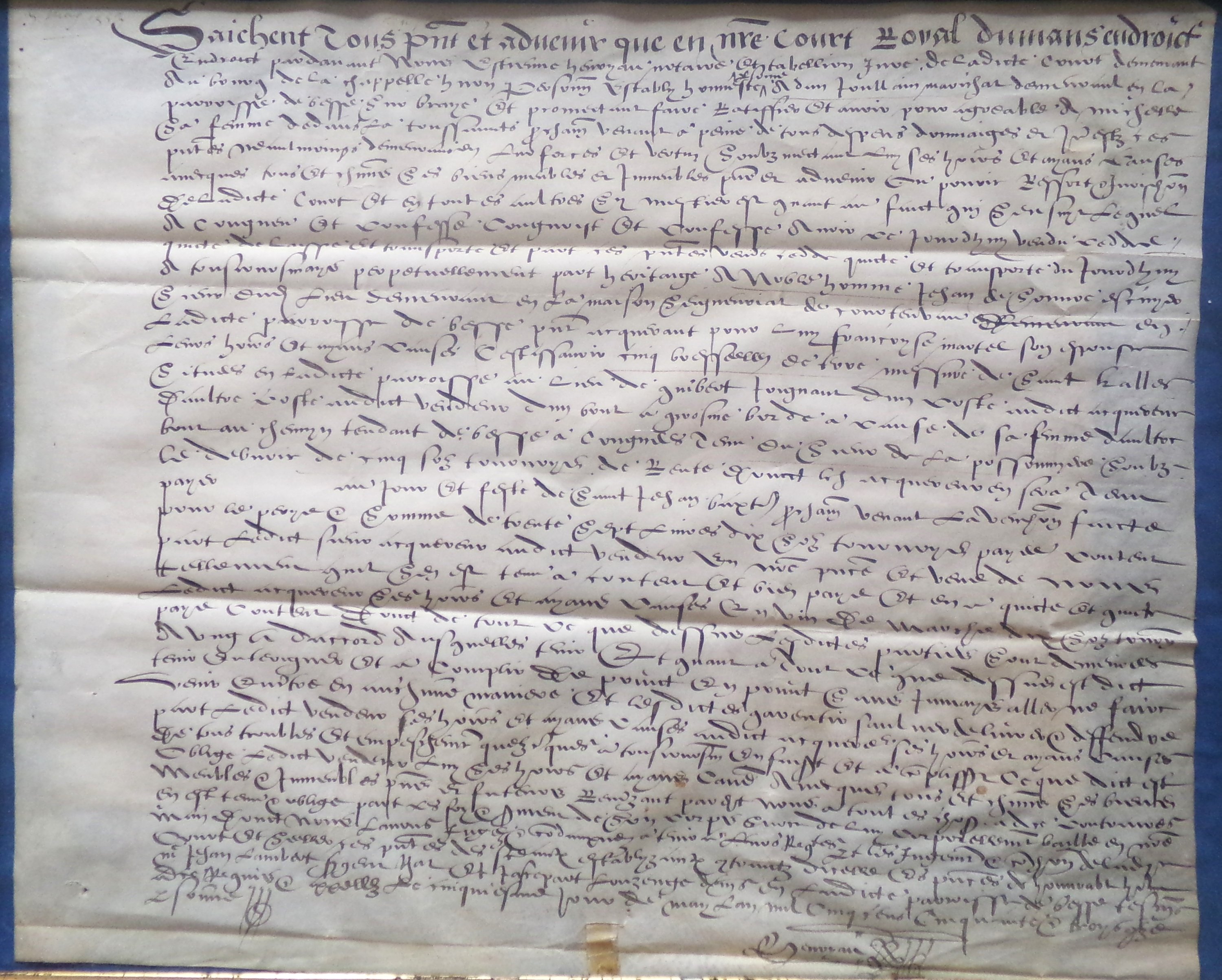 Sentence d’assises, 15 avril 1507, rendu par le bailli de la seigneurie de Bonneval sur Braye (Bonneveau) et de Vancé au sujet des biens meubles ayant appartenu à feu messire Antoine Martin prêtre chevecier de l’église collégiale de Saint Martin de Trôo et devant revenir à messire Jean Berziau, écuyer seigneur de Courtanvaux par droit de moyenne et basse justice, 43 x 26 cm.