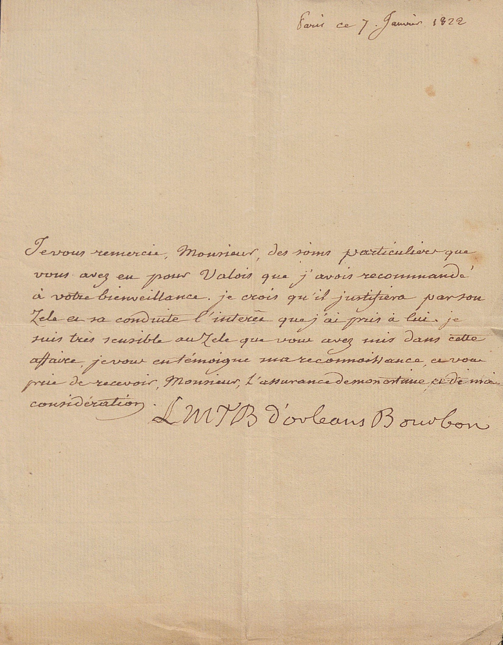 L.S., Paris, 7 janvier 1822, Louise Marie Thérèse Bathilde d’Orléans (1770 - 10 janvier 1822), princesse du sang, princesse de Condé, dite Mademoiselle (1750-1767) puis duchesse de Bourbon (1767-1822), épouse de Louis Henri Joseph de Bourbon duc de Bourbon, fille du duc d'Orléans, sœur de Philippe Egalité, tante de Louis-Philippe Ier, mère du duc d'Enghien, belle-fille du prince de Condé, ancienne propriétaire de l’hôtel Beaujon (palais de l’Elysée), lettre de recommandation signée trois jours avant son décès, 1 page in-8.