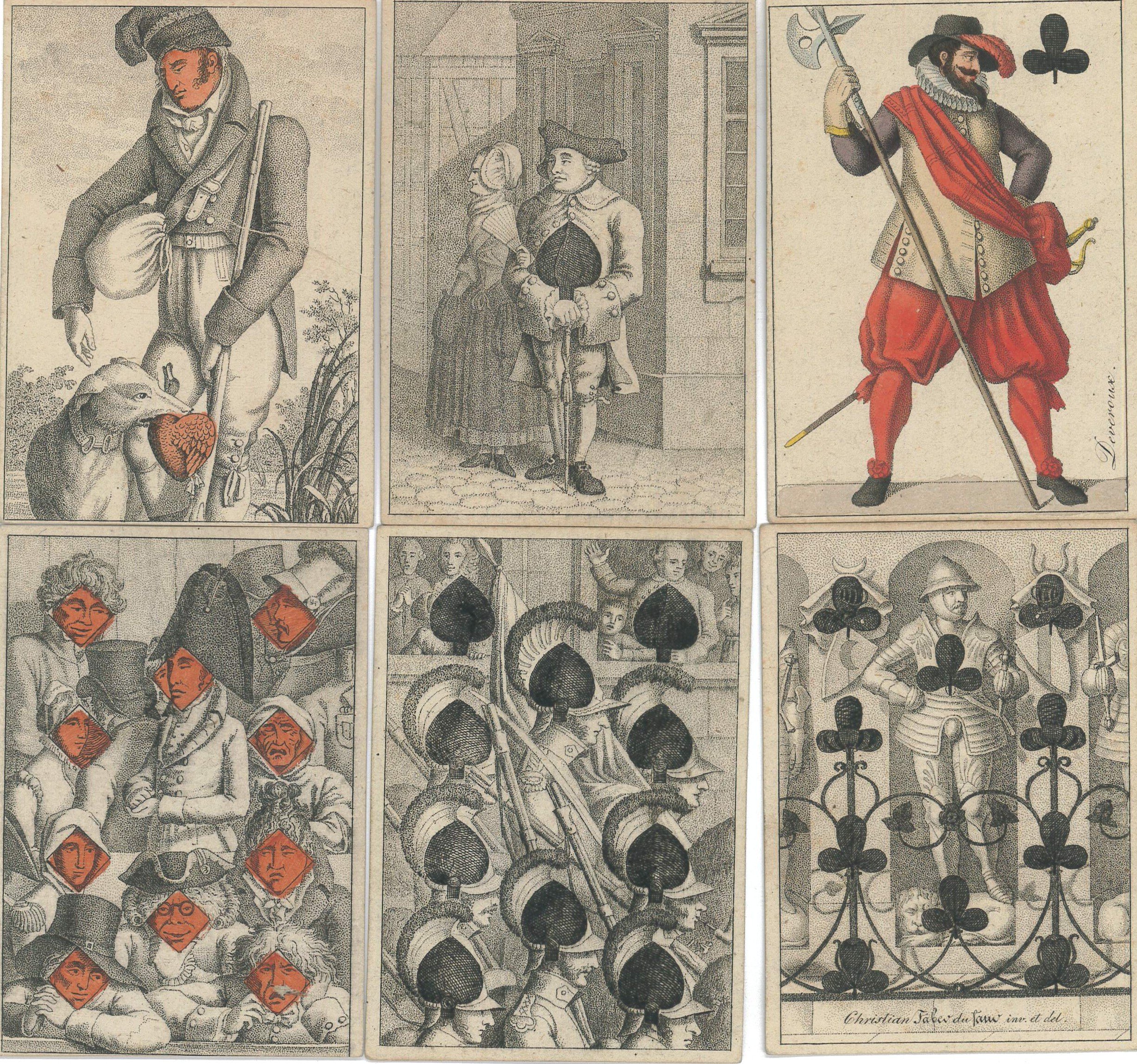 Jeu de cartes dit « Wallenstein » composé de 52 cartes à jouer, complet (13 couleurs de chaque), eau-forte et pointillé, couleurs au pochoir, d’après Wilhelm Christian von Faber du Faur (1780-1857). Édité chez Johann Friedrich Cotta, Tubingen, 1807. Sur l'As de trèfle " « A Tubinge / chez J.G. Cotta, Libraire », 9,7 cm x 6,8 cm. Avec livret/règle du jeu plié « Karten-Almanach ». Dans une boite cartonnée (manque) 11 x 7,5 cm.