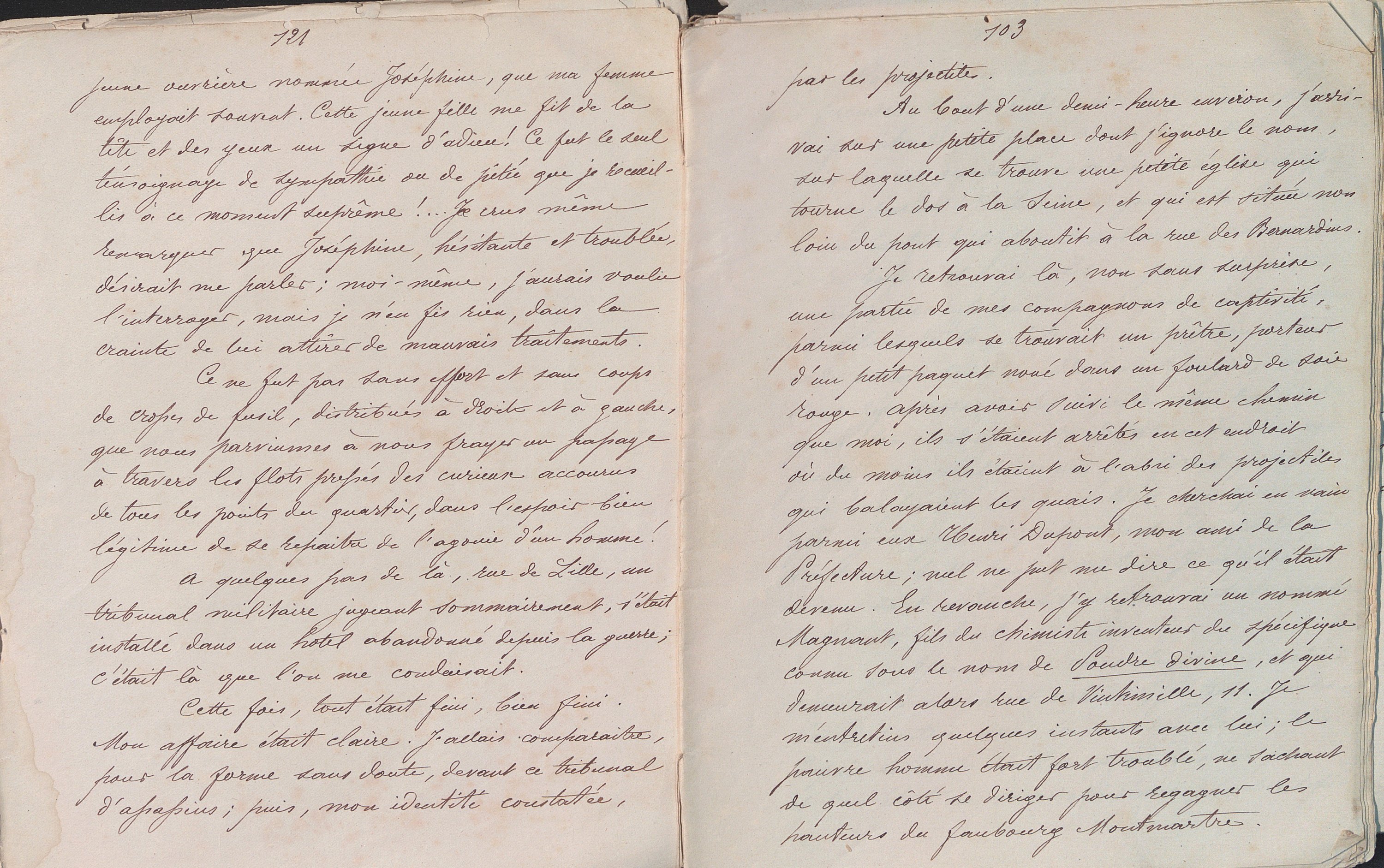 Manuscrit titré « Souvenirs personnels pour servir à l’histoire de la Commune par Alph. Du Camp, ex-membre du Comité central de la Garde nationale de Paris et du gouvernement insurrectionnel du 18 mars », 161 feuillets in-8 écrits seulement au recto (manque la page 18 et 101, accdts).