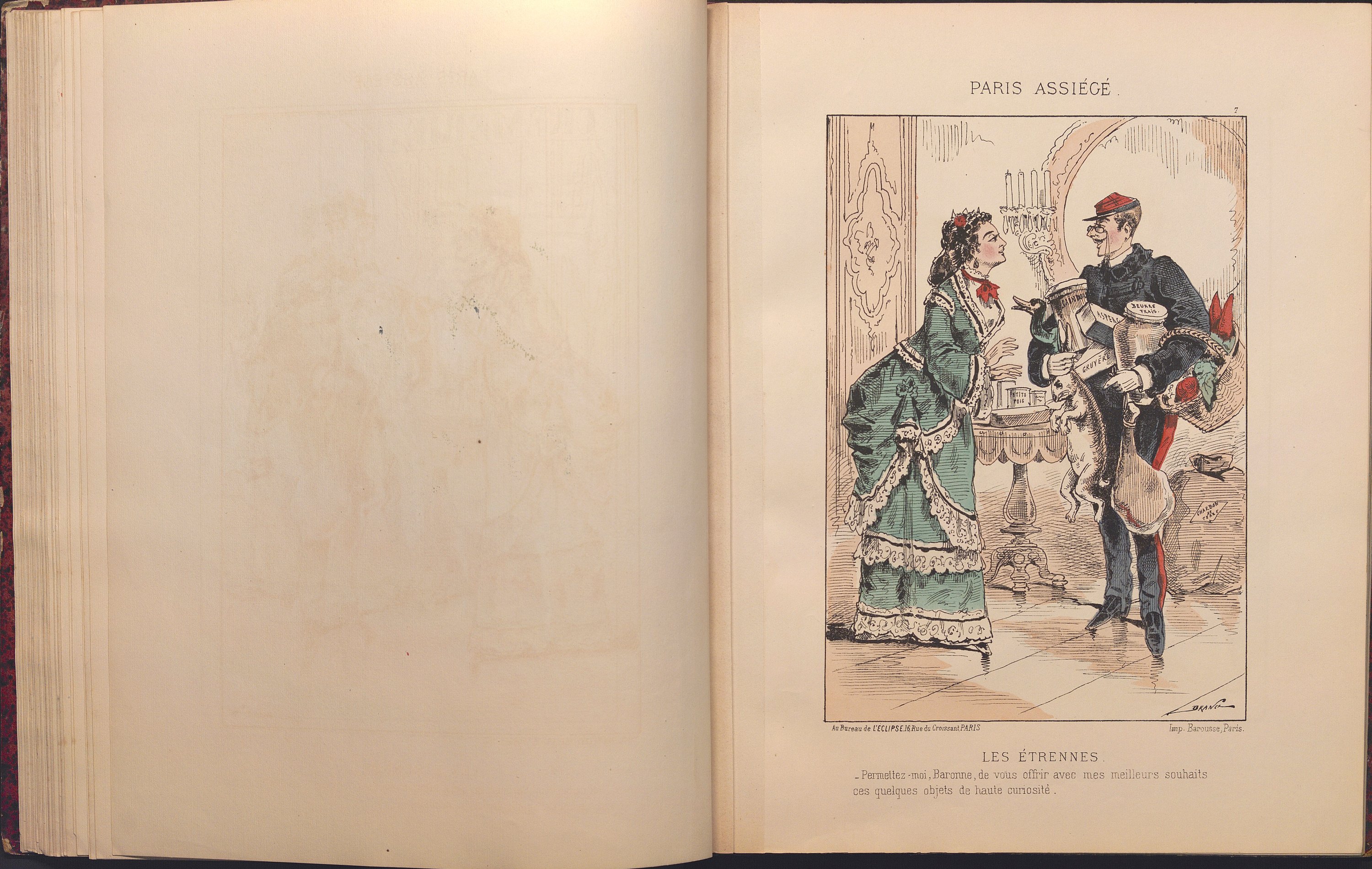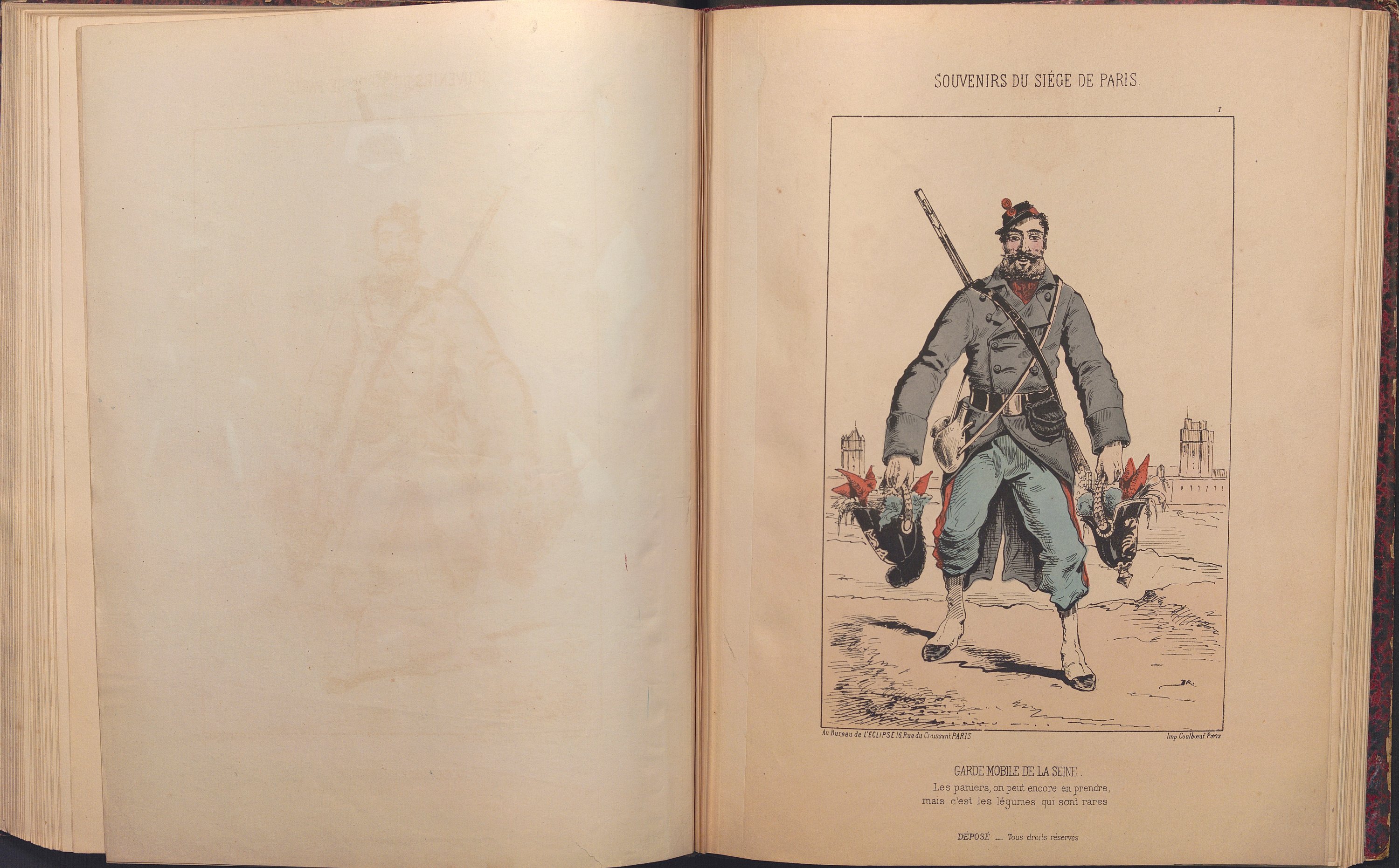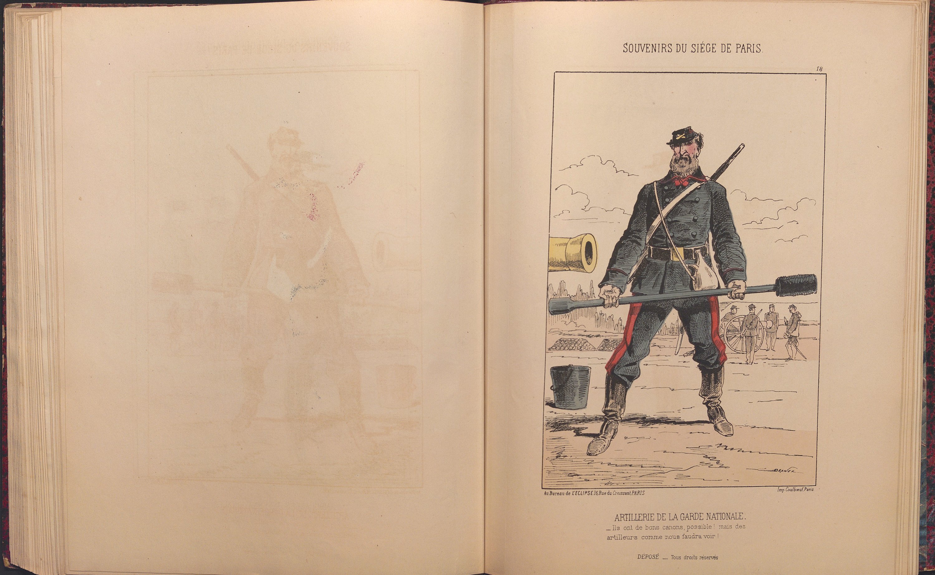 Jules Renard dit Draner (1833-1890), Souvenirs du Siège de Paris. Les Défenseurs de la Capitale. [Suivi de] Paris assiégé. Vie parisienne. [Suivi de] Les Soldats de la République. L'Armée française en Campagne.? Paris, Au Bureau de L'Eclipse, [1871-1872]. In-4 rel. ½ chagr. rouge, 2 ff. (titre) et 31 pl., 2 ff. (titre) et 31 pl.- 2 ff. (titre) et 31 pl. Complet des 96 pl. en couleurs montées sur onglets (qqs rouss., rest. à 1 pl.) B.E. à T.B.E.