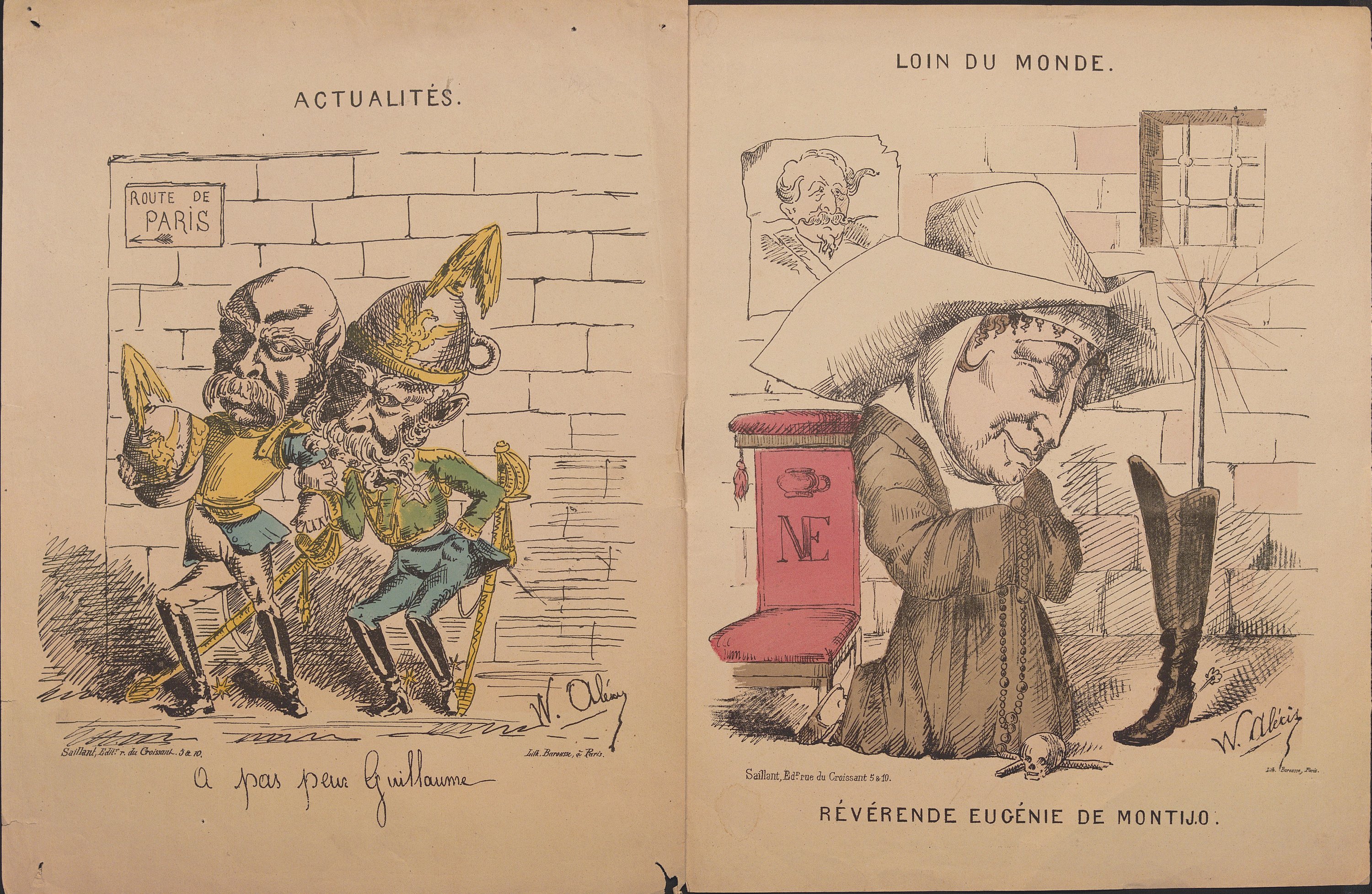 Dont W. Alexis : Loin du Monde, révérende Eugénie de Montijo, 35,5 x 27,5 cm ; Nos despotes En famille !, 33 x 25 cm ; Un Prétendan , 33 x 25 cm (rousseurs) ; Le retraité de Wilhemshohé, 32 x 25 cm (petite déchirure) ; Actualités, A pas peur Guillaume, 36 x 27 cm ;