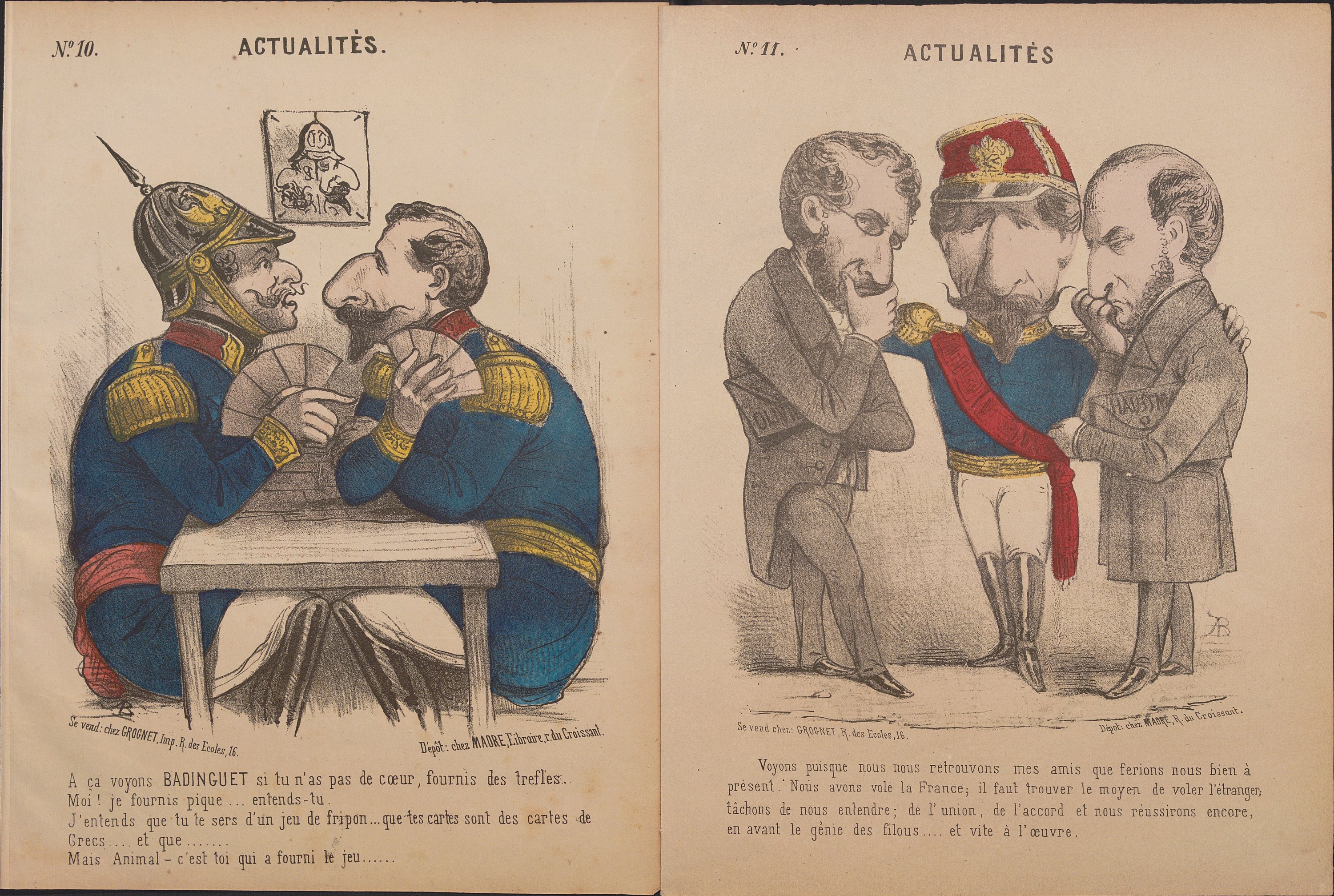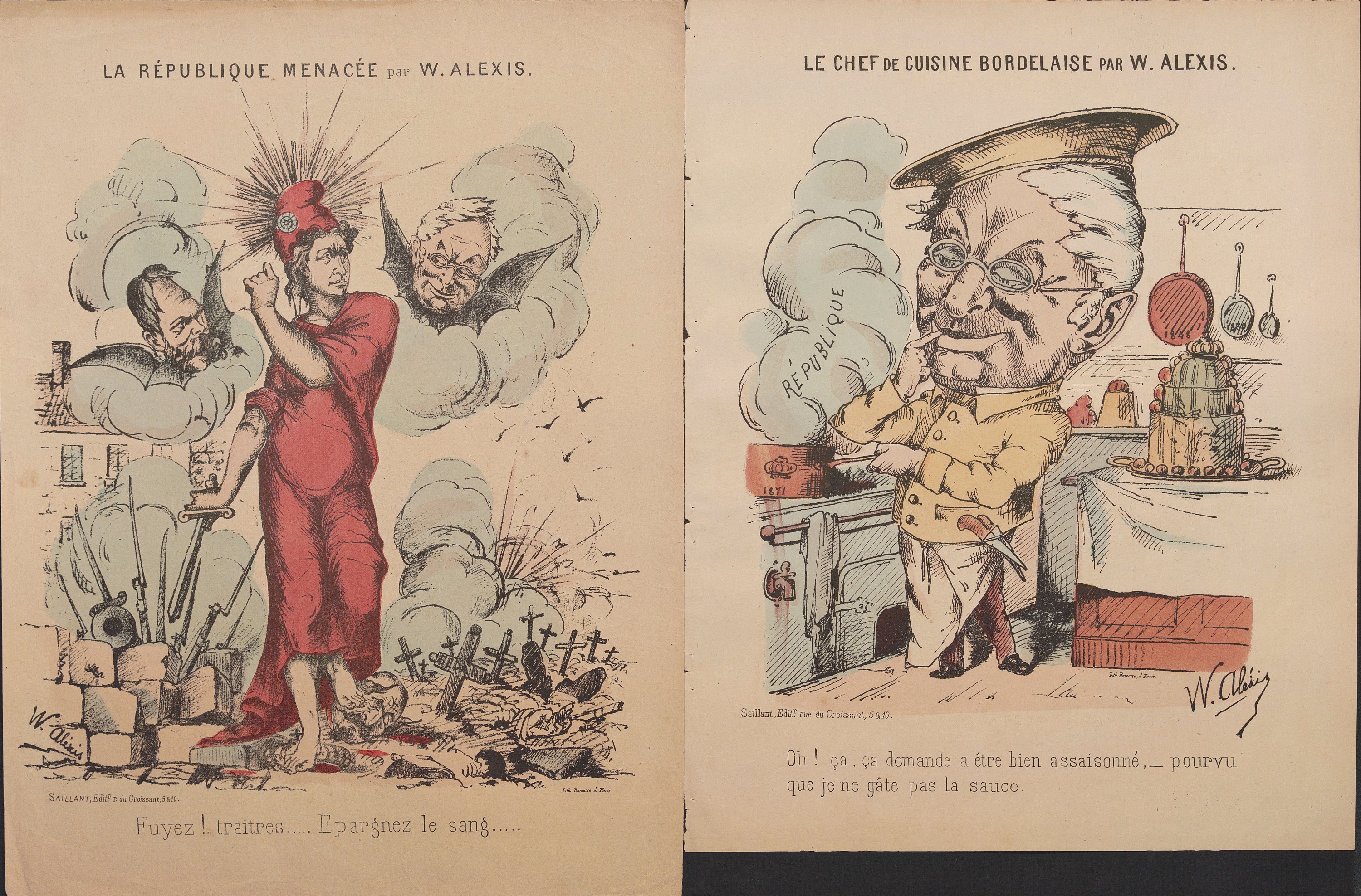 Actualités, Jules Favre - Trochu et son plan, 35,5 x 27 cm ; L’embarras d’une proclamation, 31,5 x 23,5 cm ; Actualités, Nos prêtres ne sont pas ce qu’un vain peuple pense , 35,5 x 28 cm, contrecollé sur feuillet épais ; Actualités, Pauvre comte de Paris , 26 x 35 cm ; La République menacée , 36 x 27 cm ; Le chef de cuisine bordelaise , 34 x 26 cm ; etc.