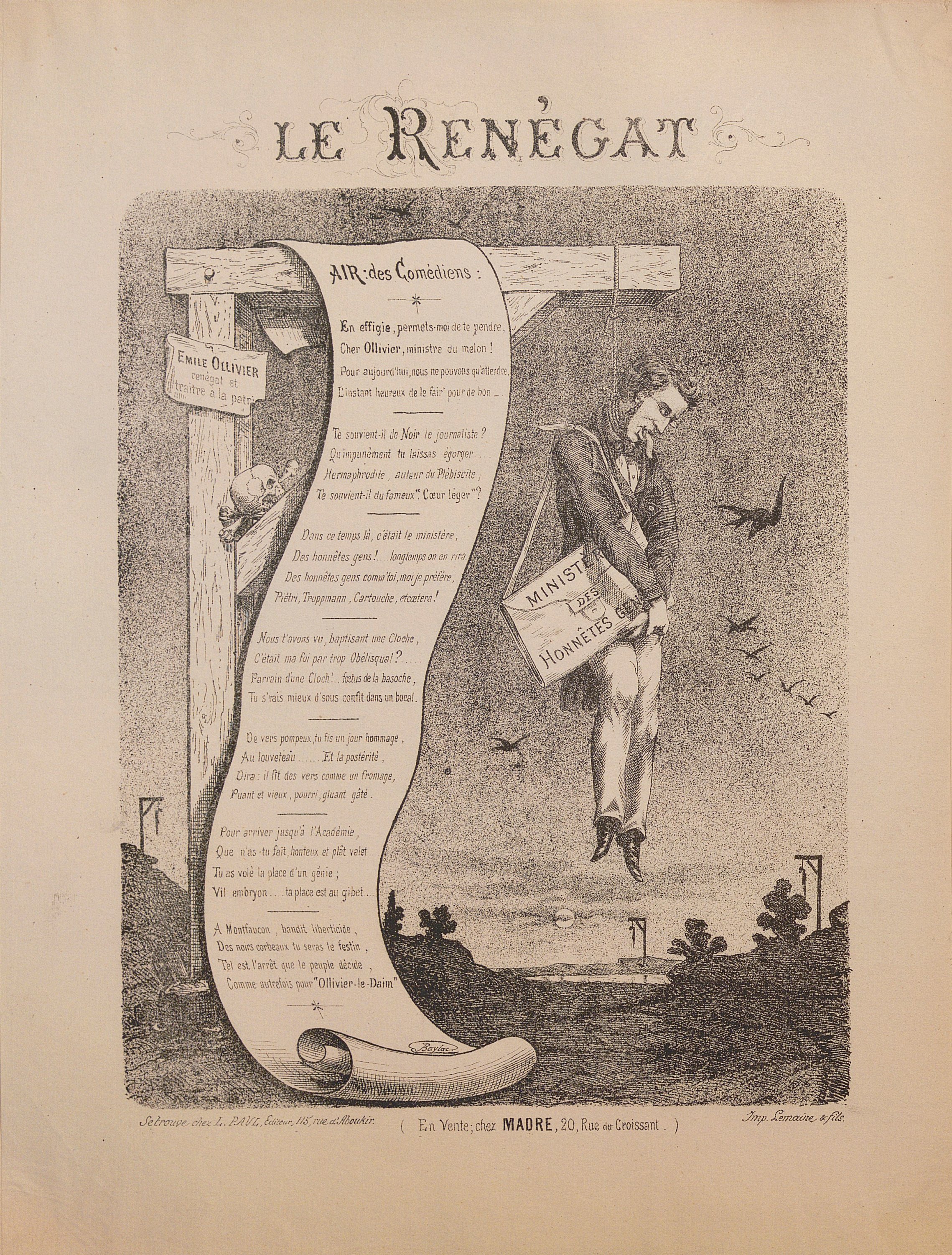 Alexandre Baylac : Les Girouettes, 4 lith. en noir et blanc, série complète, 32,5 x 24,5 cm (petite déchirure) ; L’éloquence de Me Jules Favre , 31,5 x 23 cm ; M. Thiers et les abeilles , 31 x 23 cm ; Les criminels célèbres !, 27,5 x 21,5 cm ; Le Sire de Franc-Boisy, légende impériale, 32,5 x 24,5 cm ; Le Rêve de l’ivrogne [chanson], 32,5 x 23,5 cm, contrecollé sur feuillet épais ; Badinguet [chanson], 31,5 x 24,5 cm ; Badinguette [chanson], 31,5 x 23 cm ; Badinguette [chanson], 32 x 24,5 cm ; Andalouse [chanson], 24,5 x 31,5 cm ; Le Renégat [chanson], 32,5 x 24,5 cm, contrecollé sur feuillet épais ; Don Quichotte & Tortillard , 44,5 x 30 cm (petit mque au coin haut gauche).