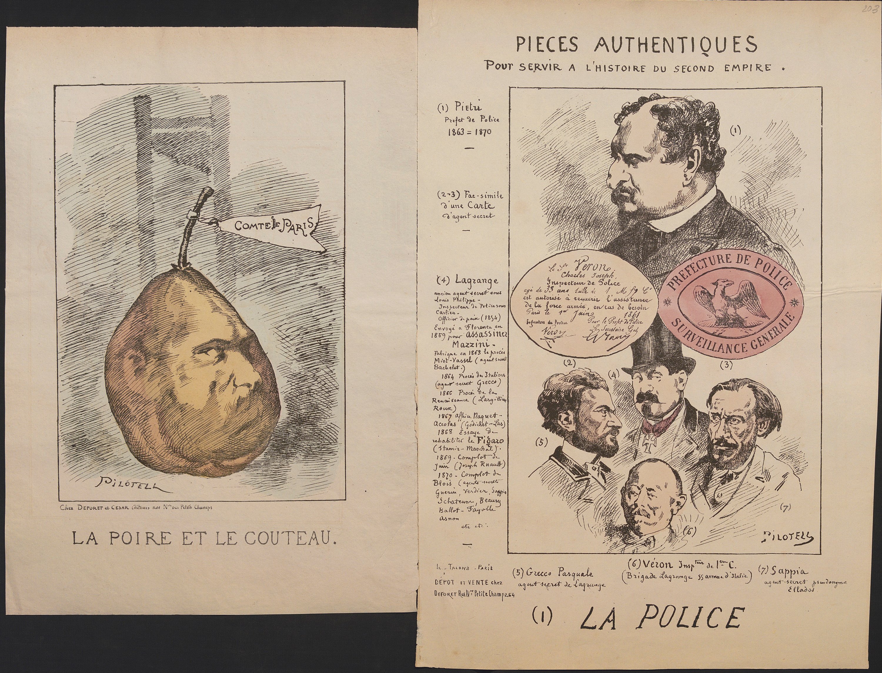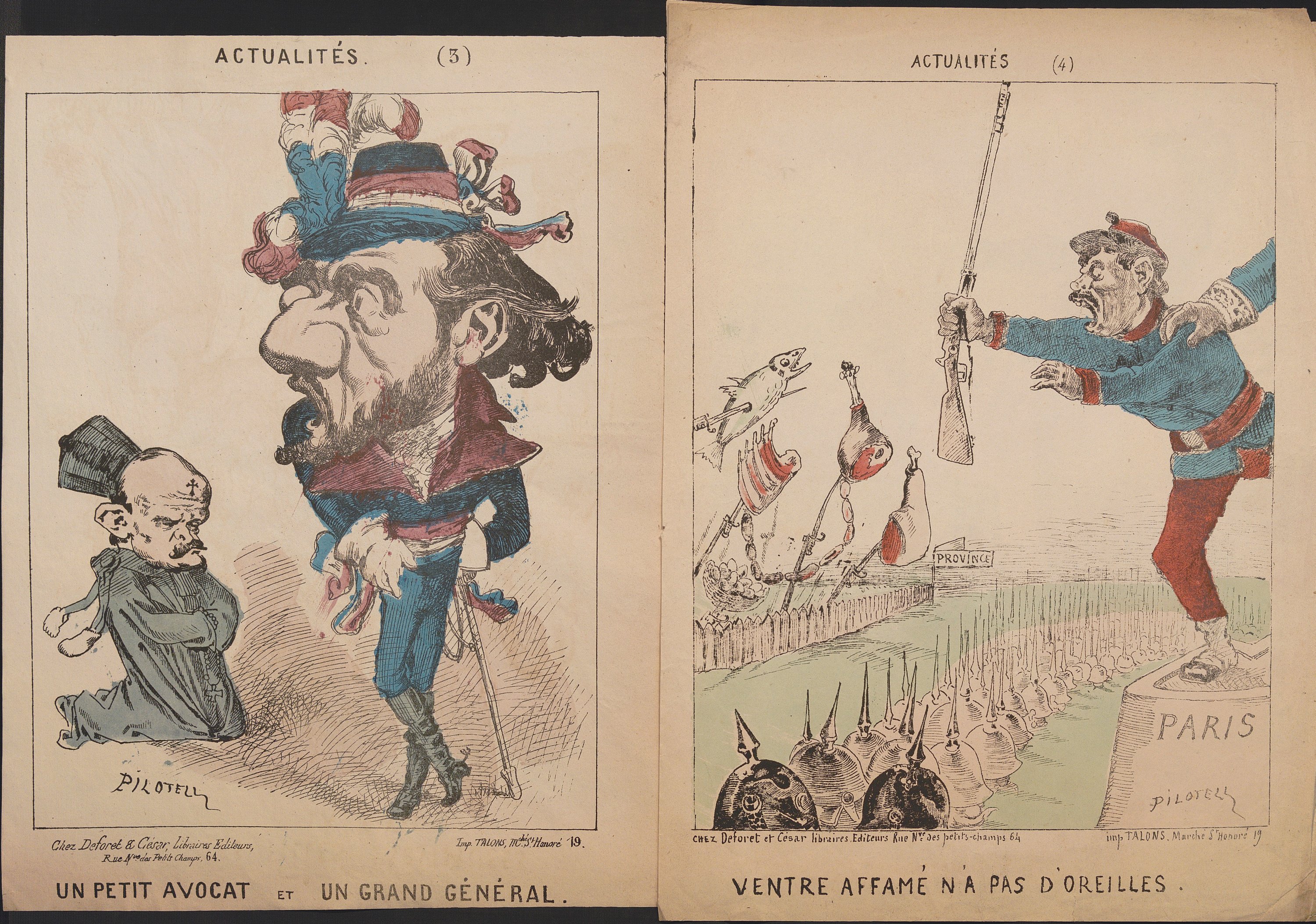 Pilotelle : Actualités chez Deforet, série complète, n°1 au n°23, env. 35 x 25 cm ; Croquis révolutionnaires, série complète, n°1 à 5 ; env. 41 x 30 cm ; Les représentants en représentation, n°1 à 4 (mque n°5), 28 x 17,5 cm ; Les preuves de l’infamie de M. H. de Villemessant , 32,5 x 27,5 cm (petite déchirure) ; Toutes trois trahies !, 36,5 x 26,5 cm, contrecollé sur feuillet ; La poire et le couteau, 32,5 x 22,5 cm ; Pièces authentiques, La Police, 36 x 25,5 cm ; La Parisienne, chant de Léon Charly, en N&B, 37,5 x 26 cm, contrecollé sur feuillet ; Sous l’Empire, L’éducation d’un Prince, 26 x 34,5 cm ; série Actualités chez Deforet, n°1 au n°23 (mque 13), formats divers (qqs petits déf.) ; Les représentants en représentation,n°2 et 3 (sur 5), 26 x 17 cm ; Croquis révolutionnaires, n°1, 3 et 5, formats et états divers ; La Bêtise humaine, n°1 et 2, 36,5x 27 cm.