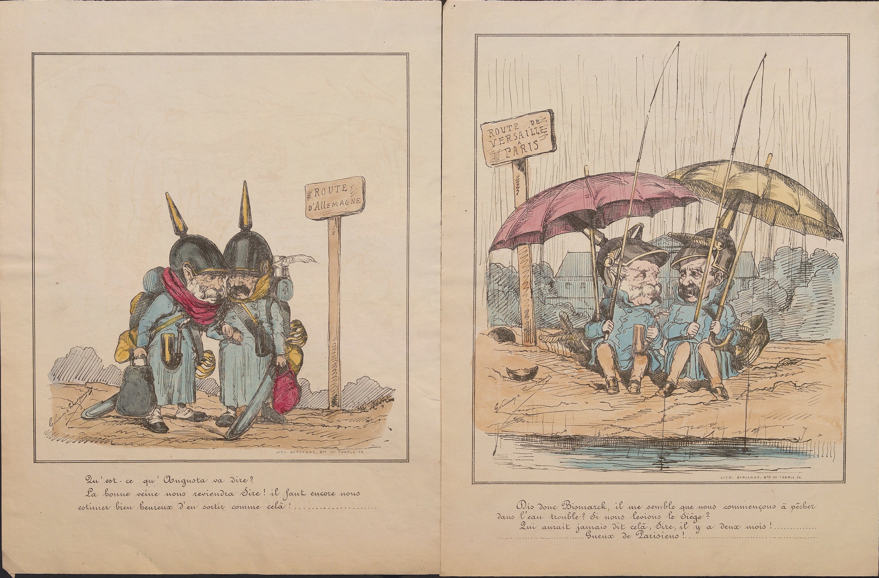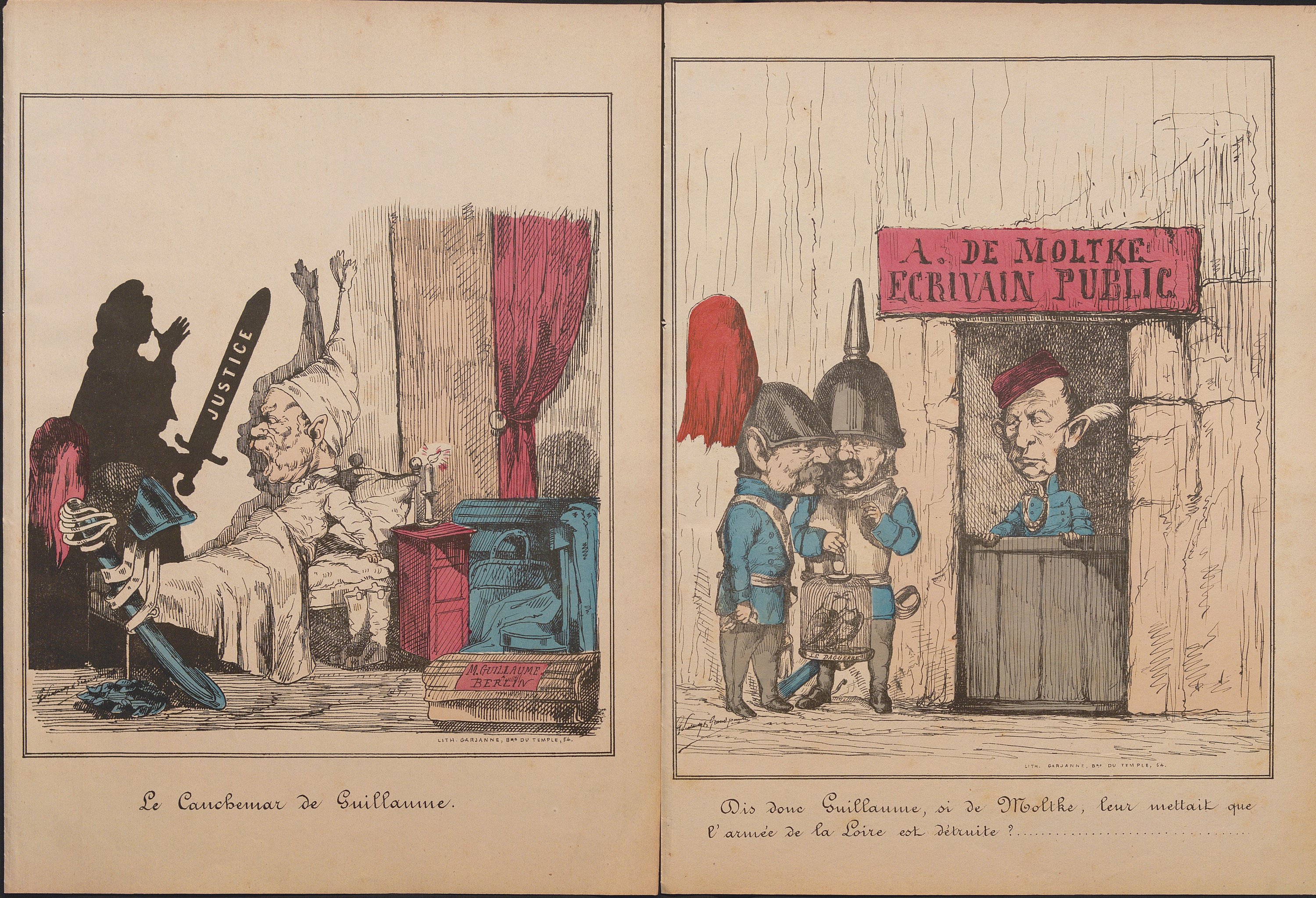 Holb : Mauvaise pièce, 33,5x26,5 cm ; Moi, je veux mon peuple, 30,5 x 21 cm (petits déf.) ; Peine de Badinguet, 25,5 x 34,5 cm (marges courtes) ; Le nouvel empereur d’Allemagne , 33,5 x 26 cm ; Dans quelque bagne vil n’entendant que sa chine Victor Hugo, 26,5 x 32,5 cm (petits déf.) ; Les étrennes de Guillaume au peuple allemand, 26,5 x 36,5 cm (marges courtes) ; Les étrennes de Bonaparte, 26 x 34 cm ; Le prisonnier de Whilemshoe , 32,5 x 27 cm ; Halte là !!!, 29 x 39 cm (petits déf.) ; Soleil levant, 27 x 237 cm (petits déf.) ; C’est bien mon toutou , 26 x33,5 cm ; Guillaume et Bismarck remportant leur veste, 27,5 x 33 cm ; Aux deux amis, 26 x 34 cm.