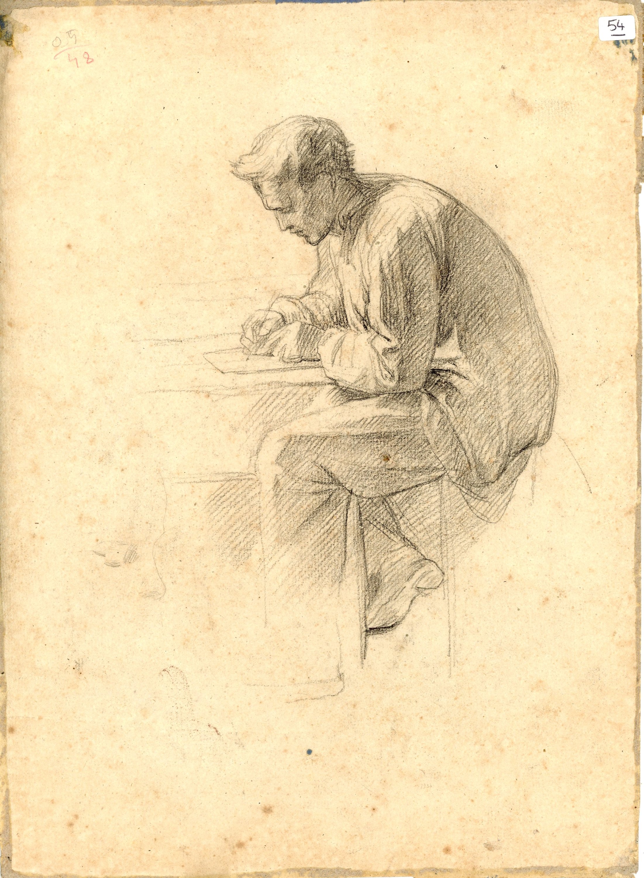 La couturière. Dessin au fusain. Signé en bas à droite, daté « 1863 » et situé à « La Chaussée » [La-Chaussée-du-Bois-d’Ecu, Oise]. Au verso, un jeune homme assis écrivant une lettre. 29,5 x 21 cm.