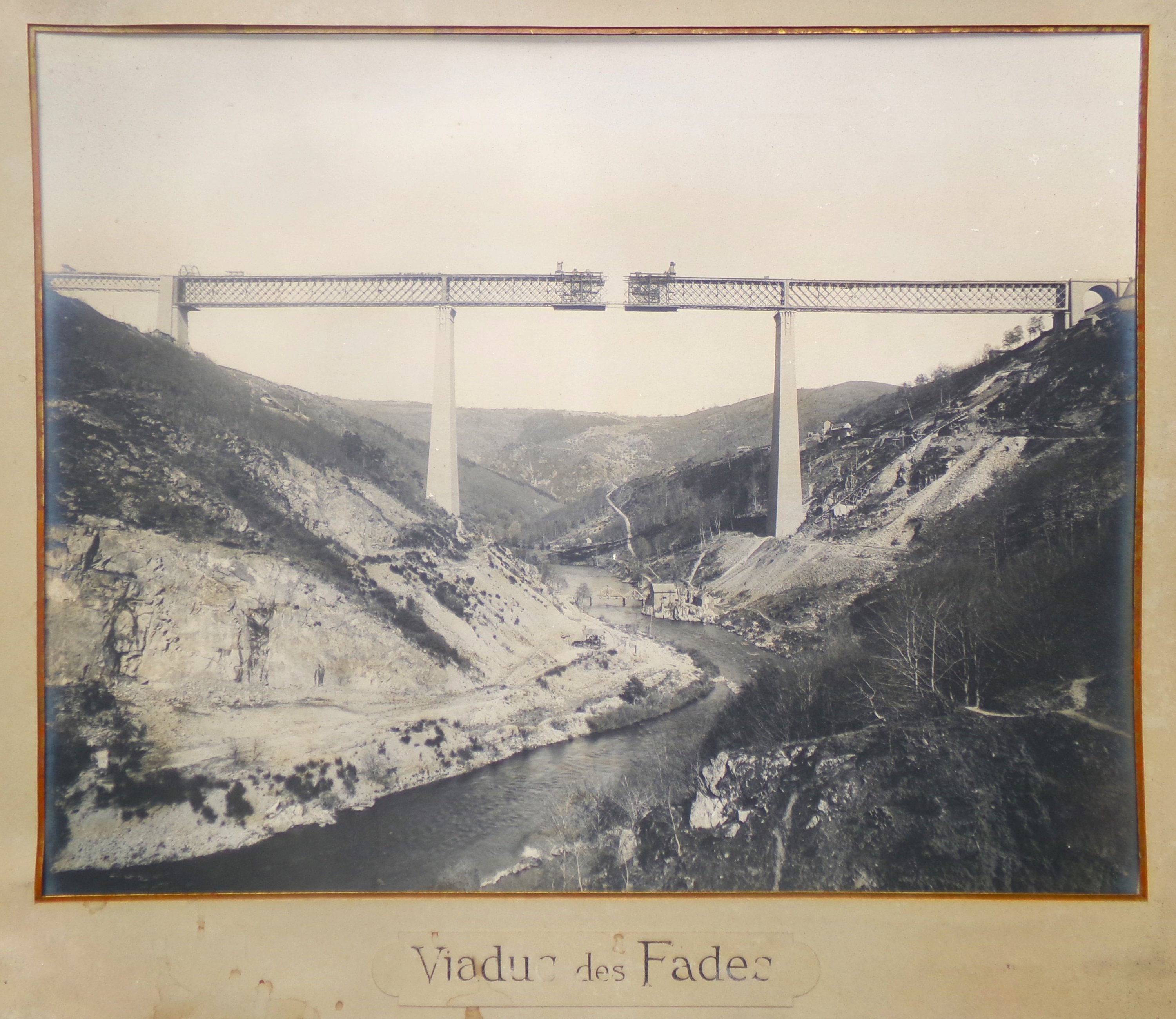 Construction du viaduc des Fades (Puy-de-Dôme), 54 x 64,5 cm ; construit à partir de 1901 et inauguré en 1909, cet ouvrage d’art ferroviaire figurait à l’époque comme l’un des trois plus hauts ponts du monde ;