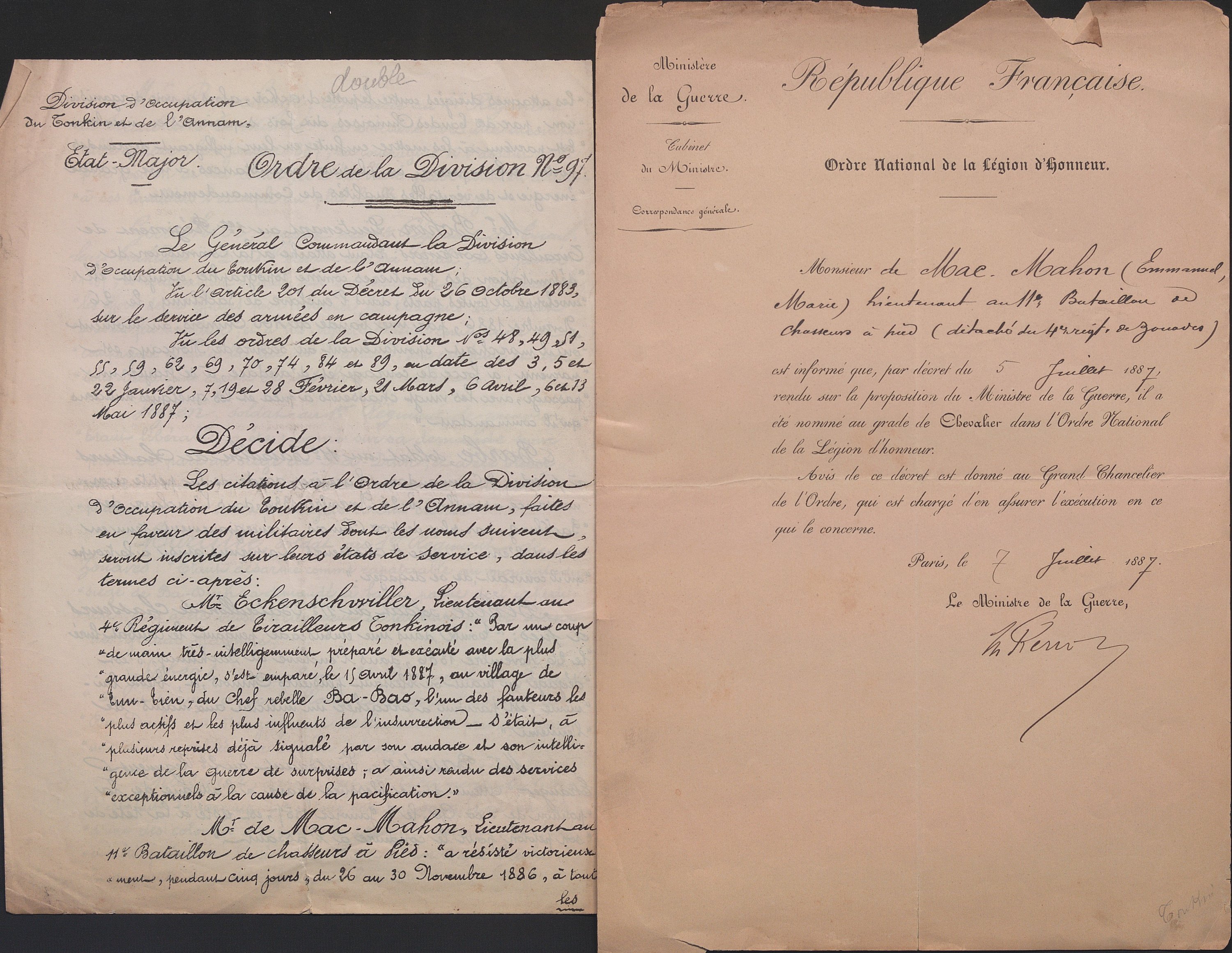Lot de plus de 60 pièces manuscrites, 1880-1888, concernant la carrière militaire de Marie Emmanuel comte de Mac Mahon, fils cadet du maréchal Mac Mahon, élève de l’Ecole spéciale militaire de Saint-Cyr de 1878 à 1880 (promotion des Zoulous), sous-lieutenant au 36e RI, lieutenant en 1884 au 4e régiment de zouaves puis au 11e bataillon de chasseurs à pied en 1886, participe au corps expéditionnaire et à l’occupation du Tonkin en Indochine du 20 octobre 1885 au 1er avril 1888.