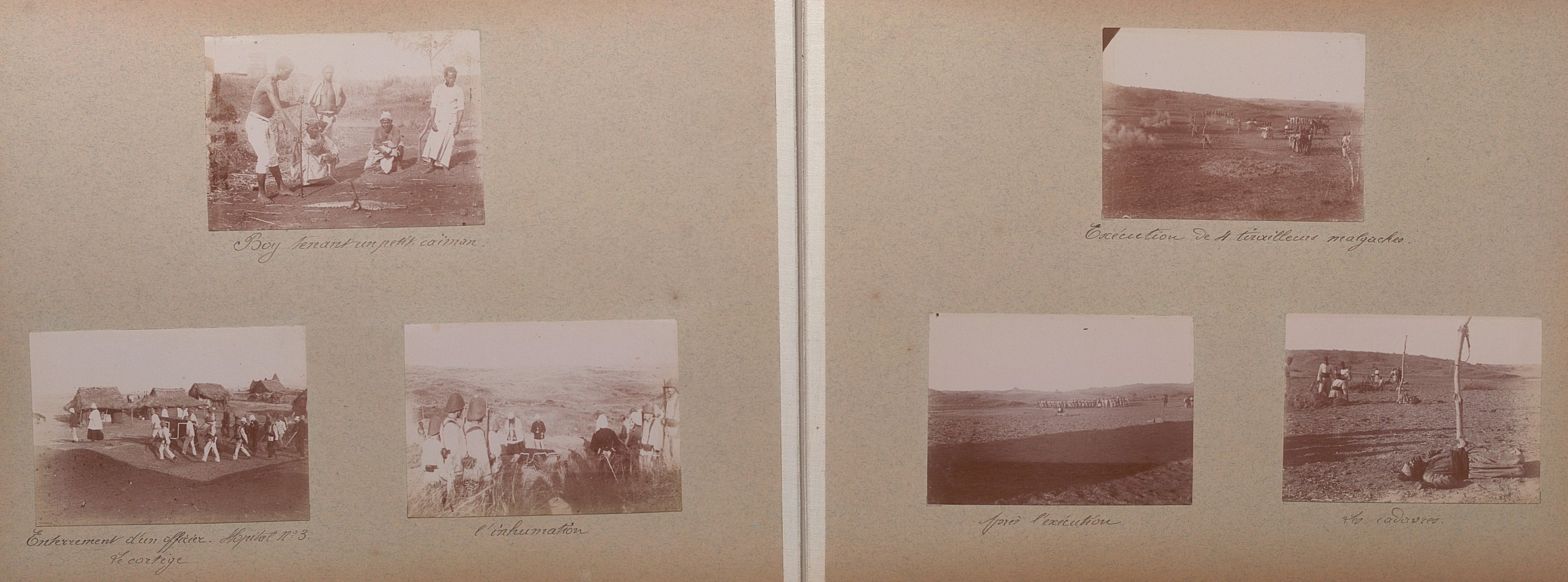 Album photo à l’italienne, 21 x 26 cm, contenant env. 250 clichés photographiques, 6x 8 cm, contrecollés sur carton fort, tous légendés et classés ; rare et bel ensemble de photographies témoignant de l’expédition militaire française qui se déroule à Madagascar au cours du premier semestre 1895, dont :