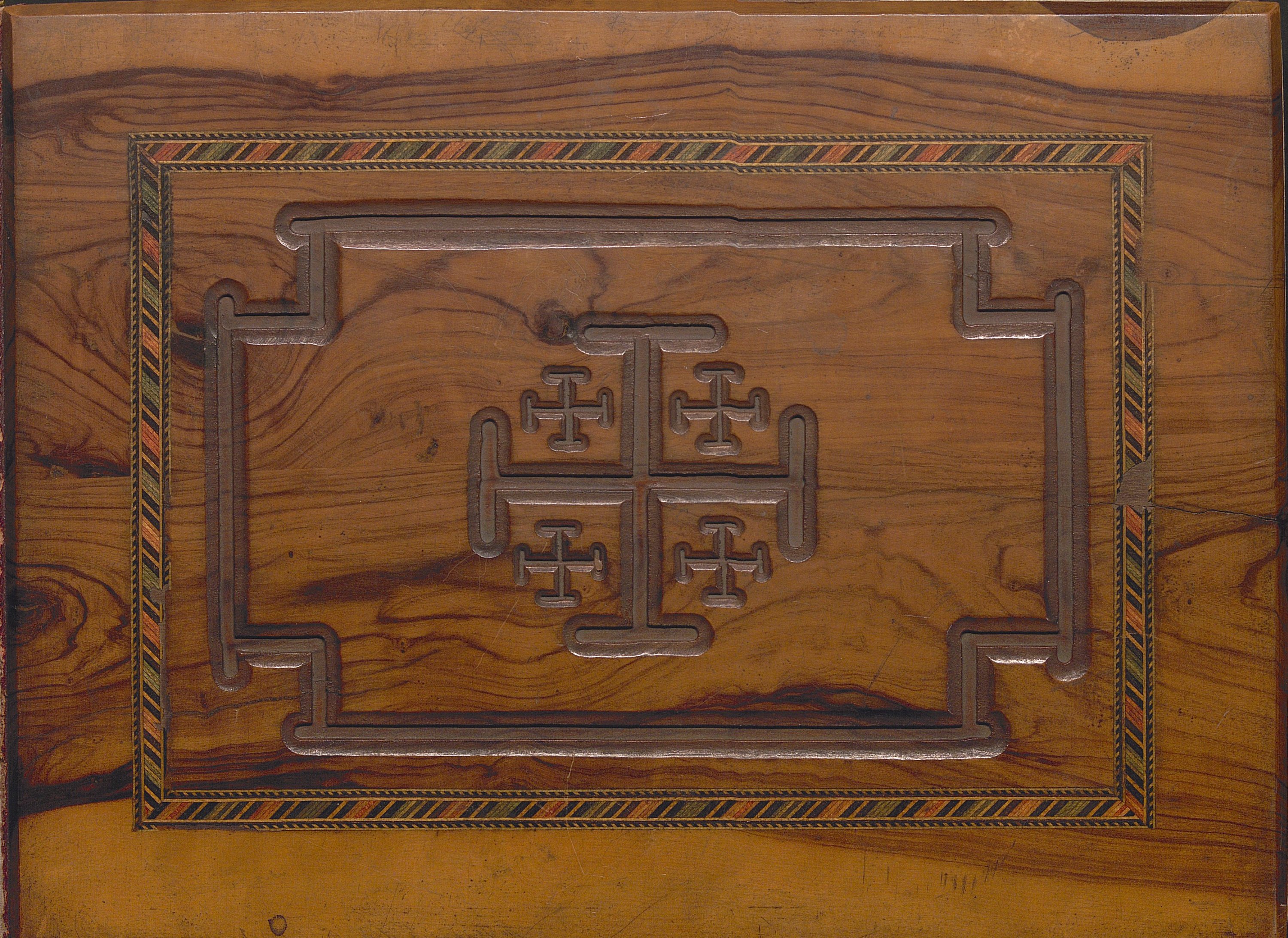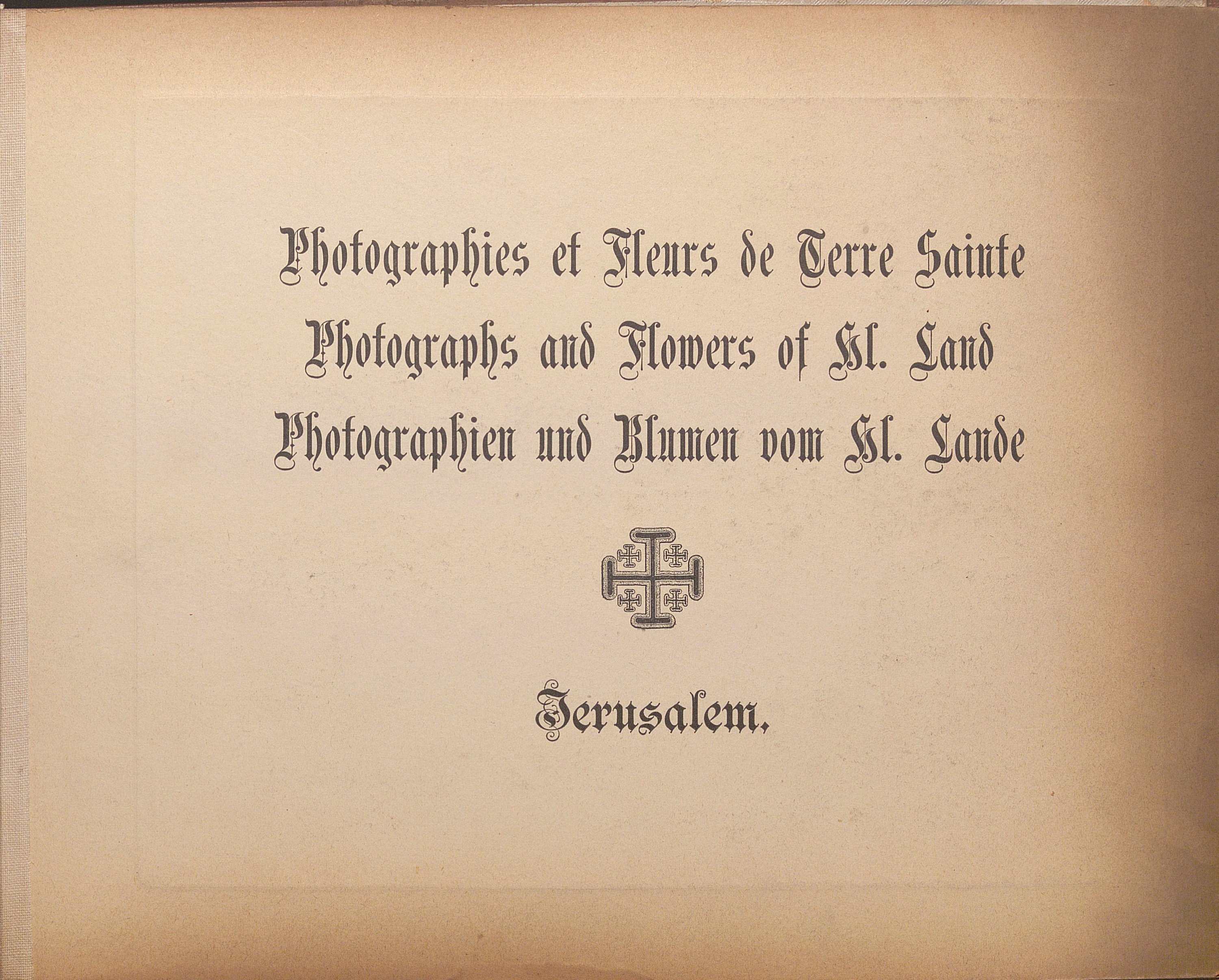 Album à l’italienne relié, 22 x 29,5 cm, plats en bois d’olivier (accdts à la couv.), bords biseautés, ornés d’une croix de Jérusalem sculptée sur le premier plat, 18 photochromes sur carton fort et 18 fleurs séchées en regard, sous serpentes, montés sur onglets toilés.