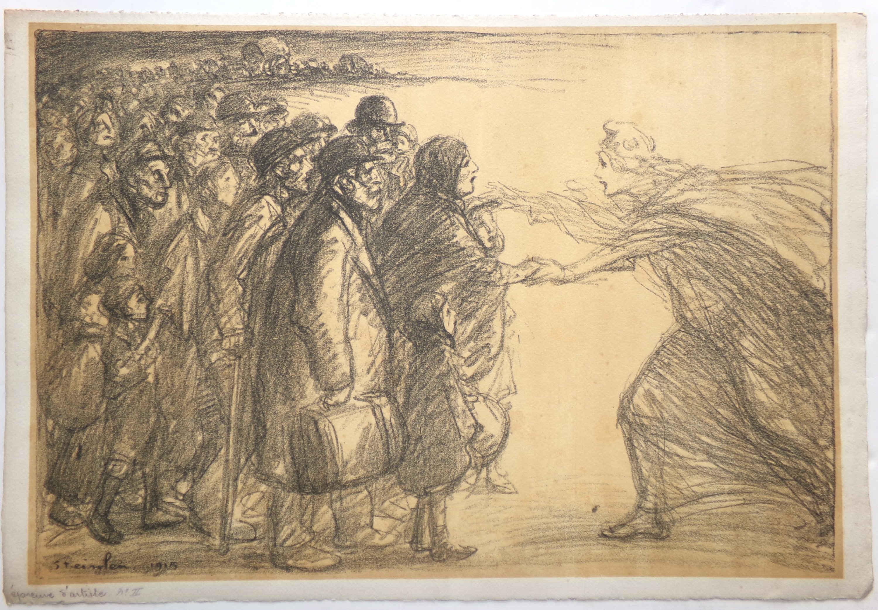 23 épreuves tirées sur fond ocre, dont 19 pl. portent la mention « épreuve d’artiste n°II » et 1 pl. signée au crayon par l’artiste : [Verdunois à la Gare de l'Est] ; [La Gloire] (en couleurs] ; [L’exode belge] ; [Les réfugiés de la Meuse] ; [L’allocation militaire] ; [Les convalescents] ; [Courageuse !] ; [Pour les fillettes des soldats tombés au champ d’honneur] ; [Un vieux de la vieille] ; [L’aide aux mutilés de guerre] ; [Sous la botte] ; [Le secours national] ; [Errant  !] ; [Veuves d’un Louis] ; [Pour les familles dispersées] ; [Chiens errants] ; [Serbie. Sœur Anne de France ou d’Italie ne vois tu rien venir] ; [Calvaire serbe] ; [Deux poilus] ; [On ne s’en fait pas] ; [Bat d’Af] ; etc.