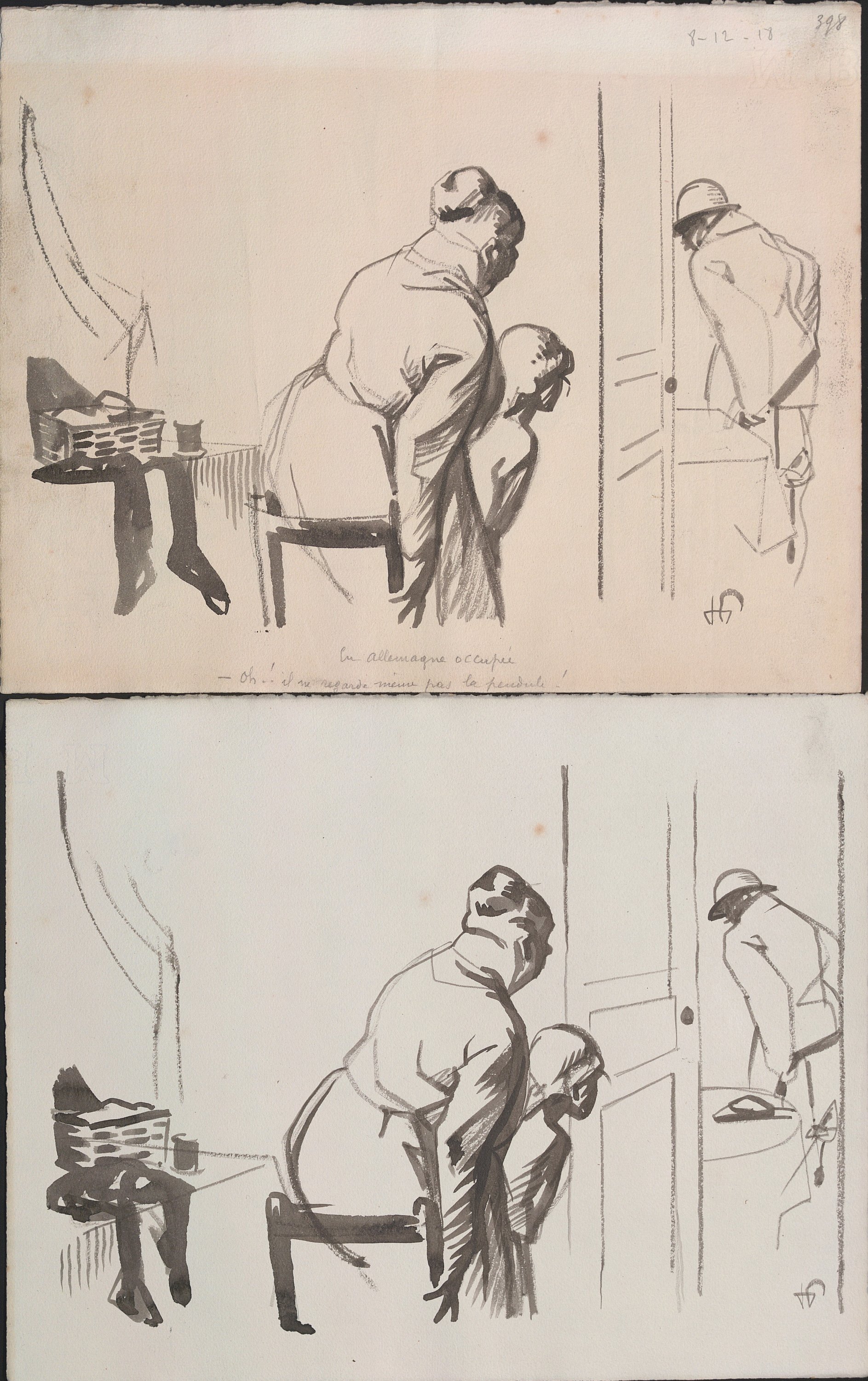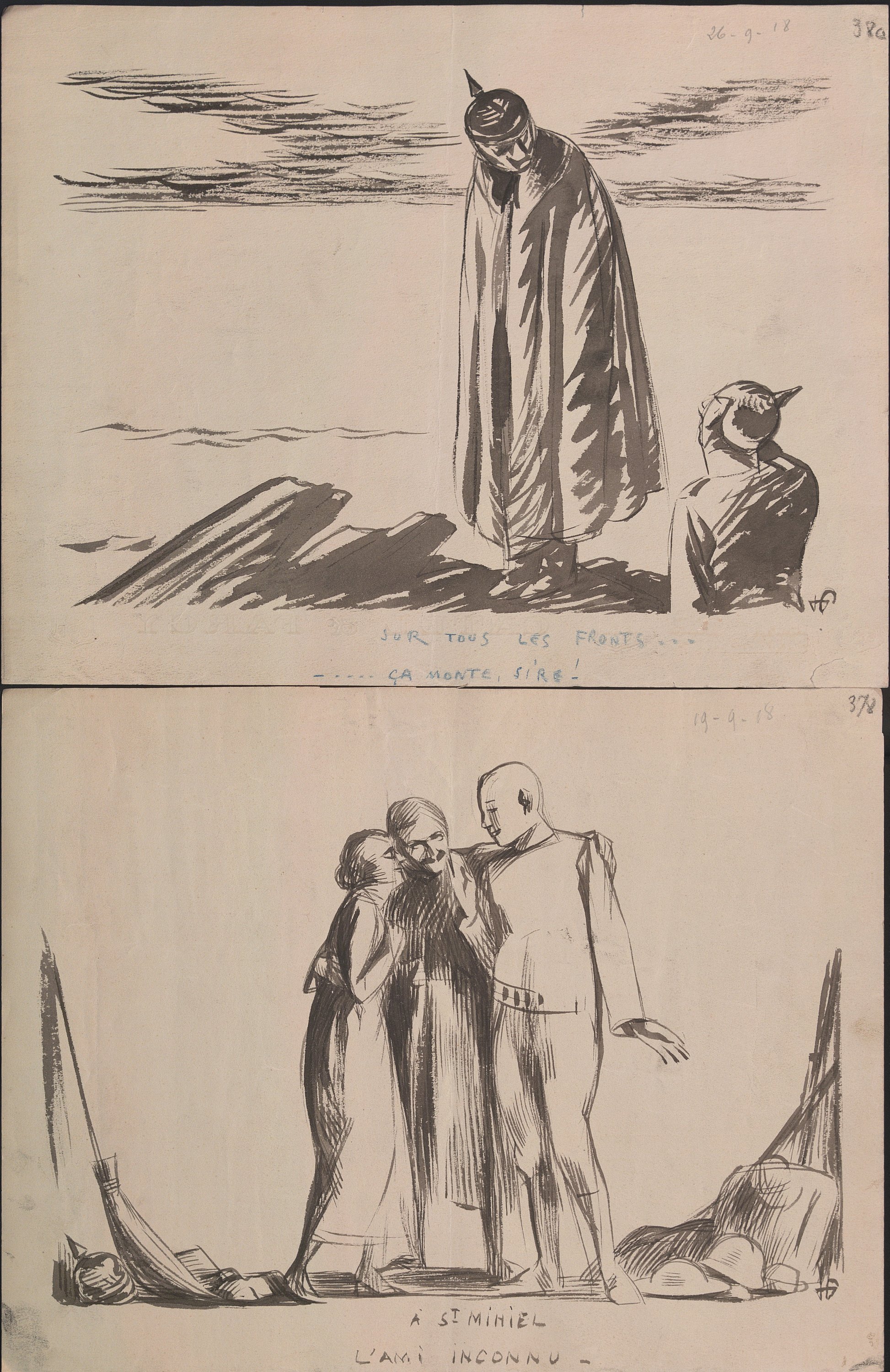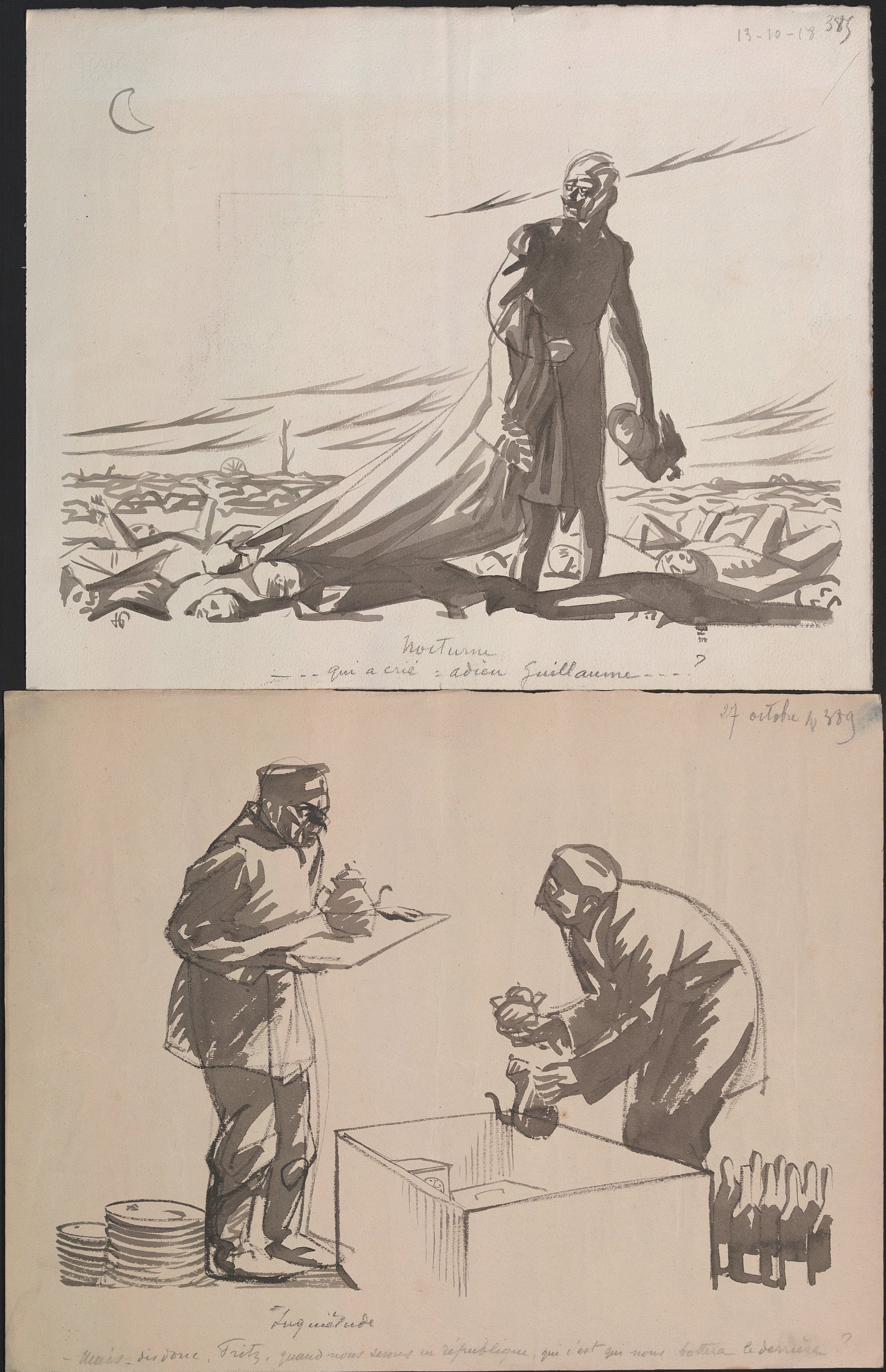 Il s’agit à la fois des ébauches, dessins préparatoires ou maquettes abouties en vue de leur publication dans la presse dont le journal « La Victoire - quotidien révisionniste : organe de la république autoritaire et plébiscitaire » sous la direction de Gustave Hervé paru à partir du 1er janvier 1916.