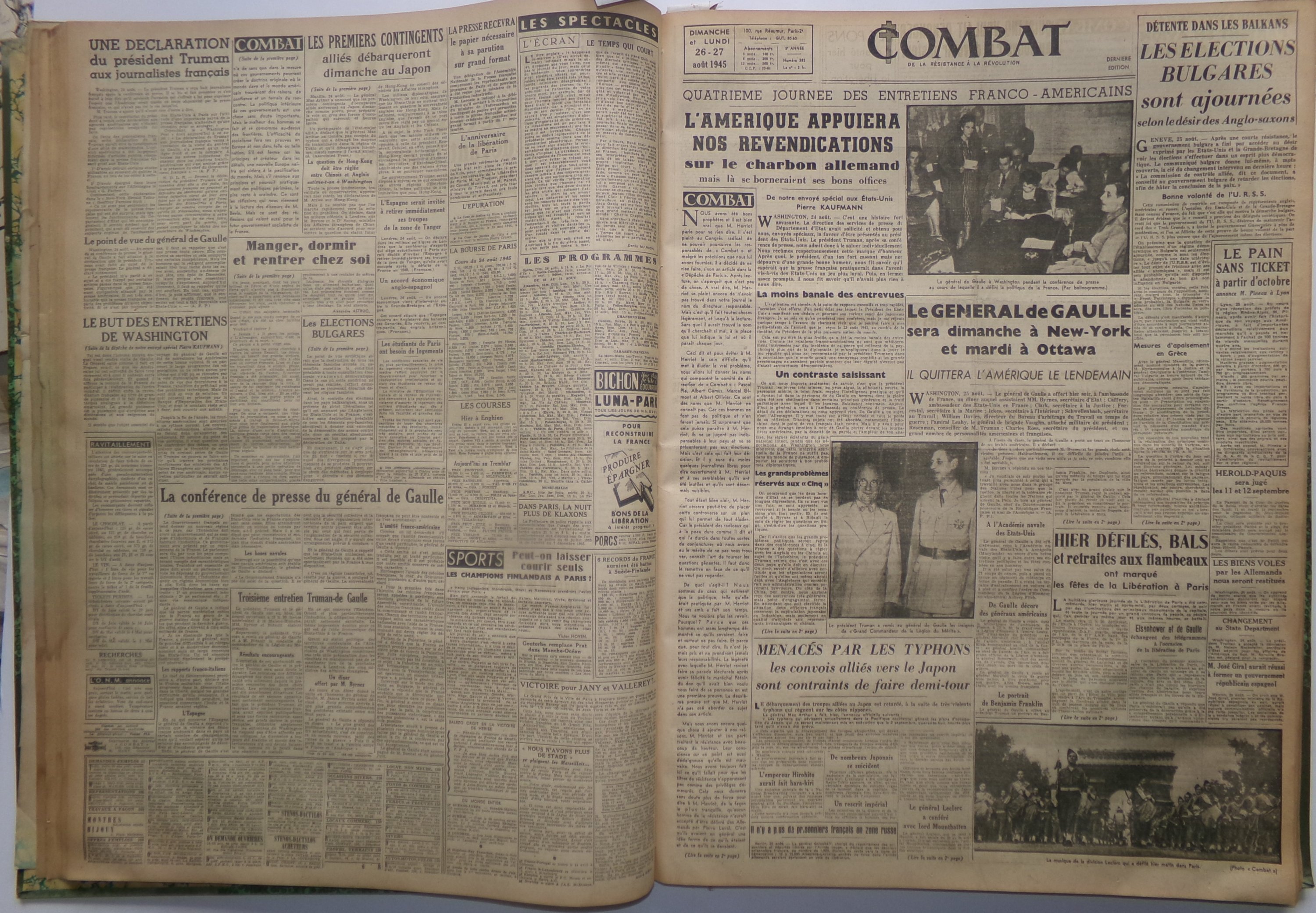 « Combat, de la résistance à la révolution », journal quotidien parisien, n° du 19 mai au 31 décembre 1945 + n° du 27 et 30 mai 1944 et du 8 mai 1945 ;