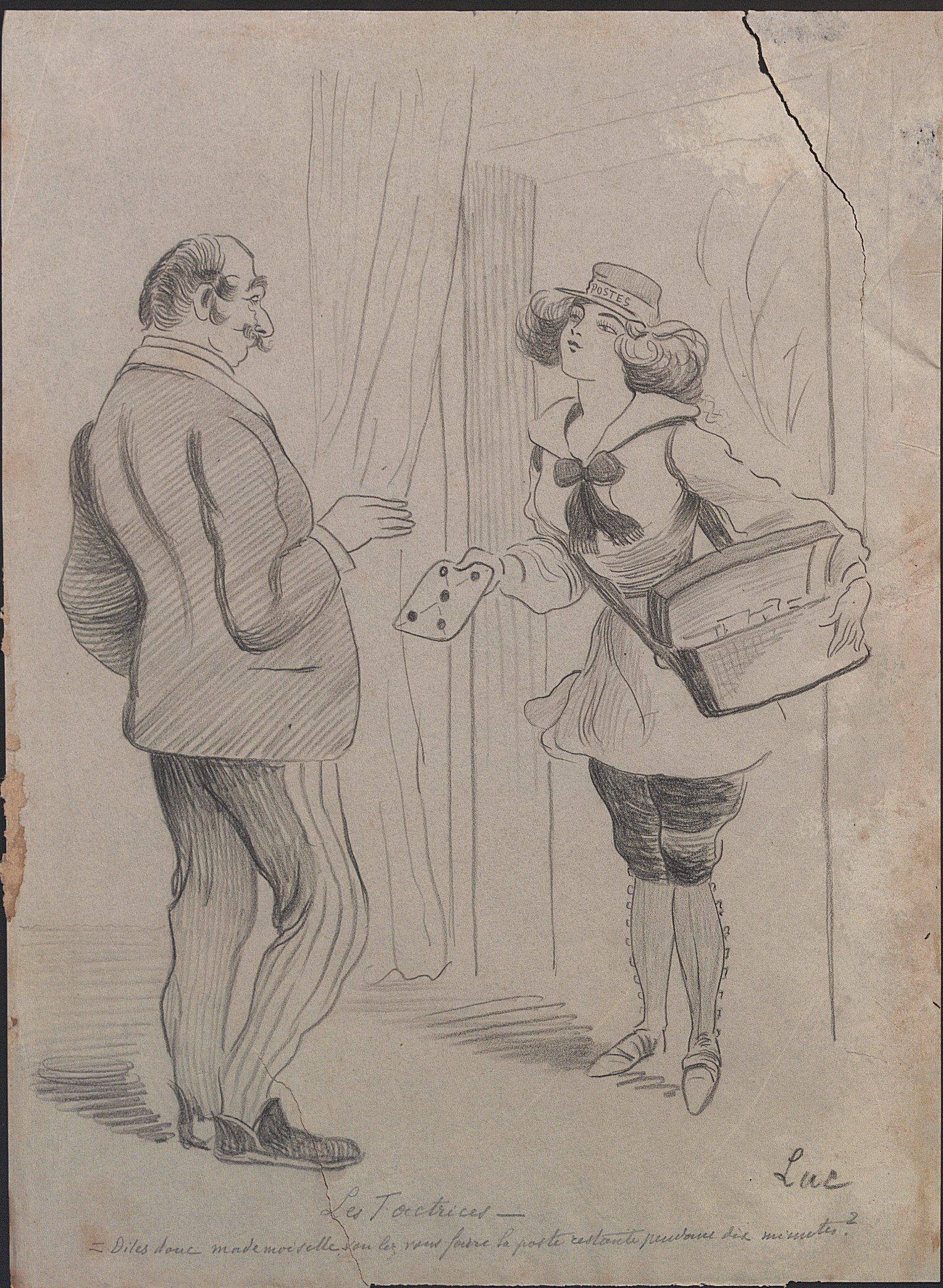 Luc, Les factrices, crayon, signé en bas à droite, titré et légendé « Dites donc mademoiselle voulez-vous faire la poste restante pendant dix minutes ? », 28 x 20,5 cm (déchirures) ;