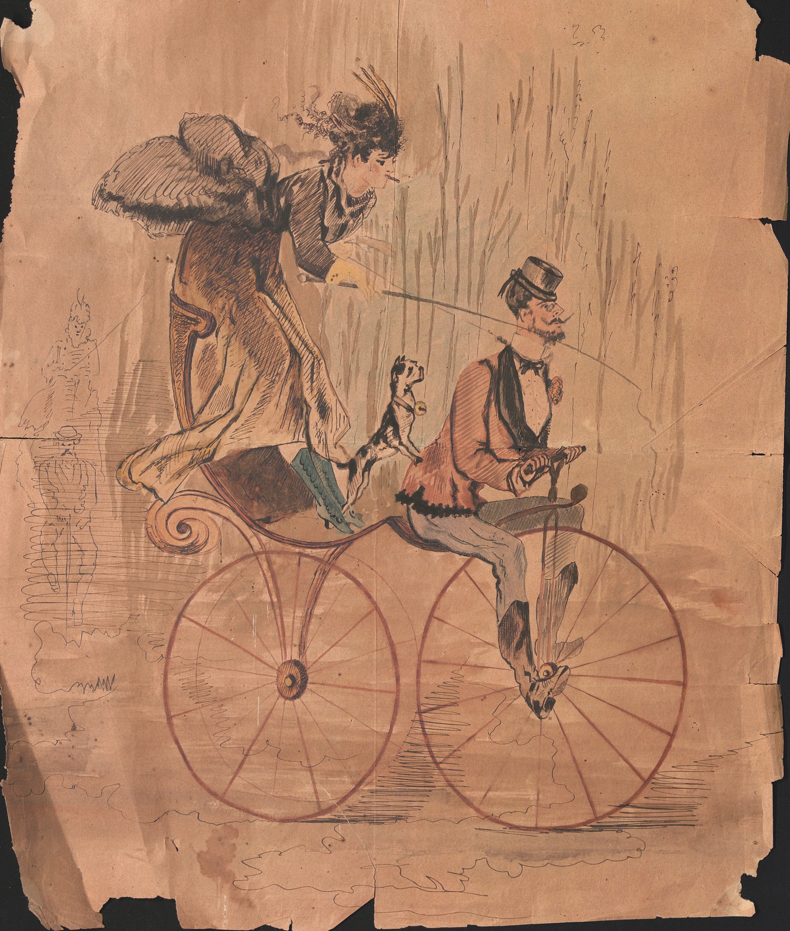 Scène de vélocipède, dans le goût de Gabriel Gostiaux, encre et aquarelle, 35 x 28 cm (accdts) ;