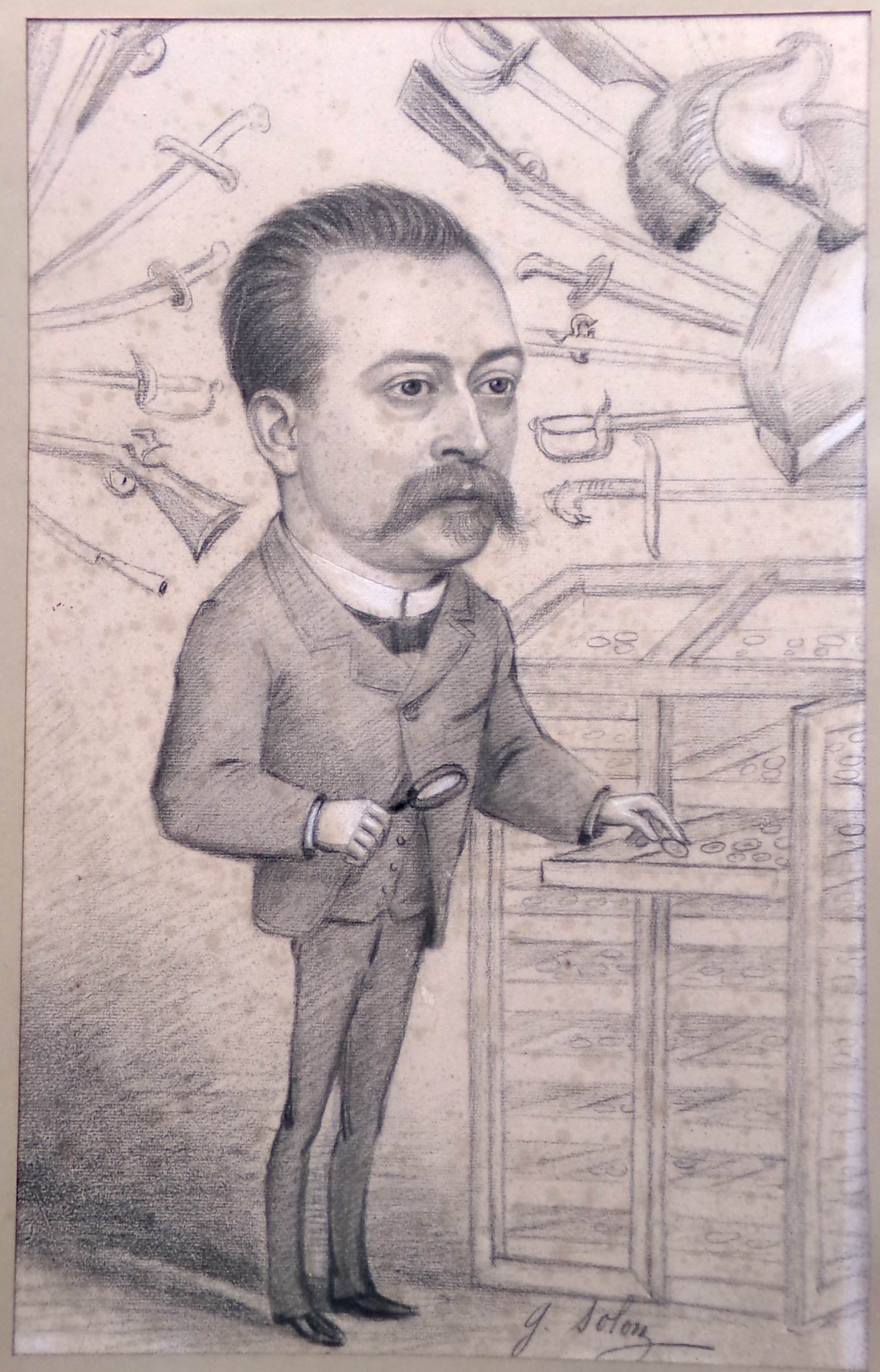 Gustave Solon (1846-1900), Portrait d’un collectionneur d’armes et médailles, pierre noire et rehauts de blanc, signé, 45 x 28 cm ;
