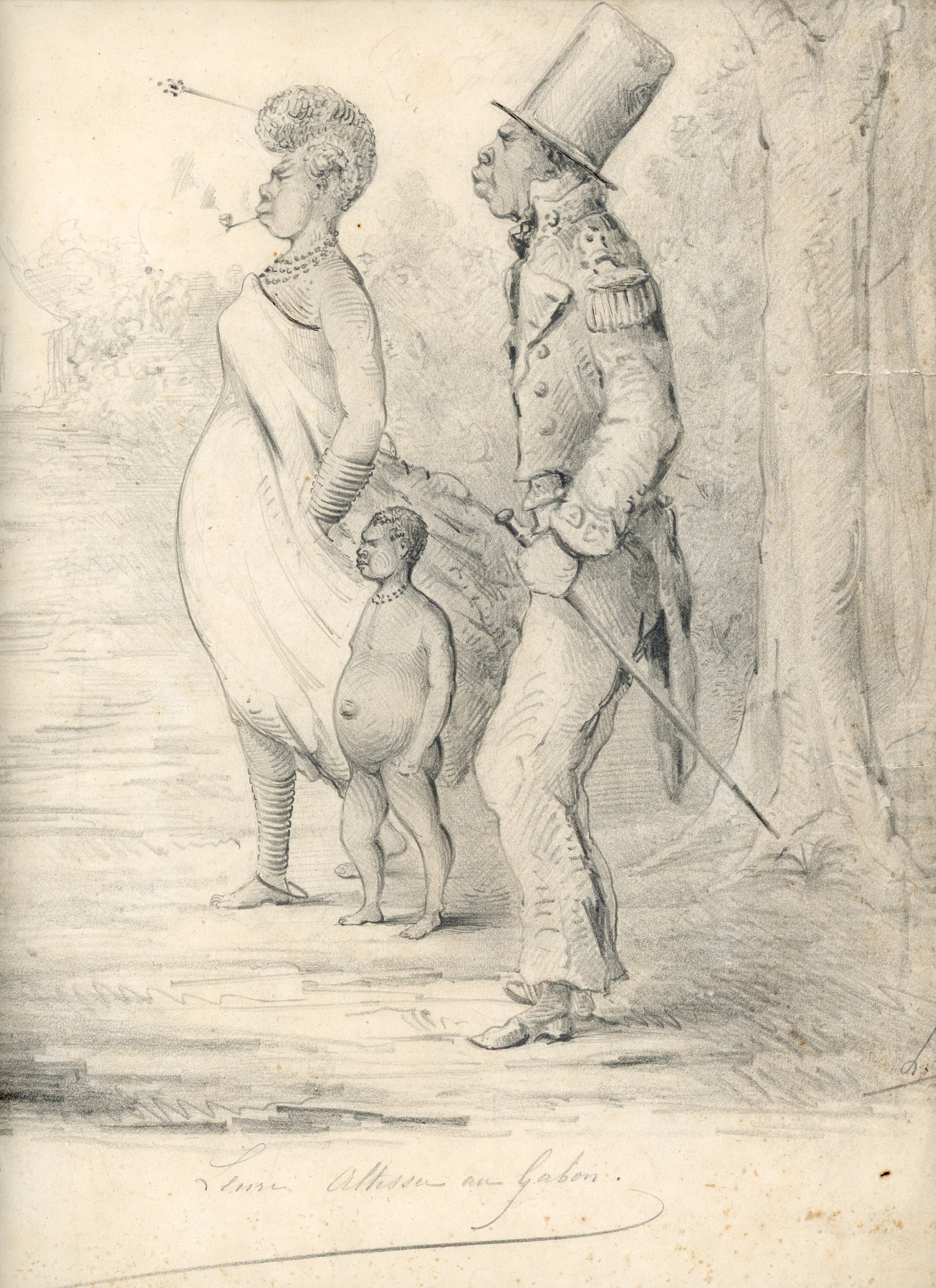« Leurs altesses au Gabon », crayon, signé à droite, 38,5 x 27,5 cm (déchirures marginales) ;