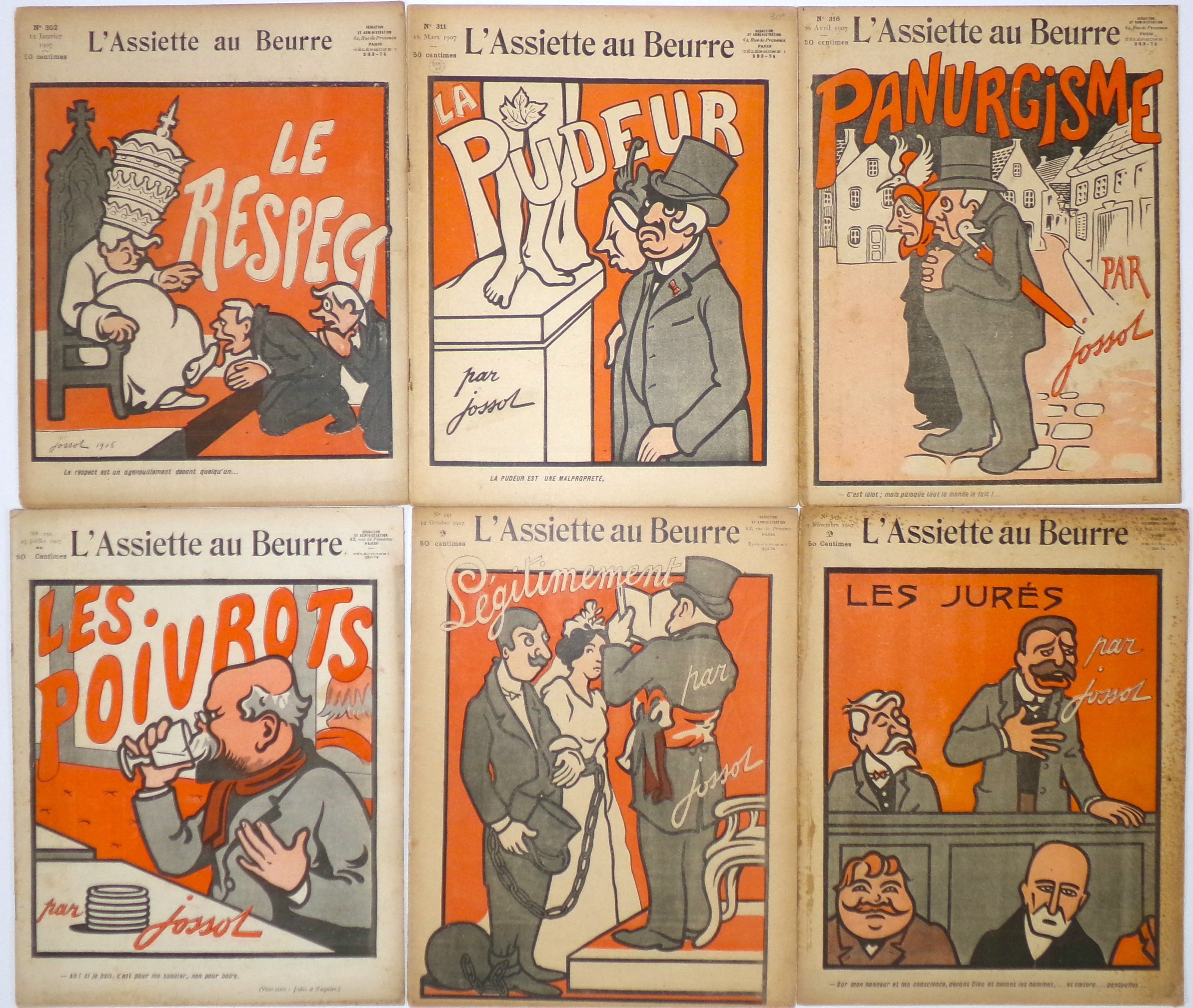 Réunion d’env. 595 numéros de la plus célèbre des revues satiriques et anticonformistes de la Belle-Epoque : L’Assiette au Beurre, publiée à Paris par les Publications modernes, 1901-1912.