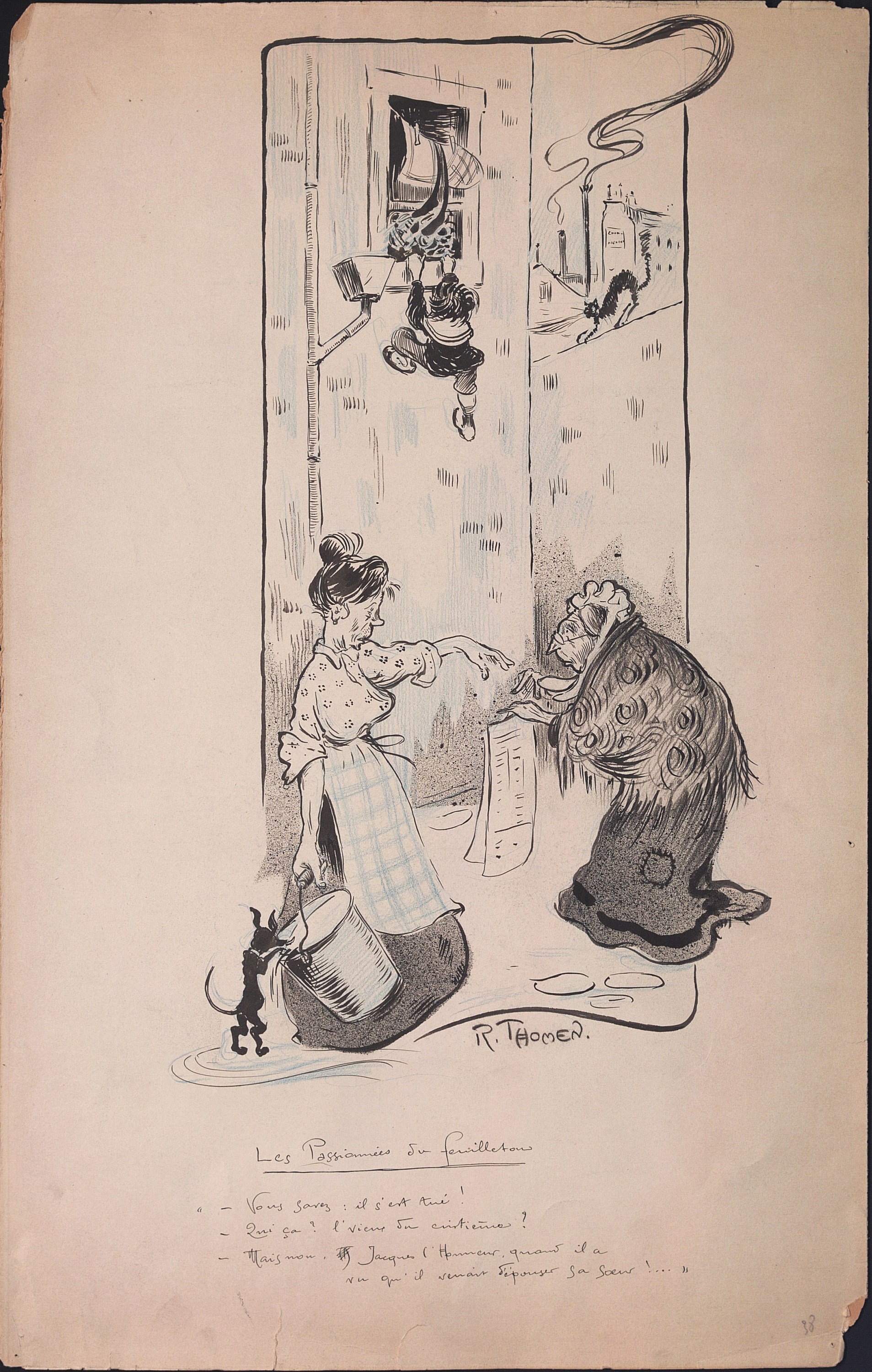 Les passionnées du feuilleton, encre, fusain et crayon bleu, signé en bas au centre, légendé « Vous savez : il s’est tué ! Qui ça ? L’vieux du cintième ? Mais non Jacques l’Honneur, quand il a vu qu’il venait d’épouser sa sœur ! », 50 x 31 cm (petites déchirures en marge) ;