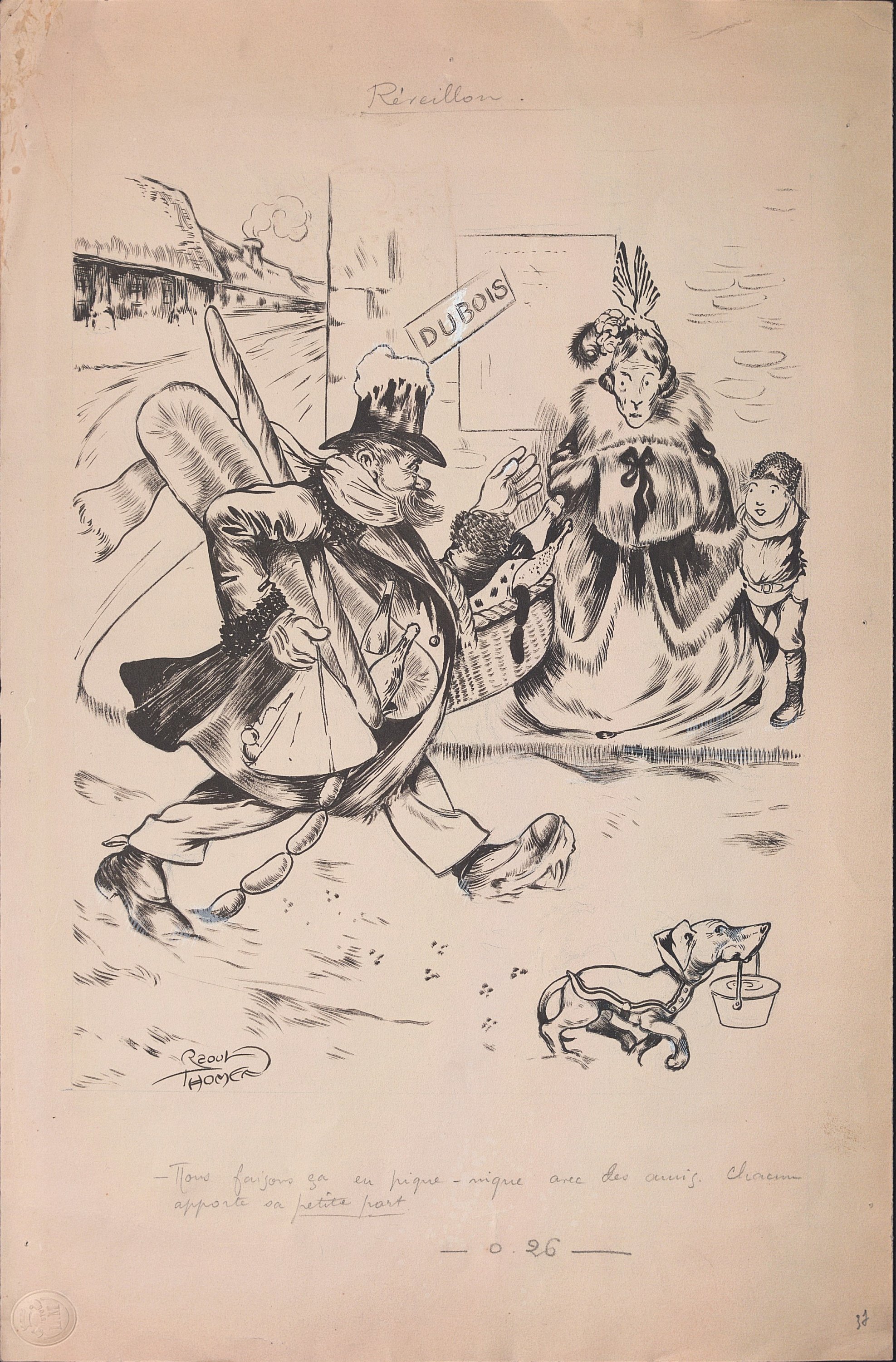 Réveillon, encre, signé en bas à gauche, légendé au crayon « Nous faisons ça en pique-nique avec des amis. Chacun apporte sa petite part », 48 x 31 cm ; publié dans le n°101 Les Hommes du Jour (25 déc. 1901) ;