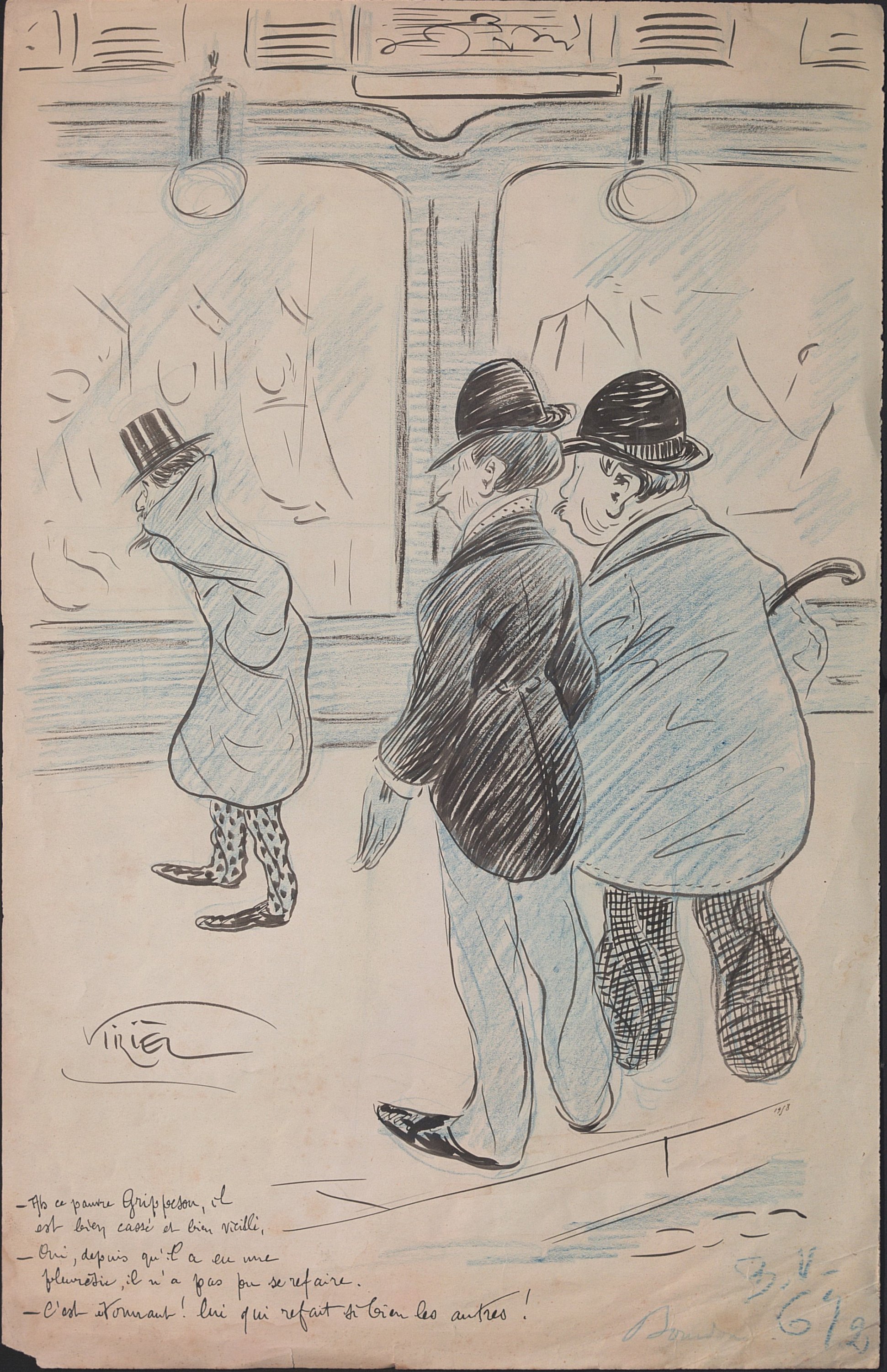 Sans titre, légendé « Ah ce pauvre Grippe-sou, il est bien cassé et bien vieilli Oui depuis qu’il a eu une pleurésie, il n’a pas pu se refaire. c’est étonnant ! lui qui refait si bien les autres ! », 44 x 28 cm (petites déchirures et petit manque en marge).