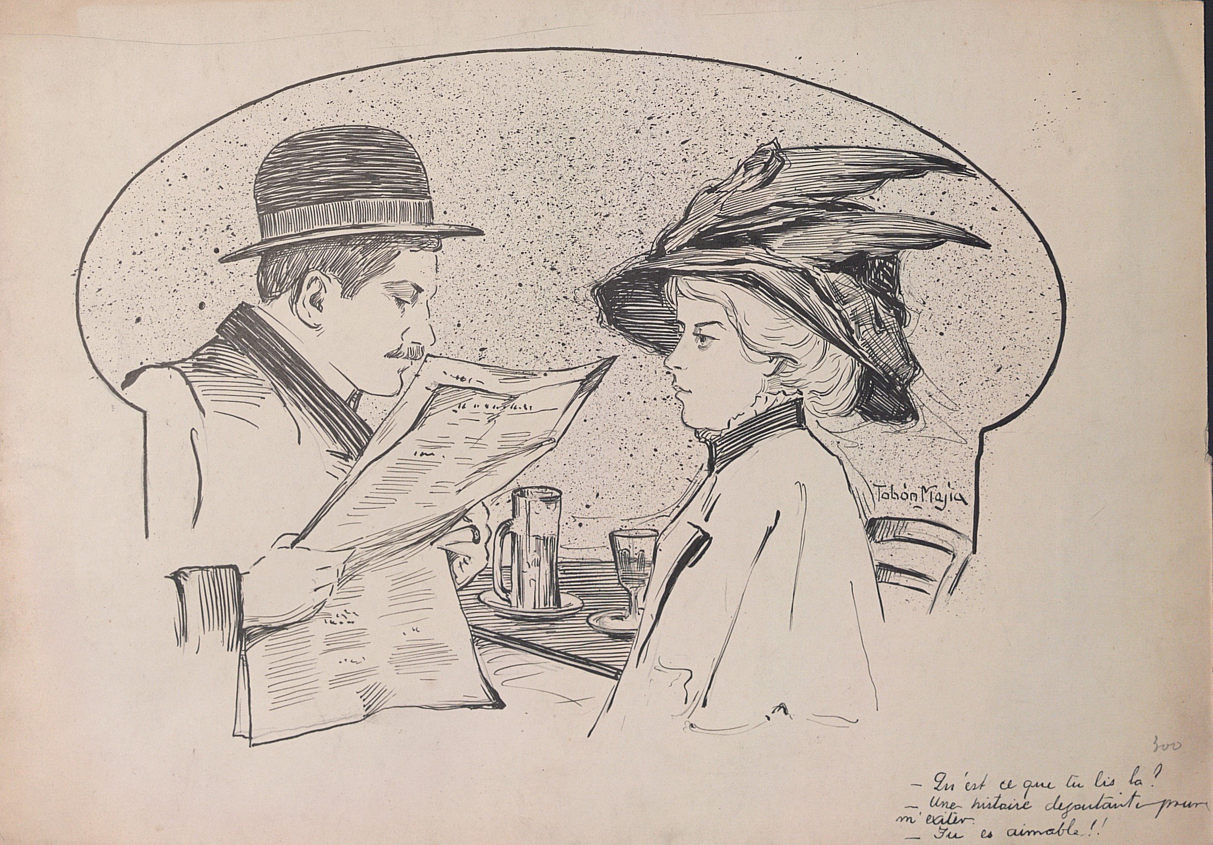 Sans tire, encre, signé à droite, légendé « Qu’est-ce que tu lis là ? Une histoire dégoutante pour m’exciter. Tu es aimable !! », 24,5 x 33,5 cm.