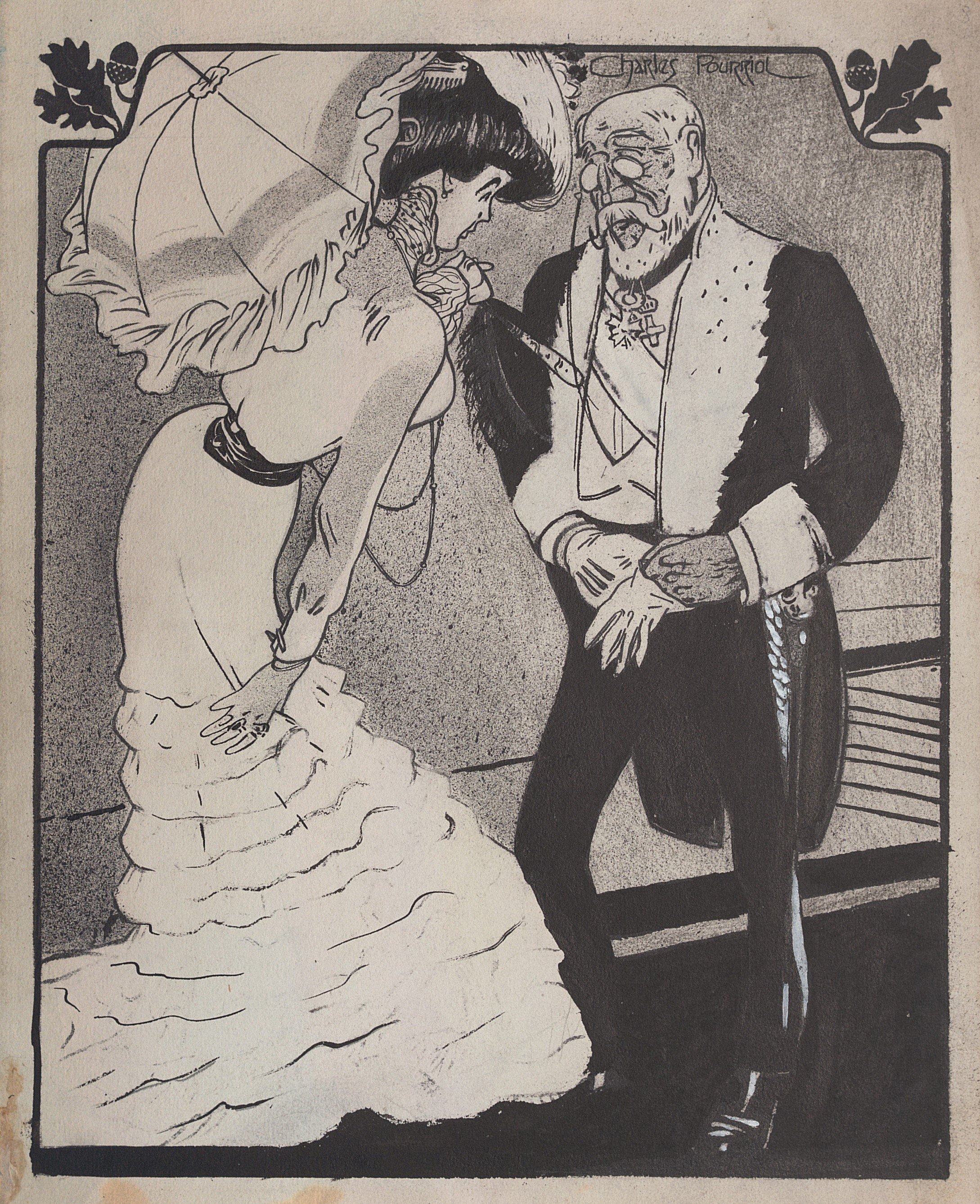 Sans titre, encre et fusain, signé en haut à droite « Charles Pourriol », légendé au dos « Mais mon cher maître, comment avez-vous imaginé le traître de votre nouvelle pièce, c’est un vrai chef d’œuvre. Je n’ai eu à imaginer qu’un homme avec tous les défauts que ma belle-mère me donne », 37 x 30 cm ;
