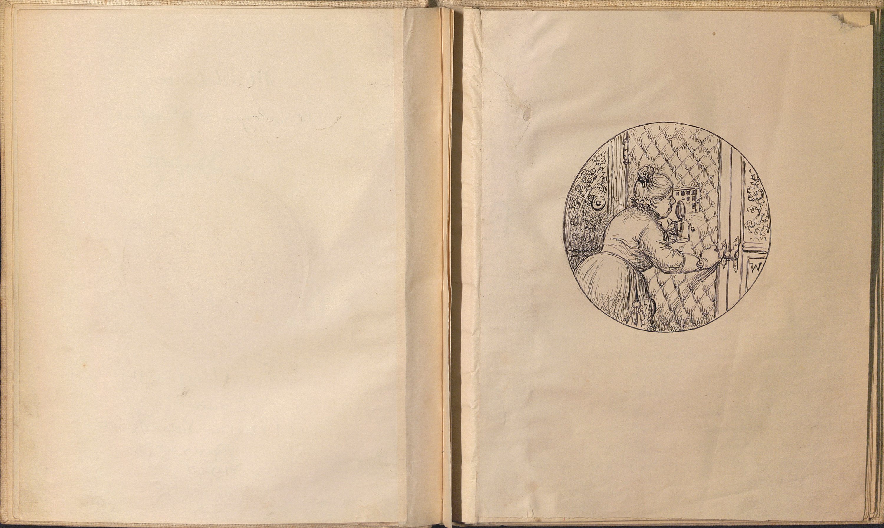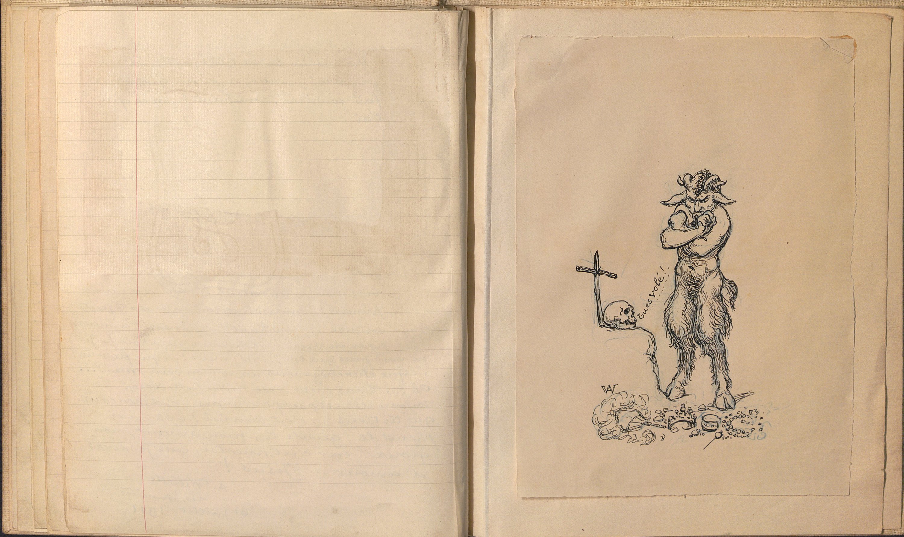 Madeleine, Monologue et 9 dessins. Manuscrit autographe avec dessins à l’encre et rehauts de crayons de couleurs contrecollés. In-8, 10 pp., montées sur onglet, toile blanche. Maquette pour l’édition en fac-similé, signée et datée en fin « Les Epinettes, 31 juillet 1911 ». Il est illustré de 9 dessins à la plume dont 5 rehaussés à l’aquarelle et au lavis.