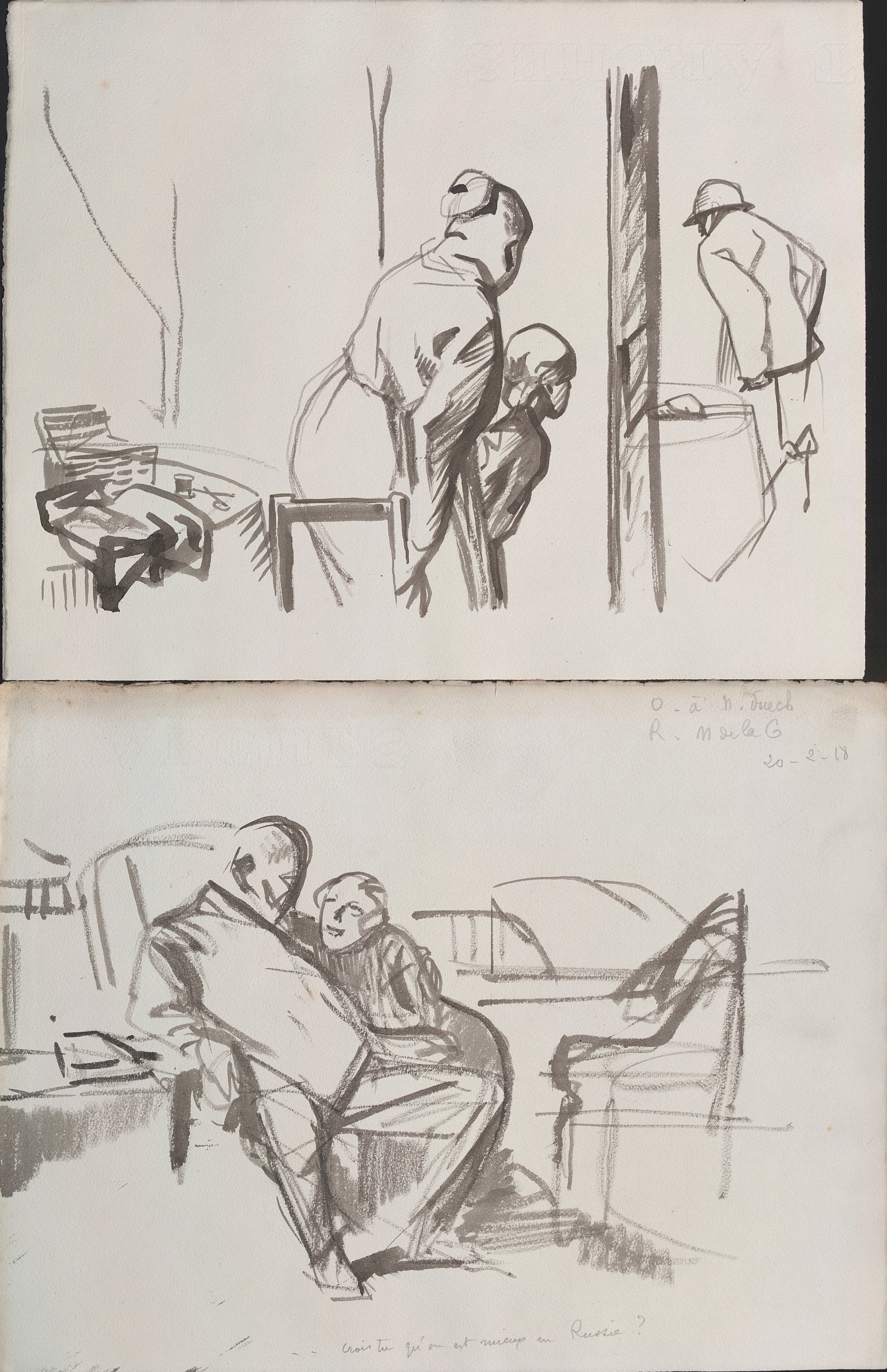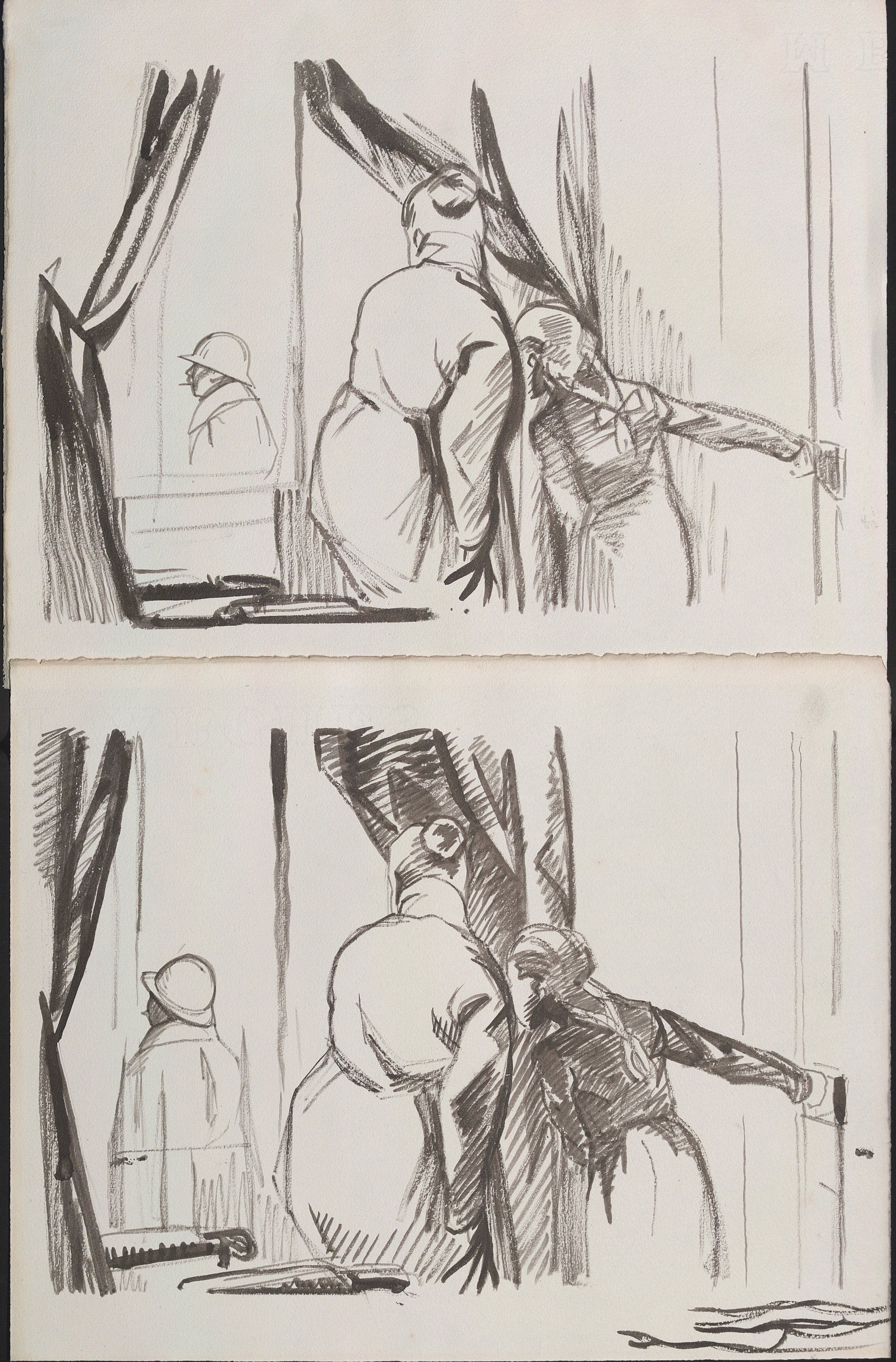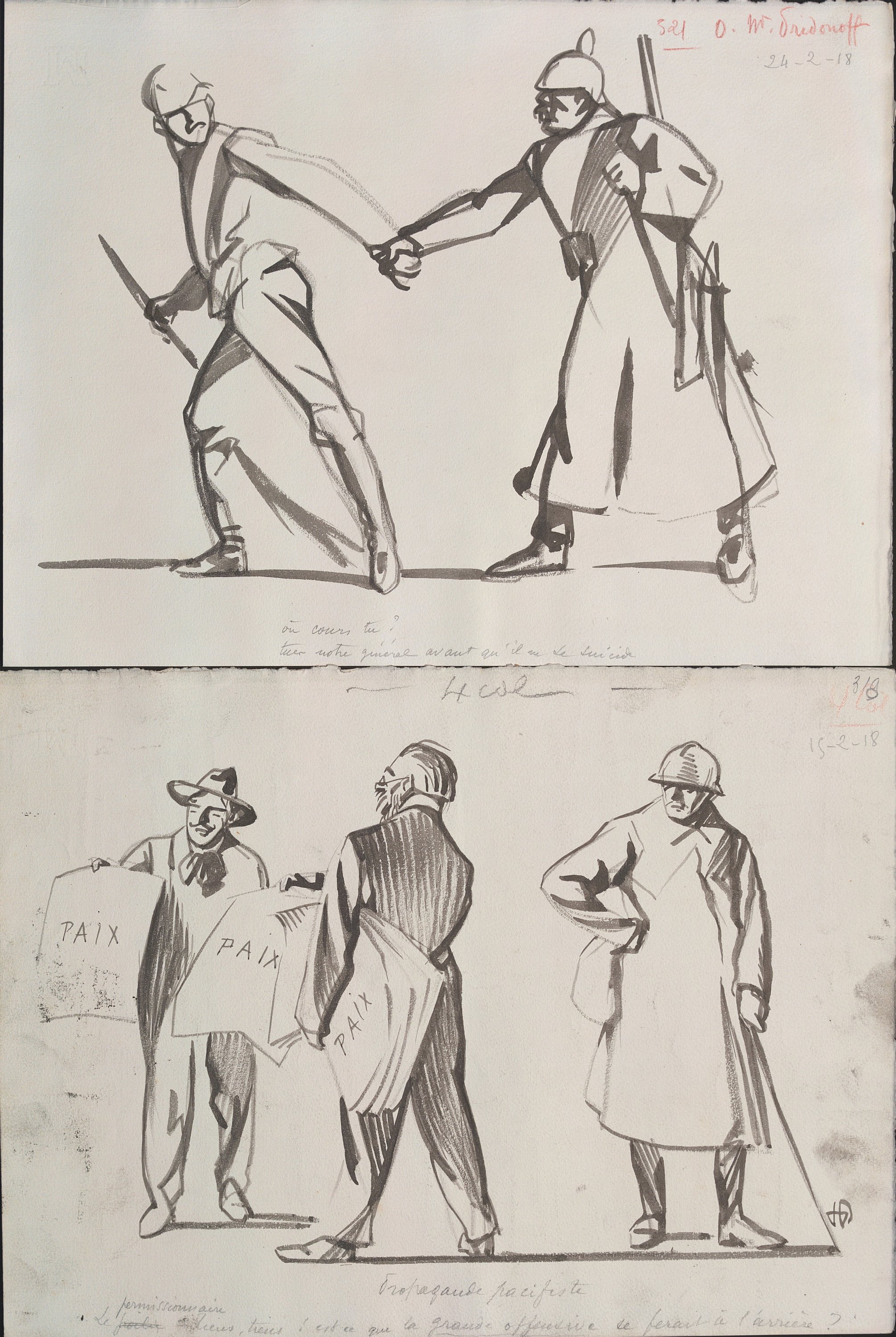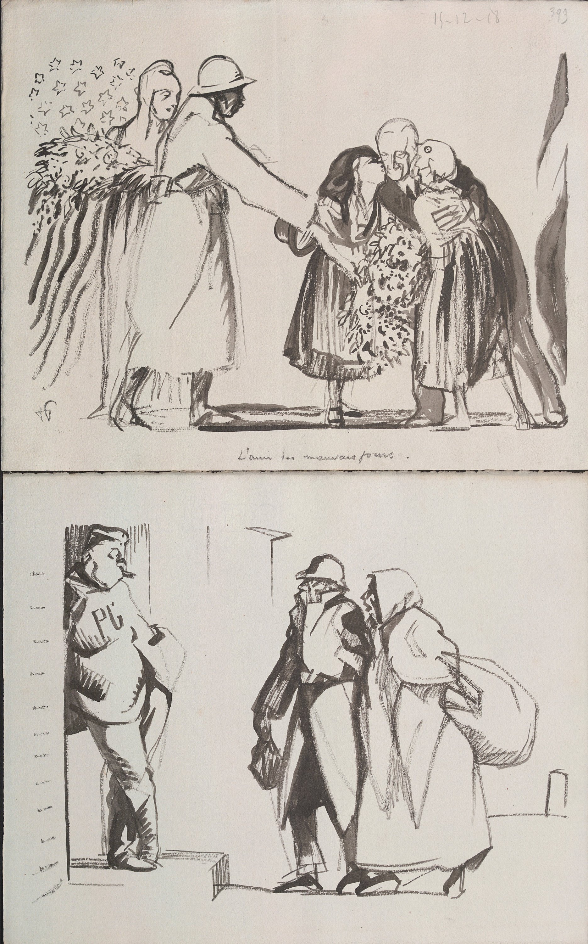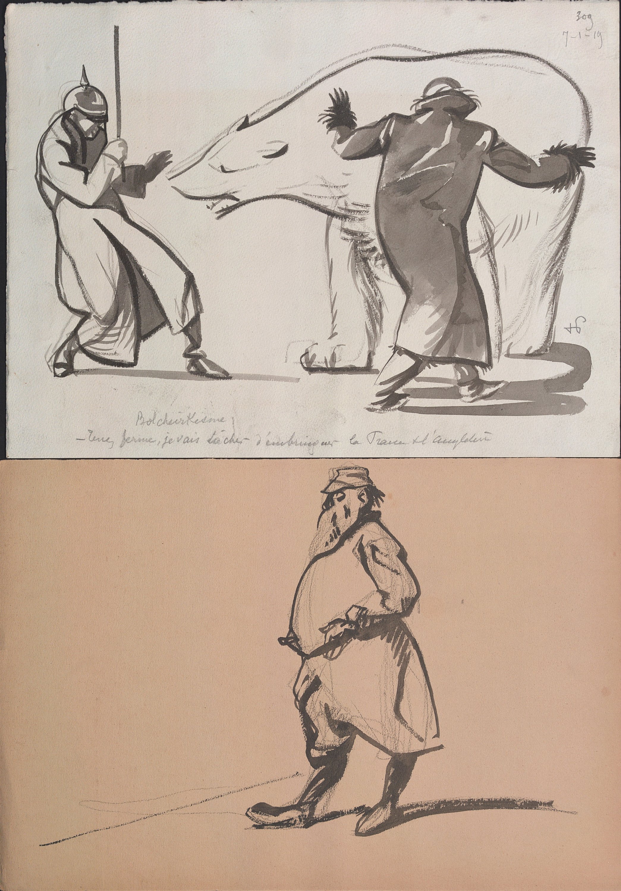 Il s’agit à la fois des ébauches, dessins préparatoires ou maquettes abouties en vue de leur publication dans la presse dont le journal « La Victoire - quotidien révisionniste : organe de la république autoritaire et plébiscitaire » sous la direction de Gustave Hervé paru à partir du 1er janvier 1916.