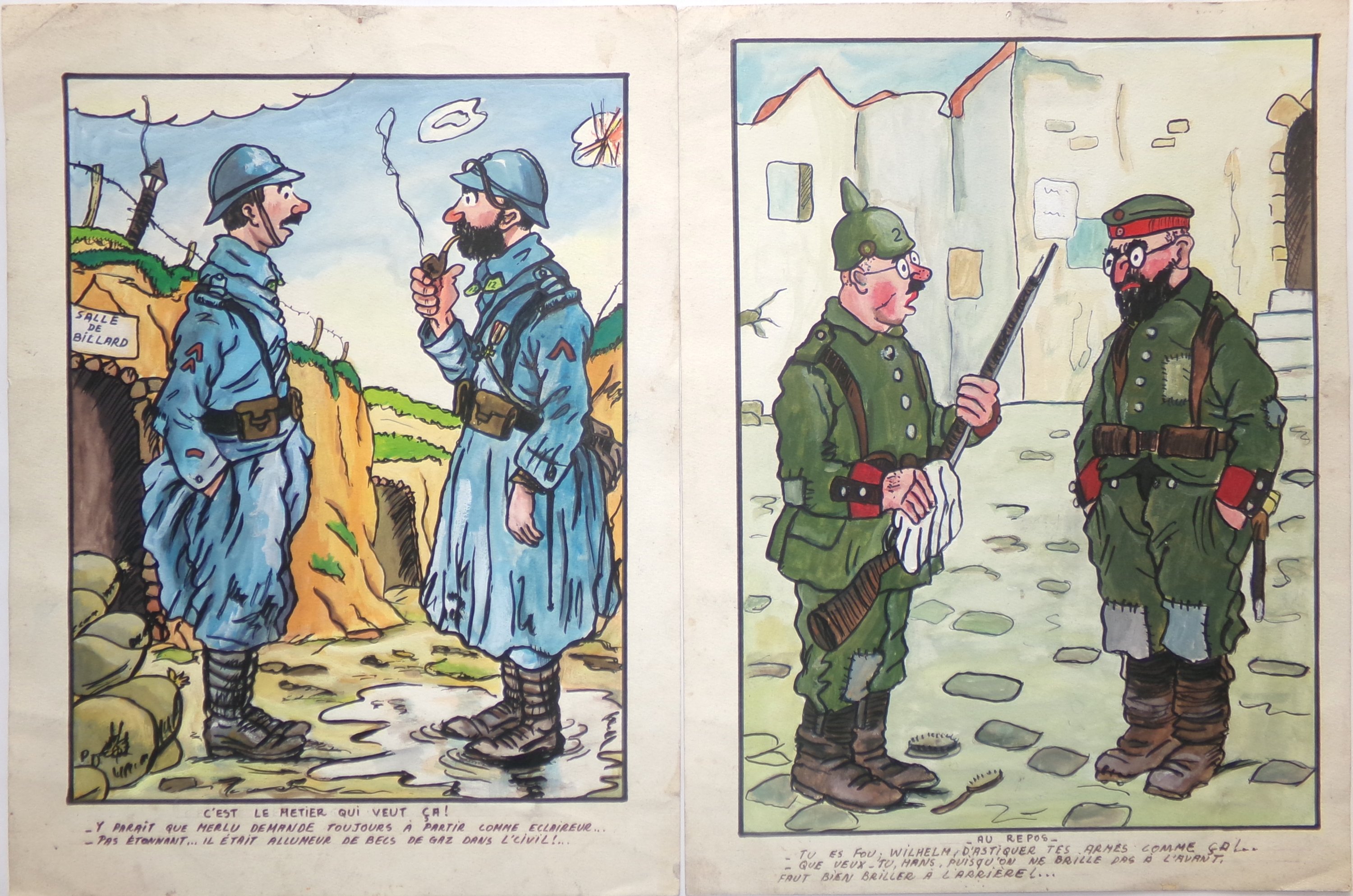 Dont 2 dessins, Combat de tranchée et Travaux forcés daté 1916 et signé en bas à droite Georges Scoté (1884-1971), fait prisonnier en Allemagne d’oct. 1914 à janv. 1919, 46,5 x 38,5 cm et 39 x 57 cm ; 2 scènes humoristiques, titrées et légendées, « Au repos » et « C’est le métier qui vaut ça ! », dont un signé « P.D. », 32 x 24 cm ; etc.