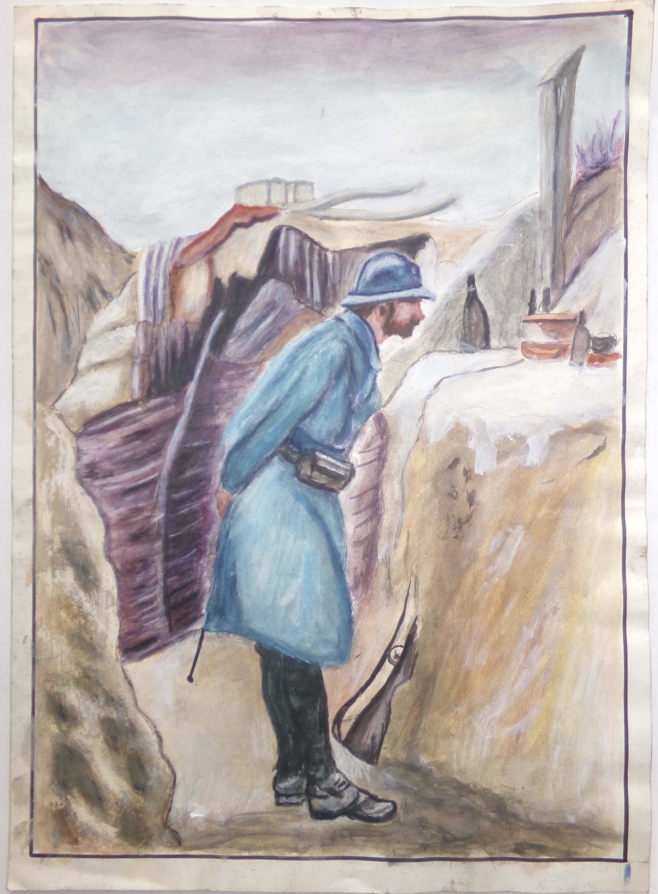 Lot de 10 dessins de poilus, formats divers, encre, fusain, aquarelle et gouache.
