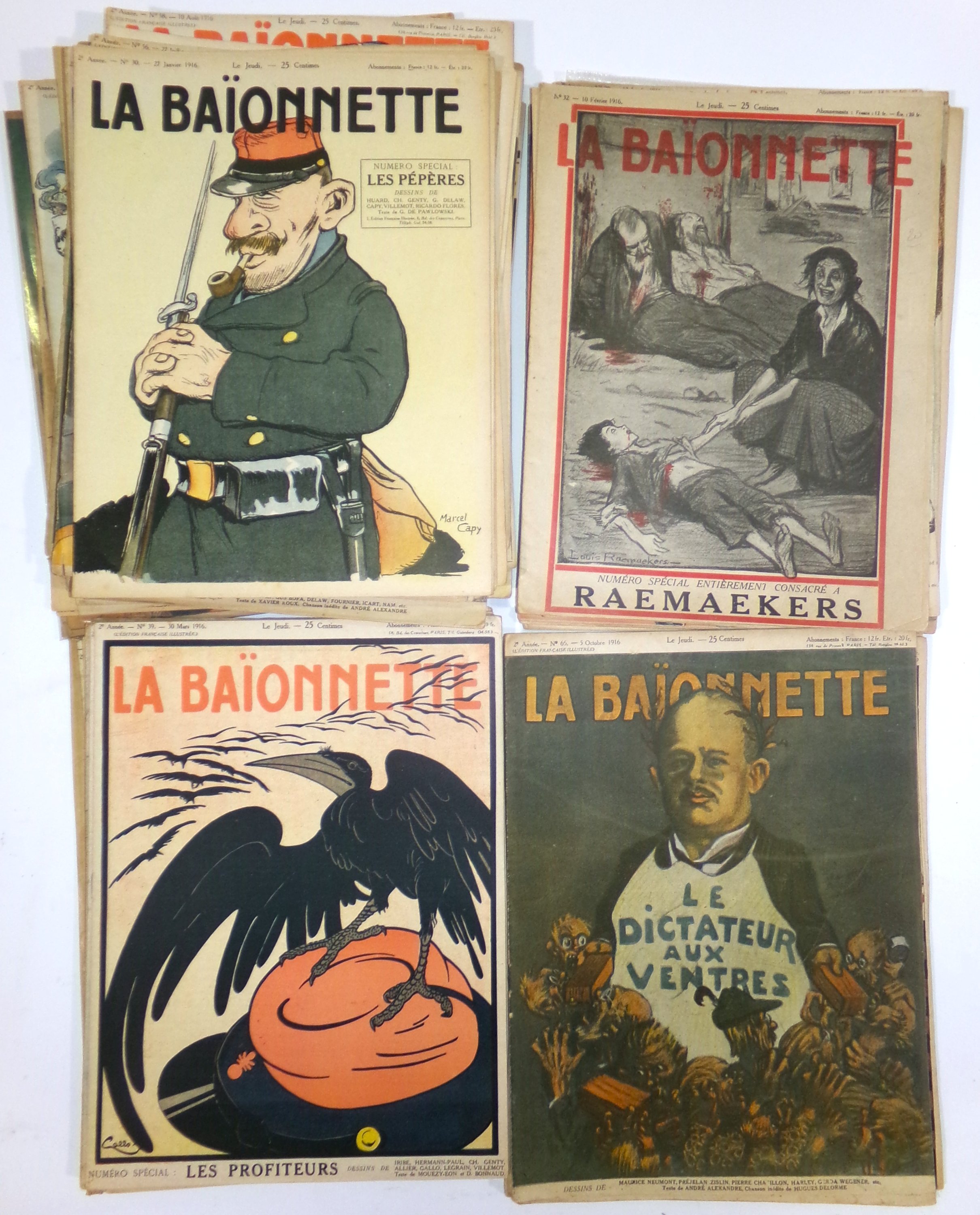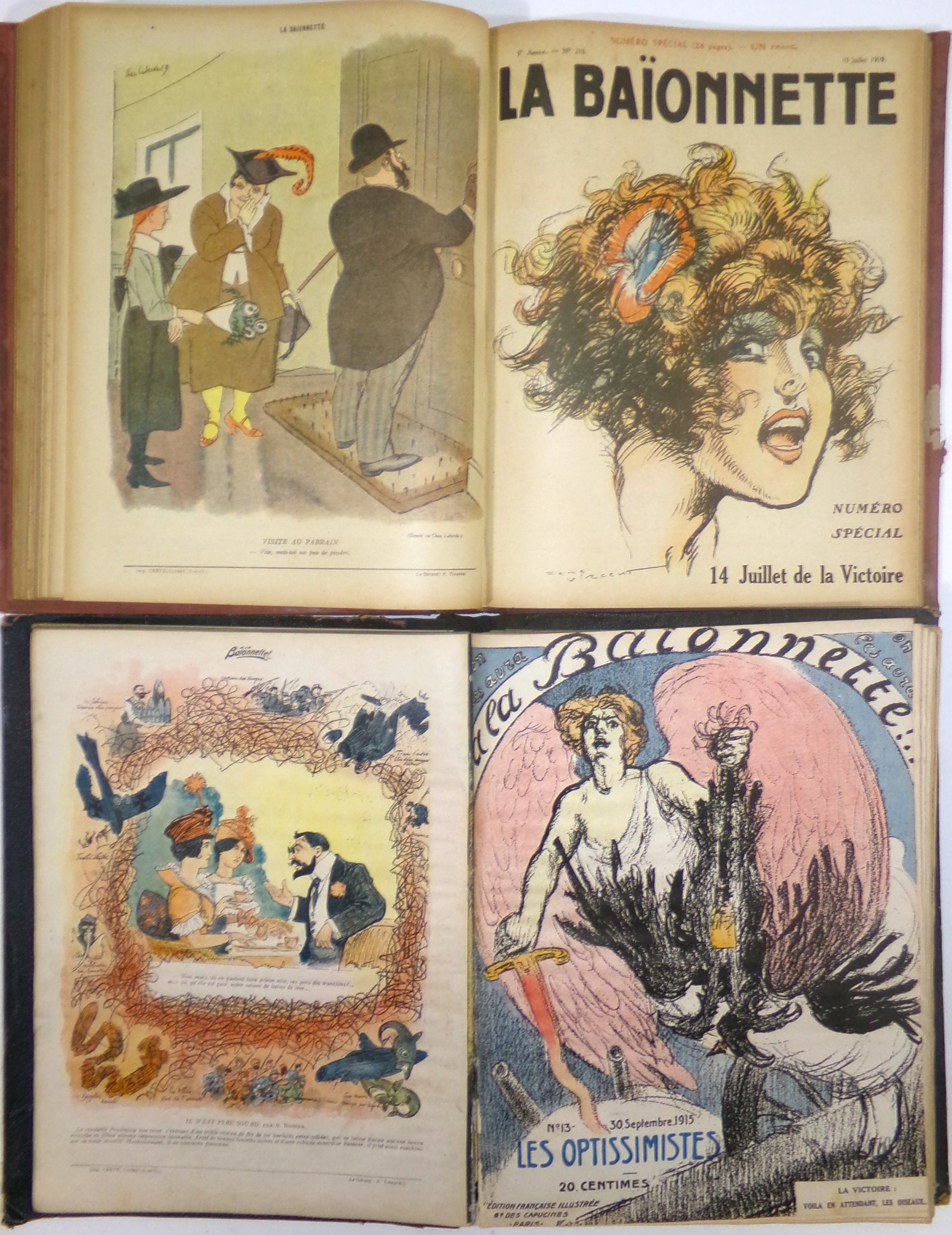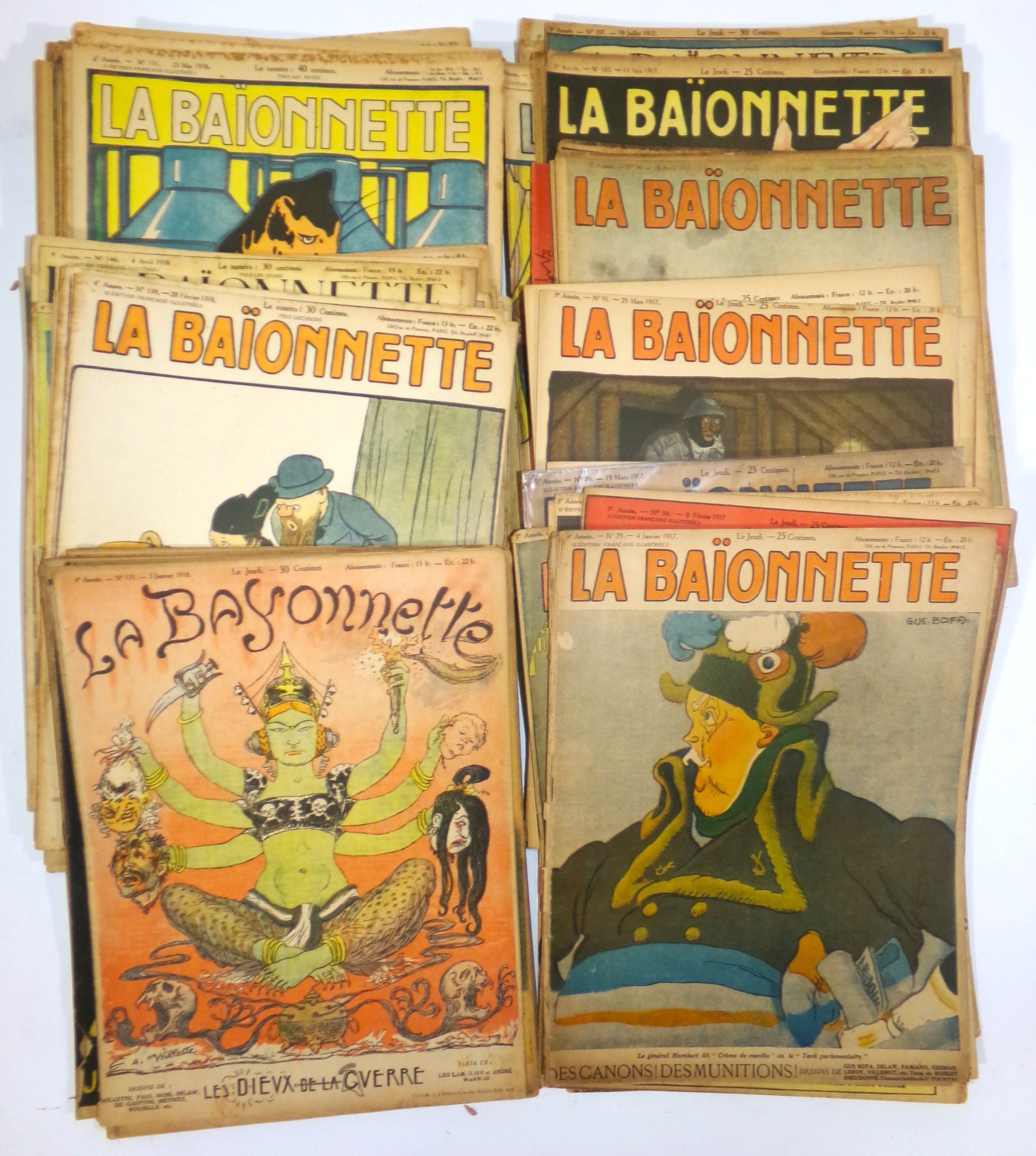 (1 vol.) « A La Baïonnette » : n°1 (23 janvier 1915) au n°23 (26 juin 1915) (mque 8) ; « A la Baïonnette » nouvelle série : n°1 (8 juil. 1915) au n°4 (29 juil. 1915) (mque 5) ; « La Baïonnette », n°6 (12 août 1915) au n°20 (18 nov. 1915), incomplet ;