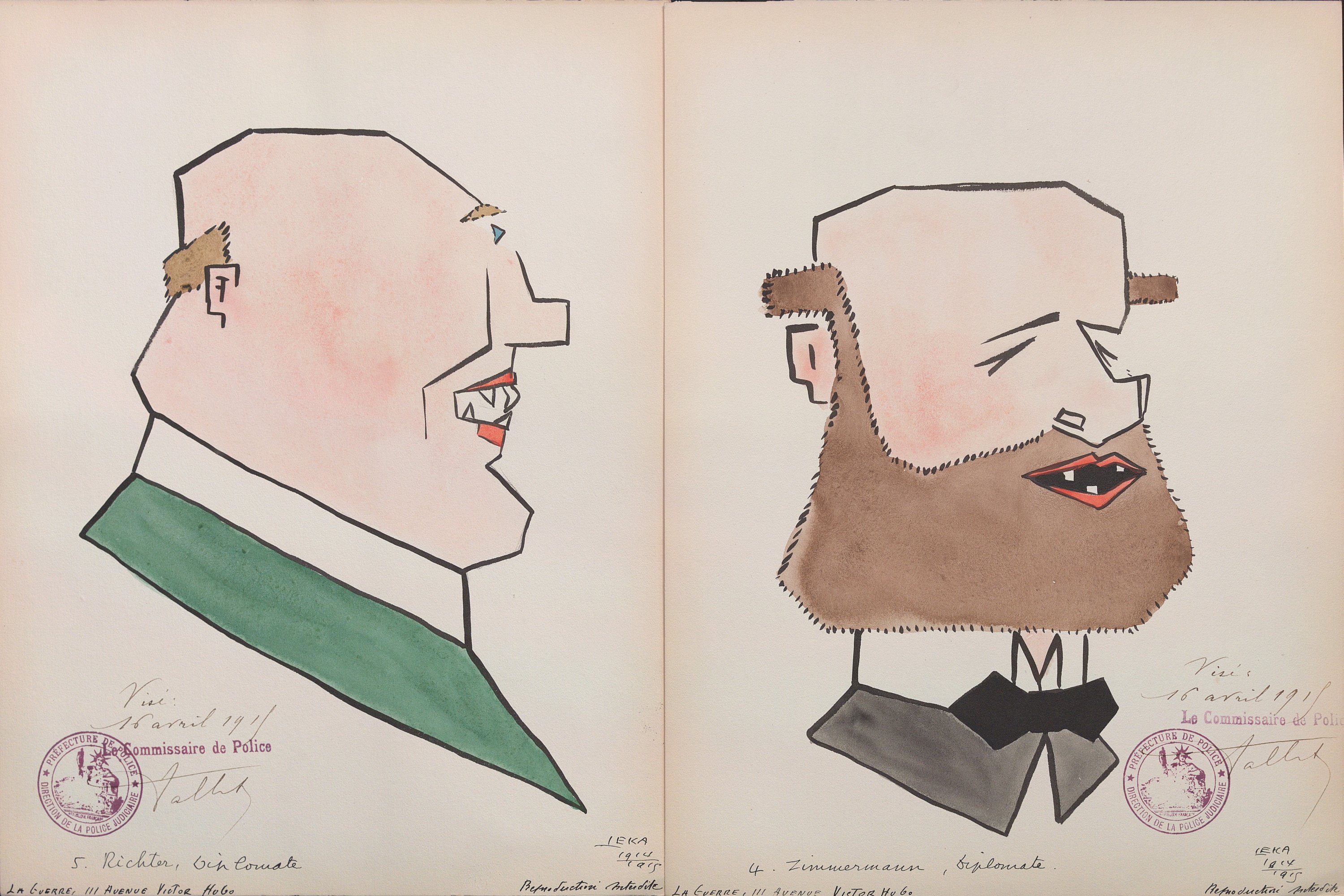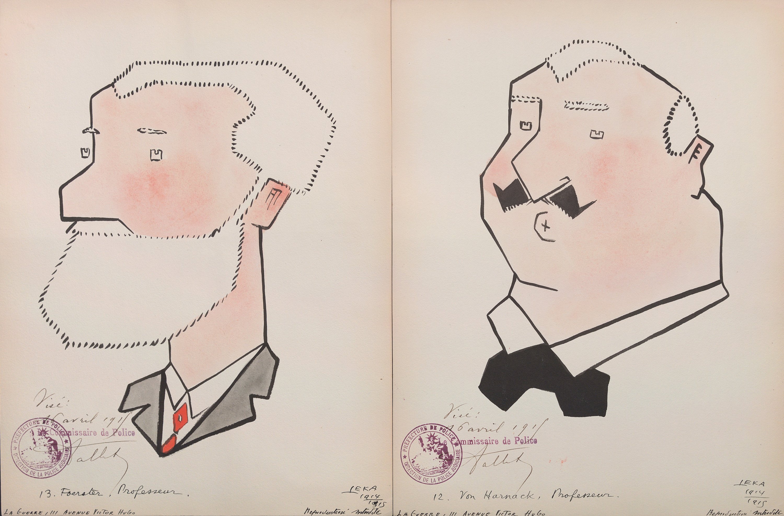 Harry Leka, Leurs intellektuels kubistés par Leka, 16 portraits caricaturés, encre et aquarelle, signés, datés 1914-1915, légendés, chacun portant le visa du commissaire de police de Paris du 16 avril 1915, 31,5 x 23,5 cm ; portraits cubistes de personnalités allemandes ;