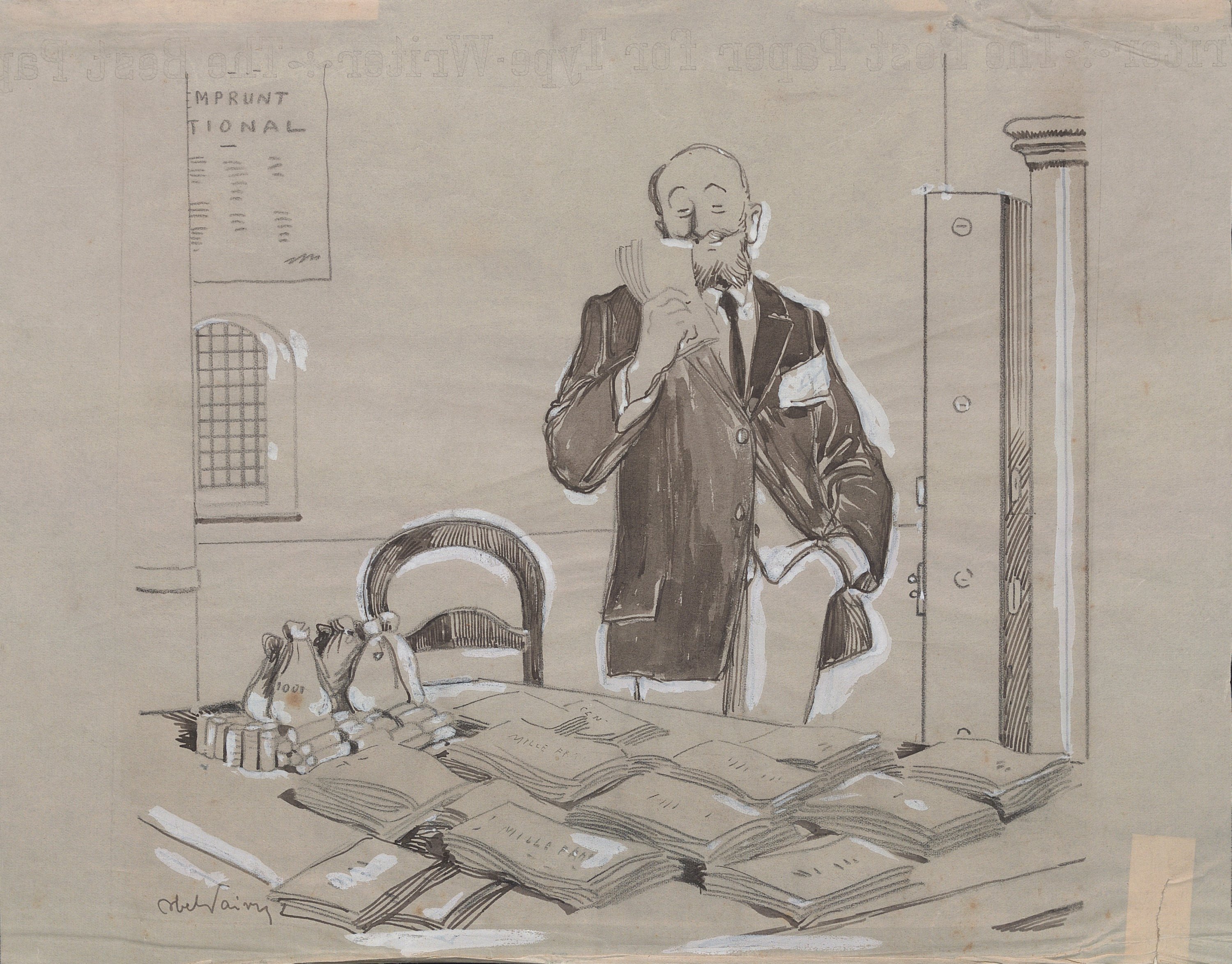Maurice Bourguignon (1877-1925), Au ministère de la guerre, encre, signé, 50 x 32 cm (petites déchirures en marge, rousseurs) ;