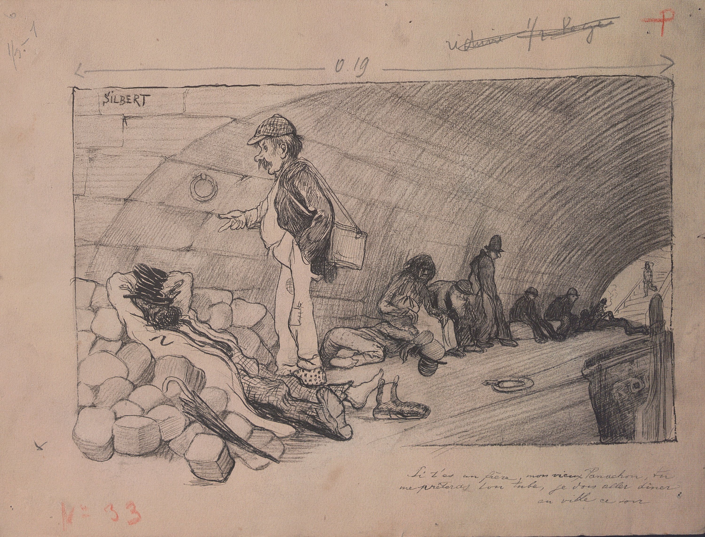 Ben Silbert (1893-1940), encre et crayon, signé, légendé « Si t’es un frère, mon vieux Panachon, tu me prêteras ton tube, je dois aller diner en ville ce soir », 25 x 32,5 cm ;
