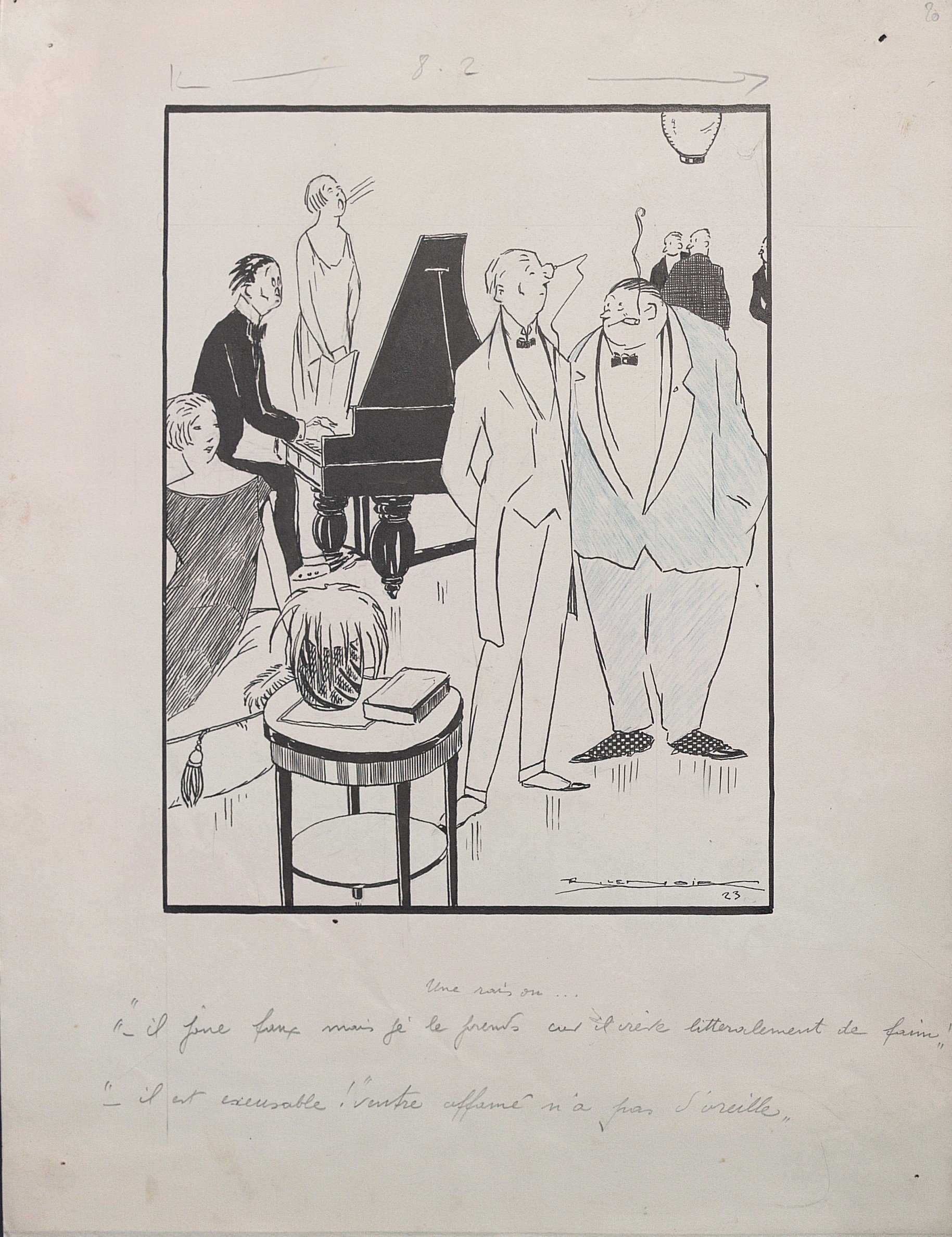 Robert Lenoir, Une raison, encre, signé, légendé « Il joue faux mais je le prends car il crève littéralement de faim ! Il est excusable ! ventre affamé n’a pas d’oreille », 33 x 25,5 cm ;