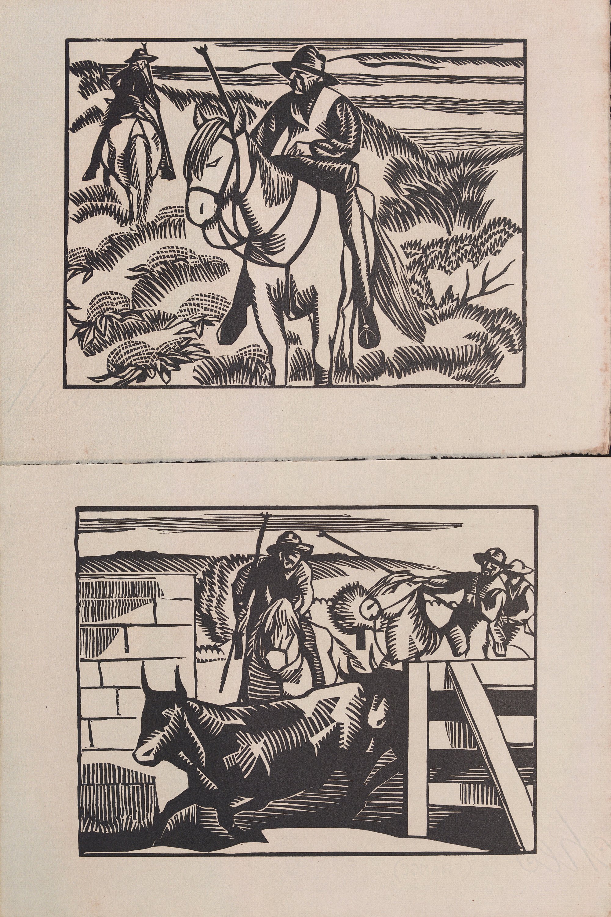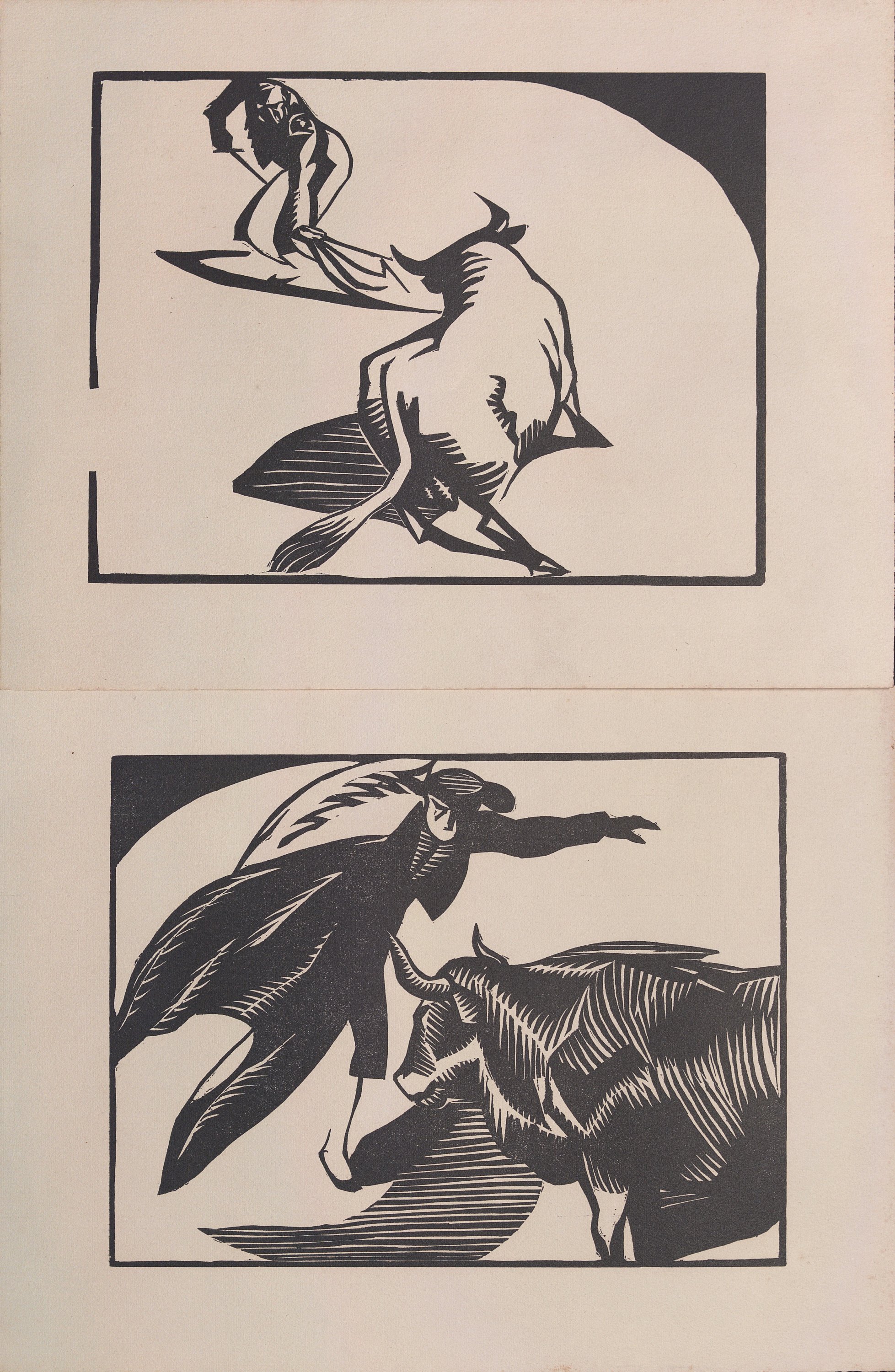 8 scènes sur le thème de la Camargue gravées sur papier épais : taureaux, gardians et tauromachie, vers 1930, env. 25 x 32 cm. Hermann-Paul s’installa à la fin de sa vie aux Saintes-Maries-de-la-Mer, retrouvant ses racines provençales et son amour pour la Camargue, auprès de ses amis manadiers le poète Joseph d’Arbaud et l’écrivain Folco de Baroncelli-Javon ;