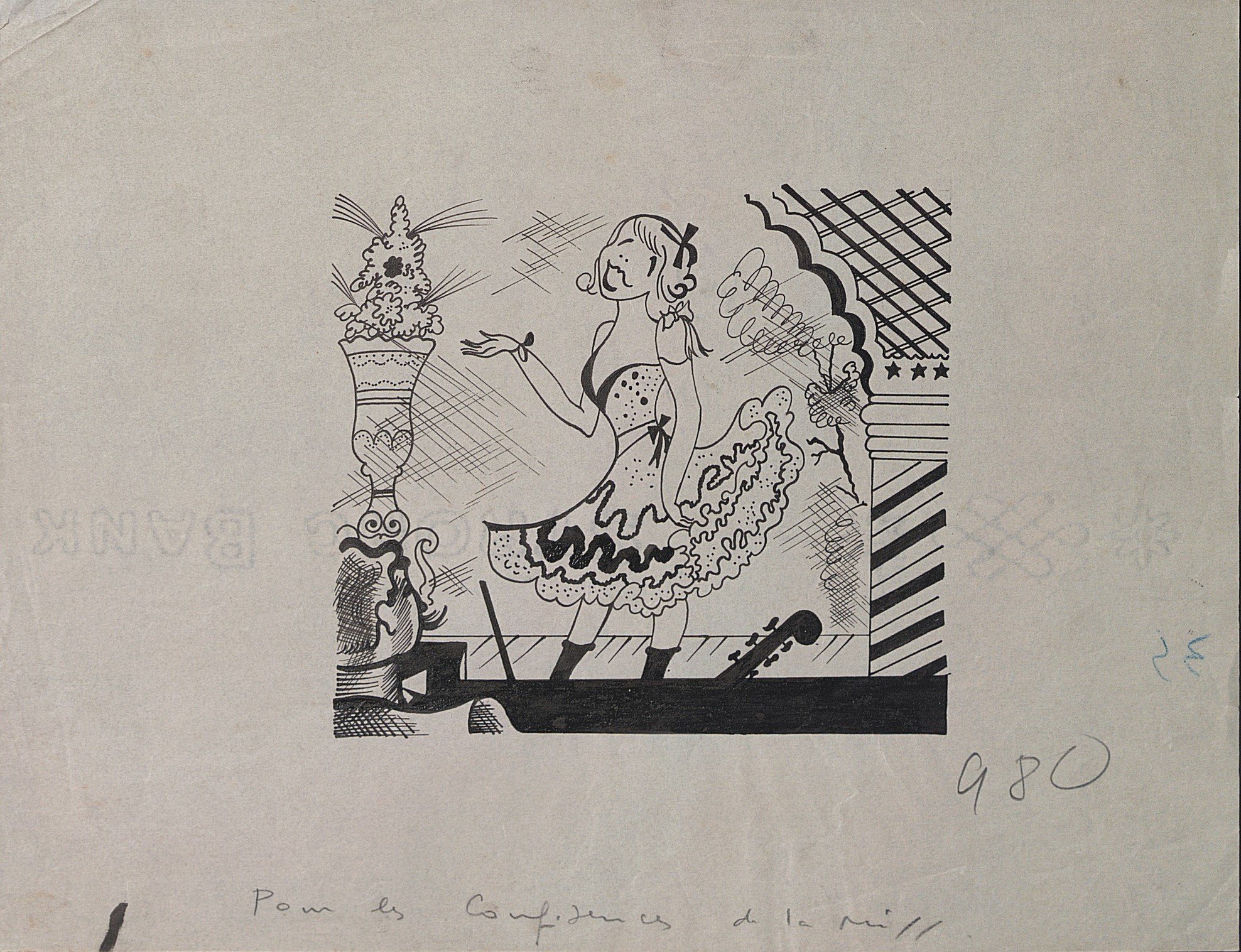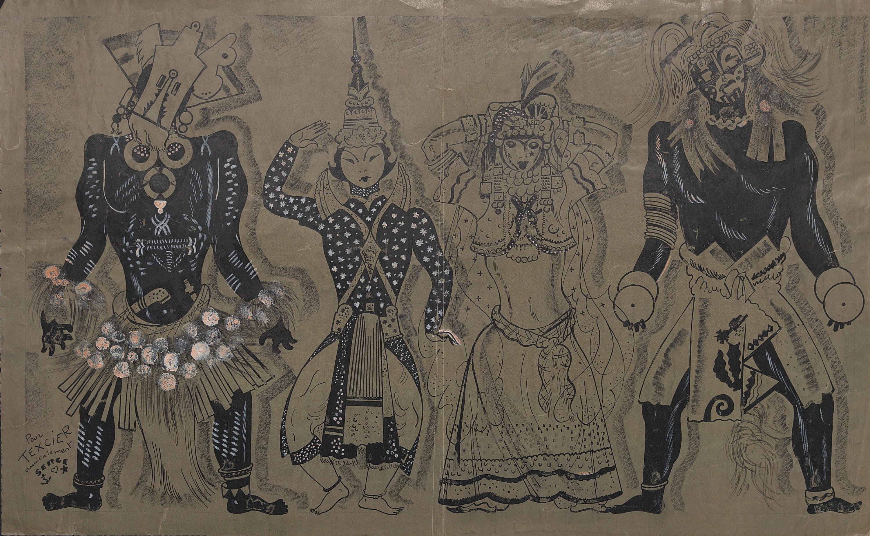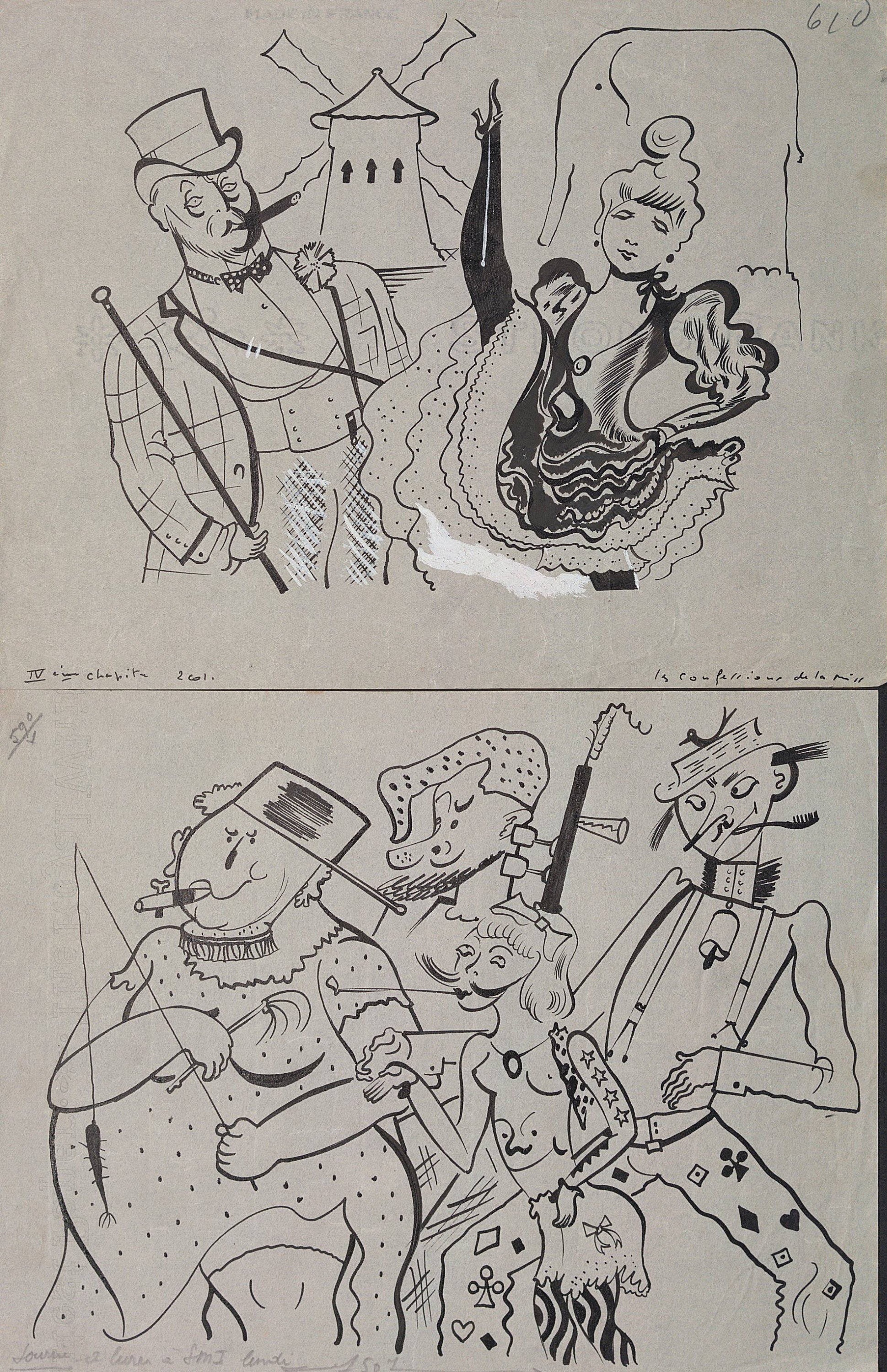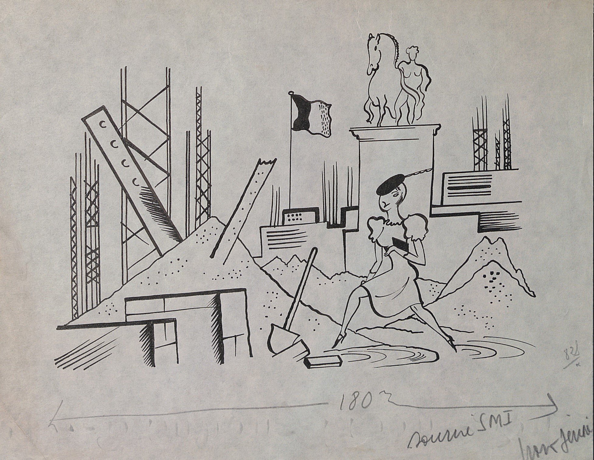 Dessin à l’encre et gouache, signé en bas à gauche, dédicacé « Pour Texcier amicalement » [Jean Texcier, illustrateur et journaliste], 45 x 27,5 cm (petites déchirures) ;