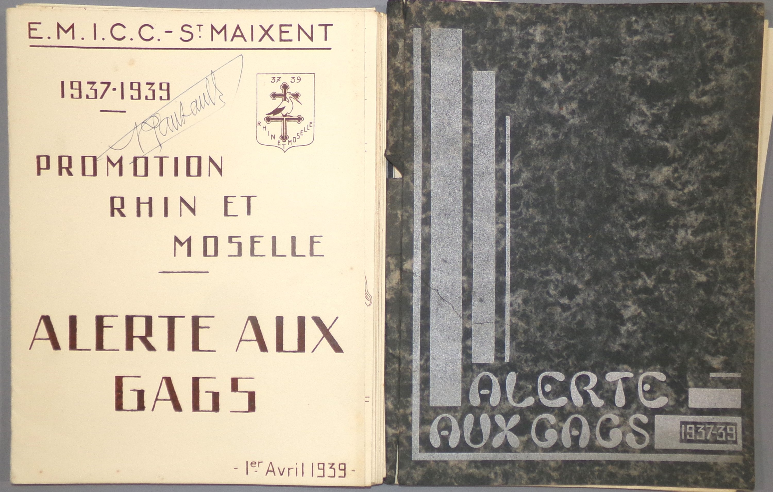 « EMICC St Maixent 1937-1939 Promotion Rhin et Moselle Alerte aux gags », 1er avril, 1939, in-4 broch., 29 pl. imp. en mono-couleur ; autre exemplaire incomplet (25 pl.).