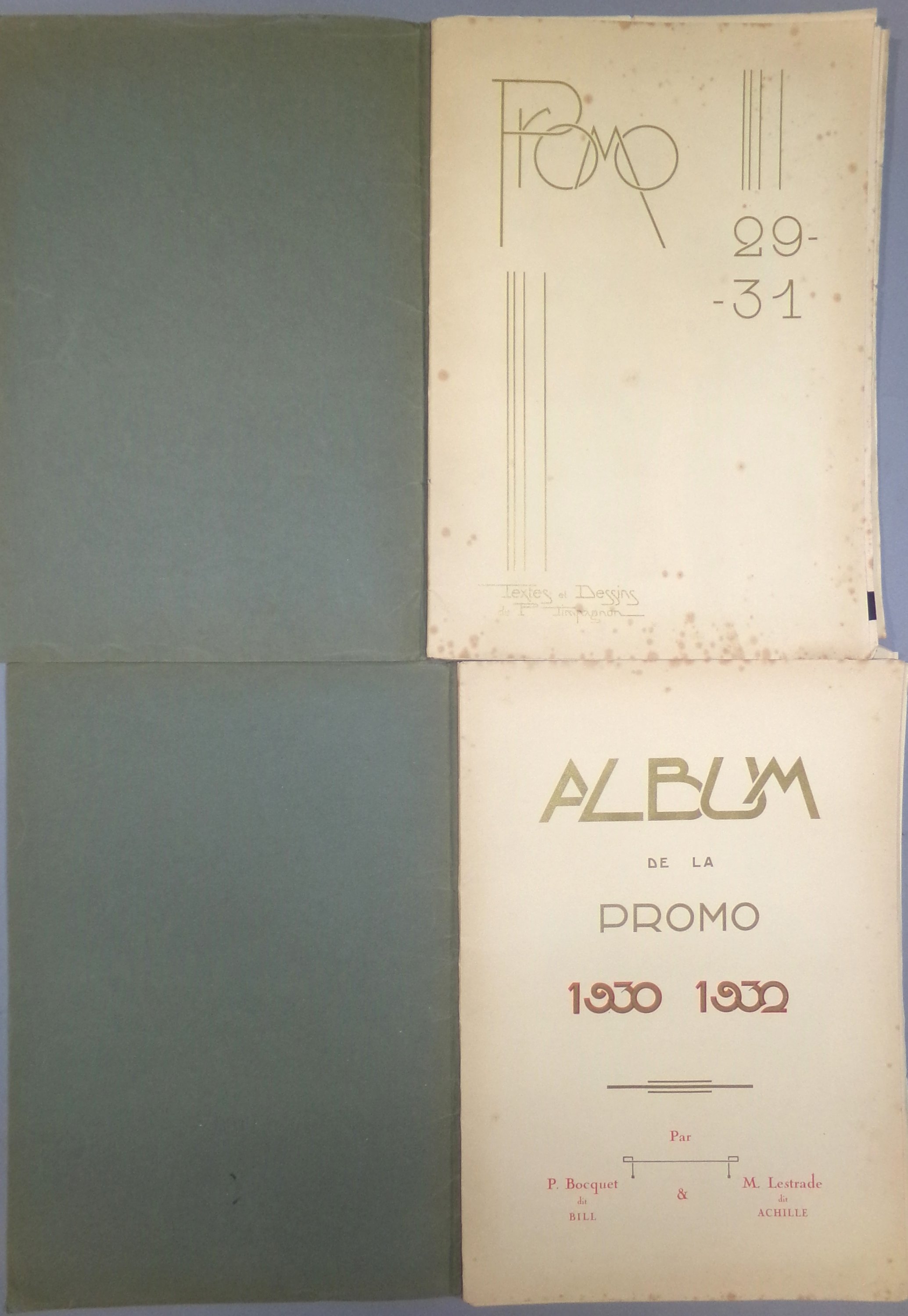 « Vu à l’E.M.I.C.C. Album de la promo 1930-1932 par P. Bocquet dit Bill & M. Lestrade dit Achille », in-fol. broch., 27 pl. de caricatures imp. en noir et en couleurs (déchirure à une pl.) ; autre exemp. incomplet ;