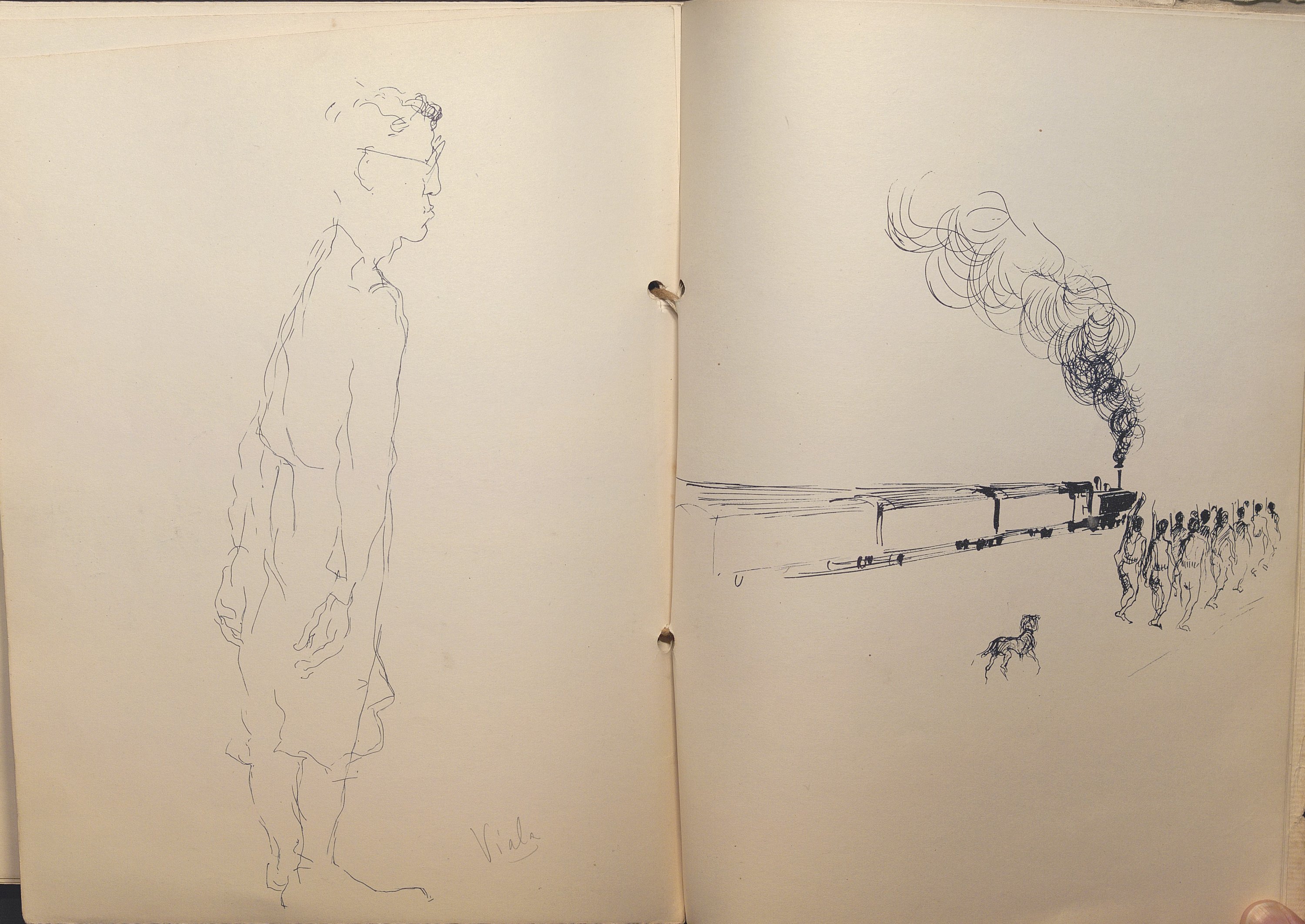 Joint : cahier 86 pp. in-4, portaits dessinés à l’encre d’officiers et de soldats, en majorité identifiés par le nom de famille ajouté au crayon, années 1930-1940 : Dugoujard, d’Escayrac, Claude d’Aumale, Caminade, Miranval, Dreyfus, etc. Régiment à identifier.