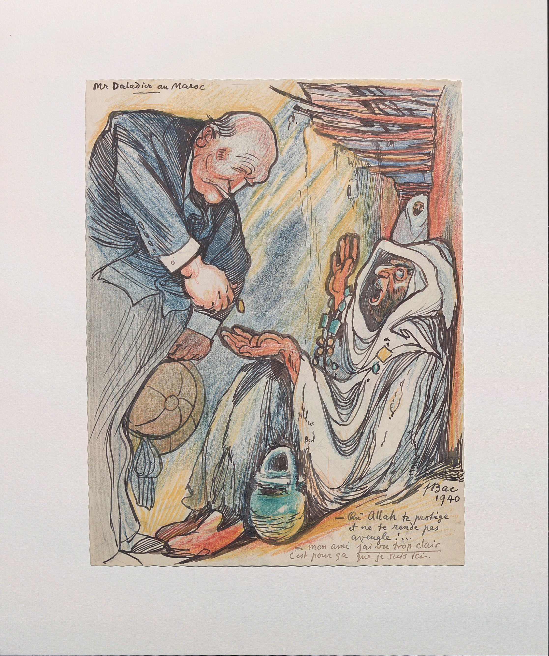 4 dessins relatifs au séjour au Maroc en juin et juillet 1940 d’Edouard Daladier, ancien président du Conseil, encre, aquarelle, gouache et crayons de couleurs, sur papier contrecollés sur carton, tous signés, datés « 1940 » et légendés, 27 x 21 cm ; face à la débâcle de l’armée française, 27 parlementaires décident de quitter la France en juin 1940 à bord du paquebot le Massilia pour rejoindre Casablanca au Maroc. De retour en France au début d’août 1940, Daladier est arrêté par le gouvernement de Vichy et transféré à Buchenwald ;