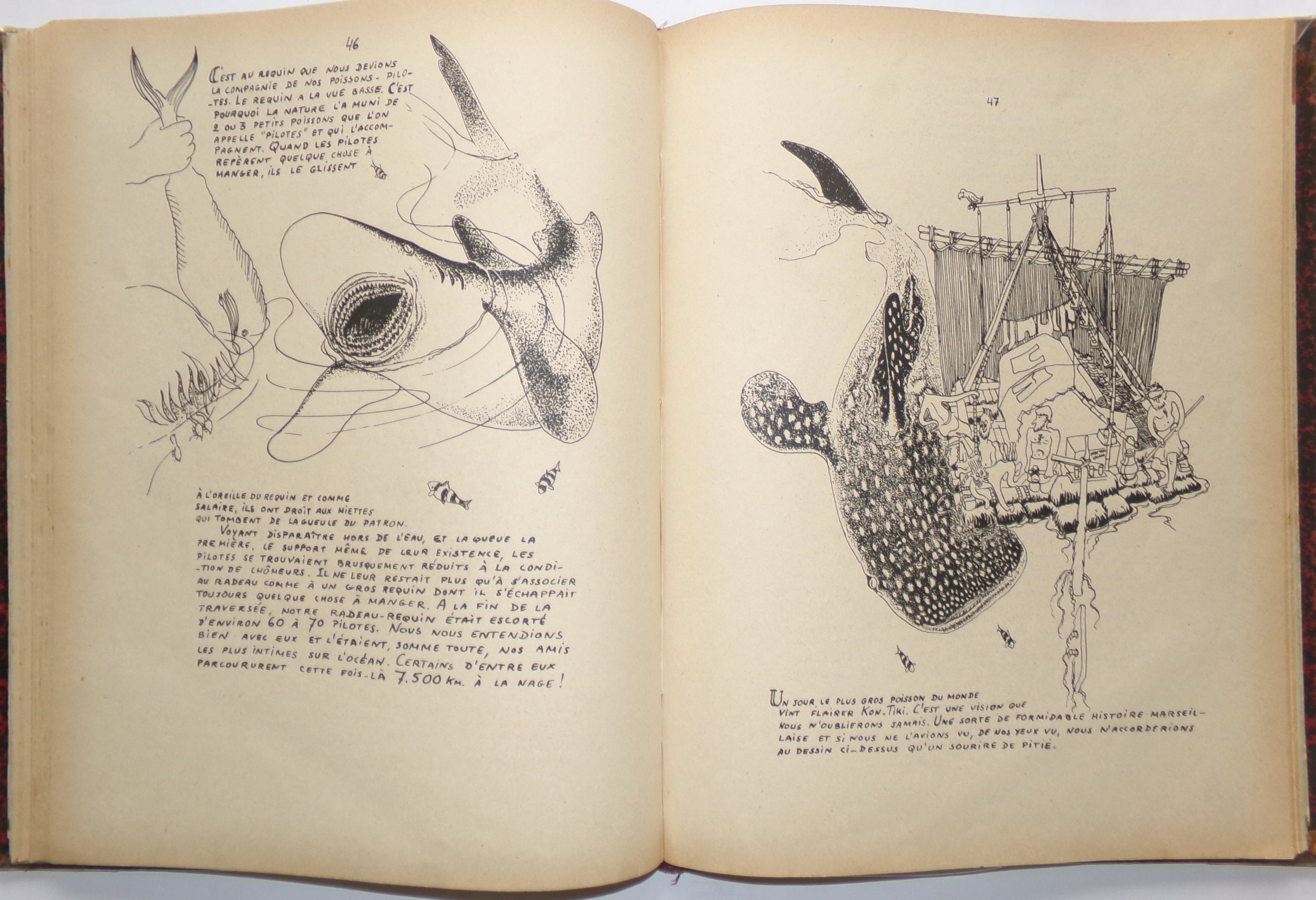 Hesselberg Erik, ?Les compagnons du Kon-Tiki. Julliard, 1951. Grand in-4 br. Illustré à toutes pages par l'auteur-navigateur, qui participa à l'expédition (et qui a dessiné le visage du dieu Kon-Tiki sur la voile du radeau). Récit illustré de ce périple sur un radeau, par laquelle l'anthropologue norvégien Thor Heyerdahl voulait vérifier l'hypothèse de l'exploration inca de l'océan Pacifique ;