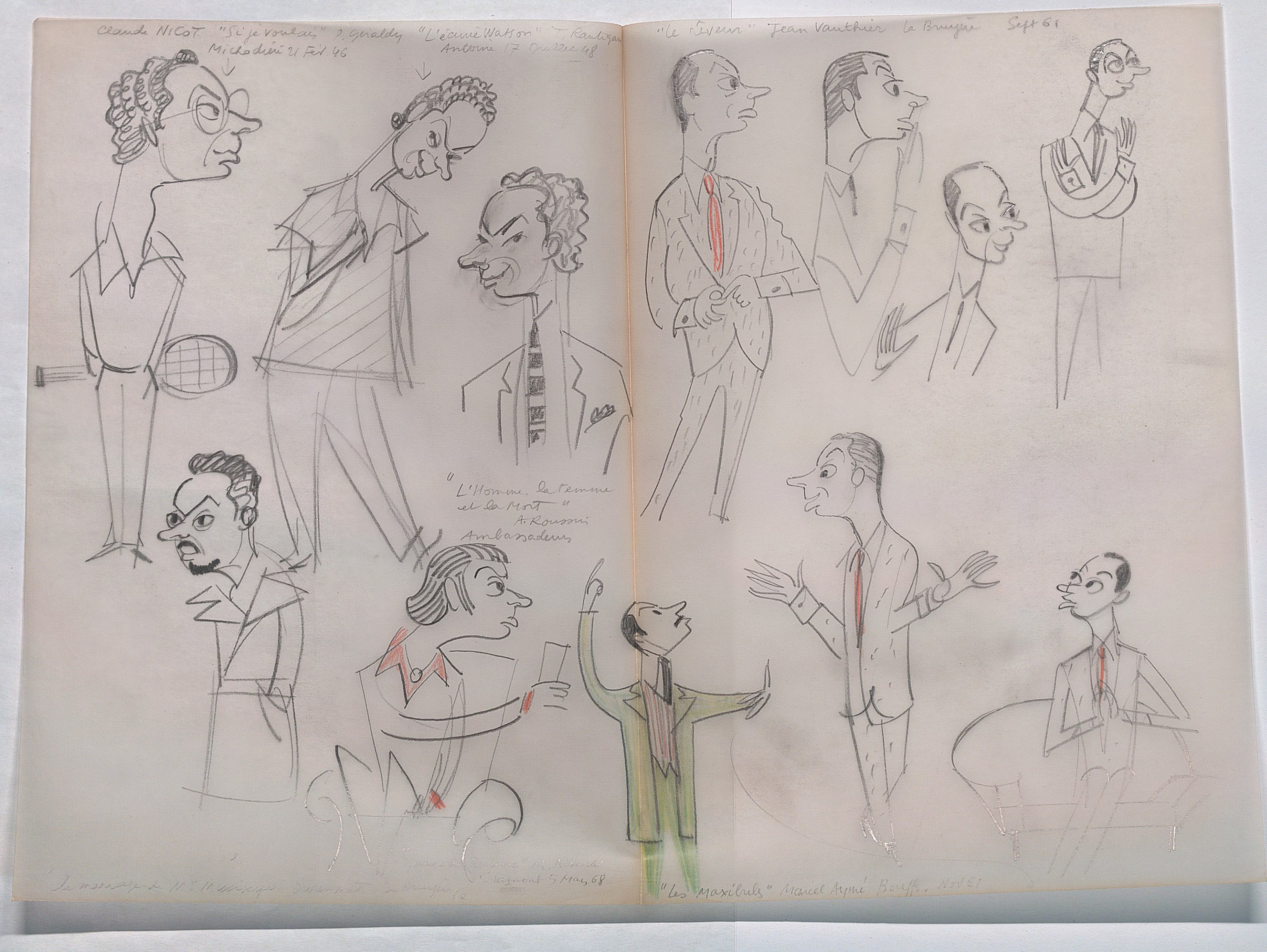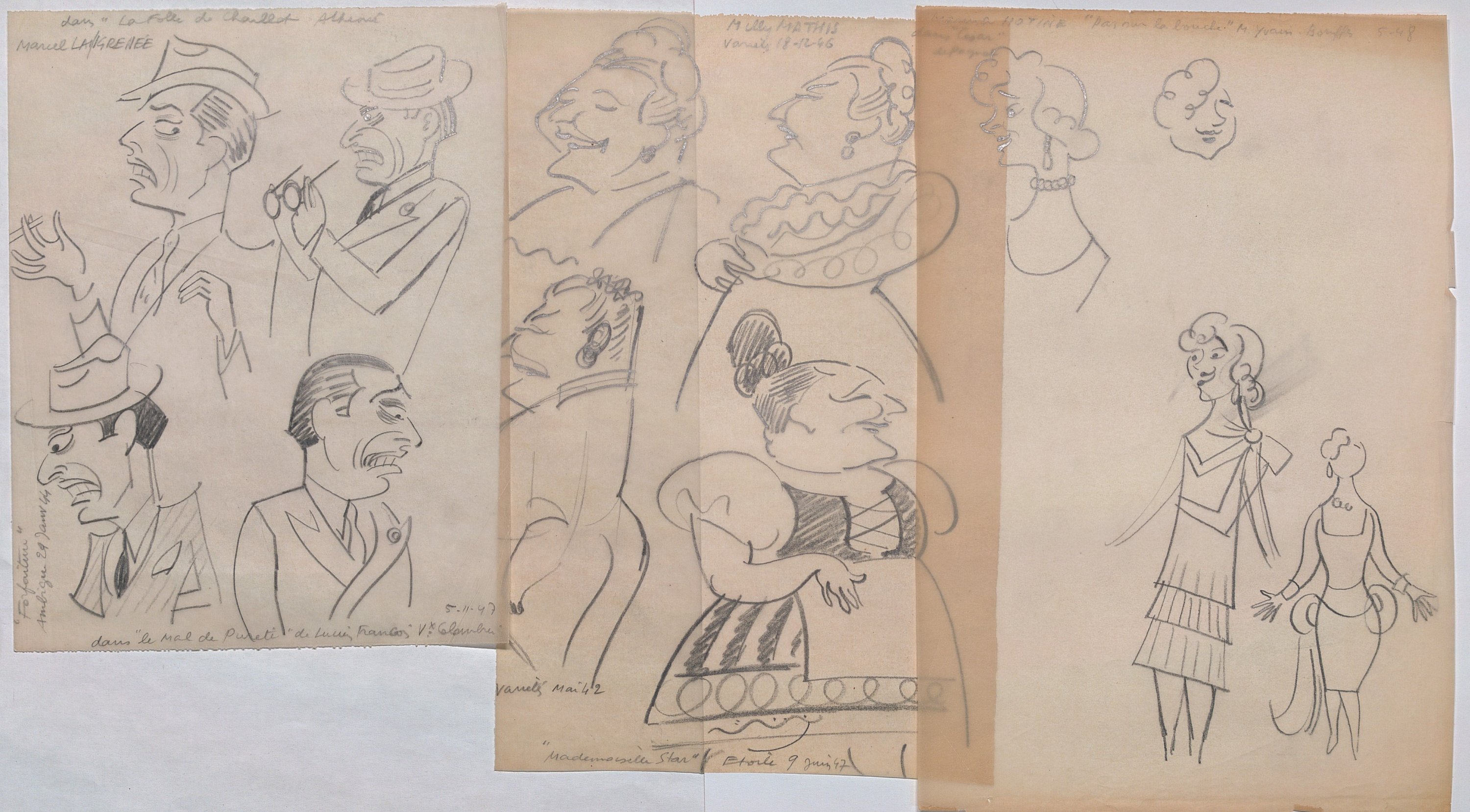 La plupart des croquis caricaturent des comédien/nes en représentation dans les théâtres parisiens (Michodière, Vieux Colombier, Capucines, La Coupole, Madeleine, Marigny, Renaissance, Folies bergères, Montparnasse, Mathurins, Athénée, etc).