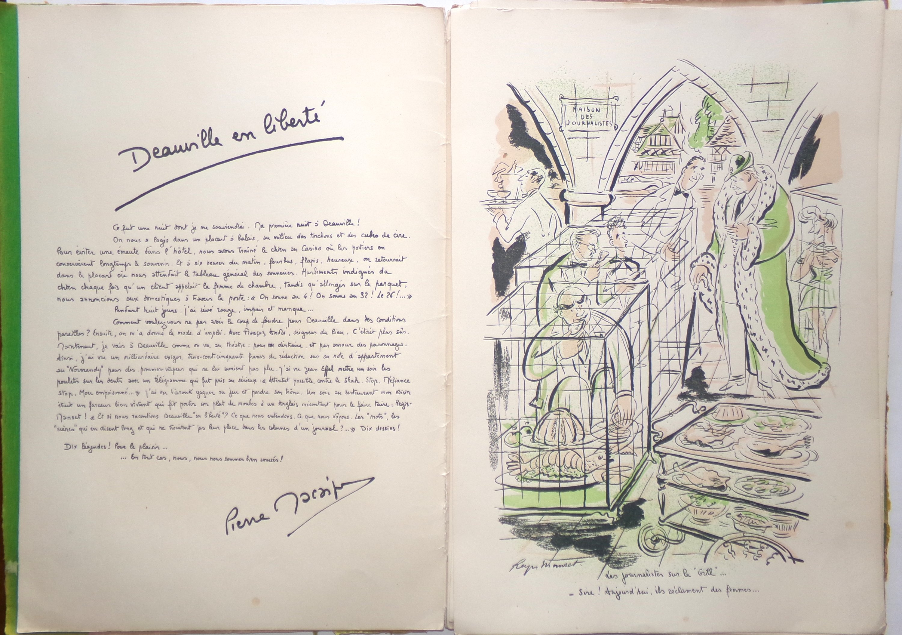Deauville en liberté, dessins de Régis Manset, avant-propos et légendes de Pierre Macaigne, [1950]. Album in-fol. contenant une suite de 10 lithographies en couleurs illustrant des scènes de la vie mondaine deauvillaise (hôtel le Royal, Le Privé, Le Carioca, le pesage sur le champ de courses de chevaux, le Golf, le Brummel, maison des journalistes, le Bar du Soleil). n°118/1950. Incomplet, couv. en l’état.